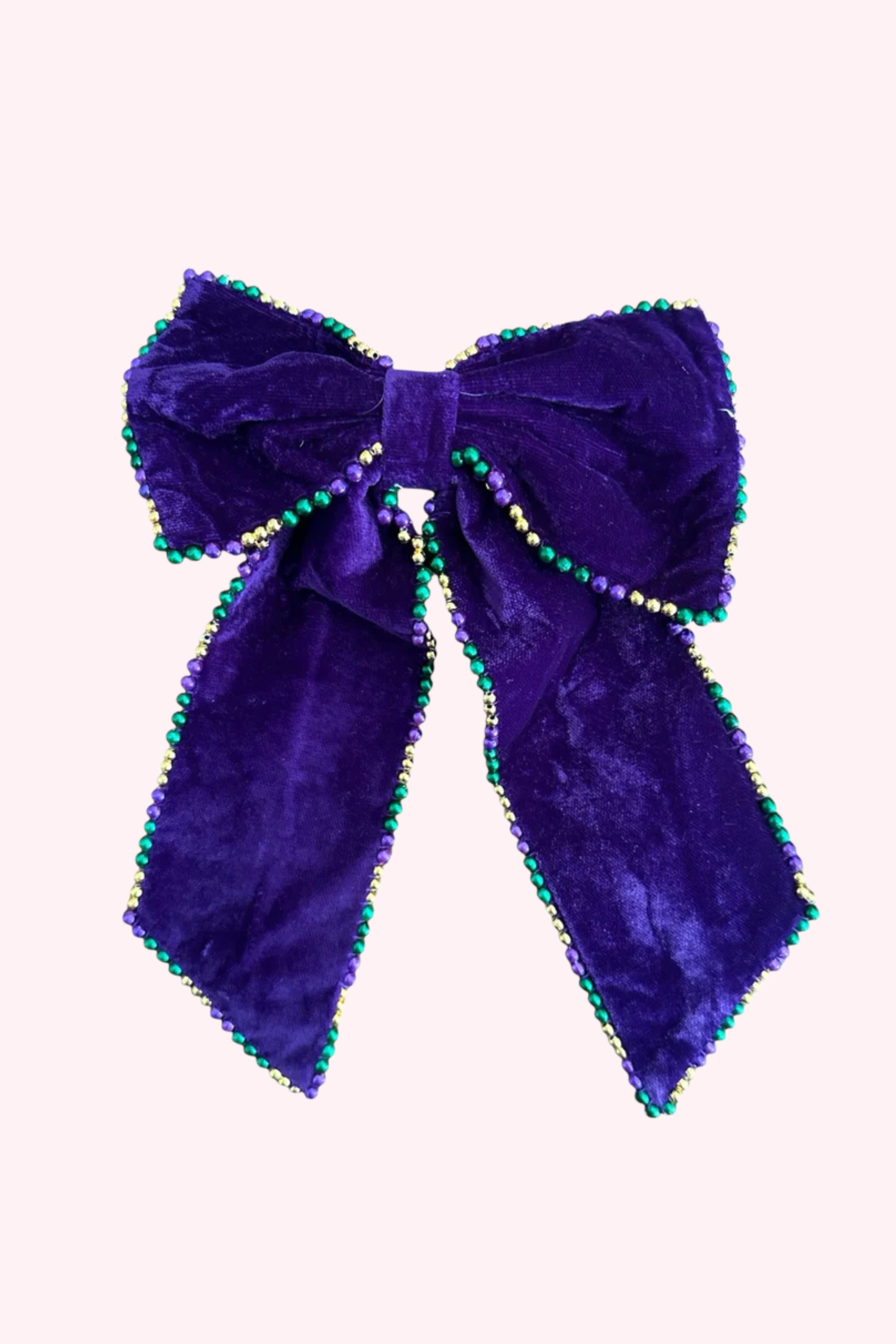 Celebrate Mardi Gras in bold, festive style with this Mardi Gras Velvet Bow. Crafted from rich purple velvet, this statement bow features flowing tails and is beautifully trimmed with classic Mardi Gras bead accents in purple, green, and gold for a fun, eye-catching finish.
