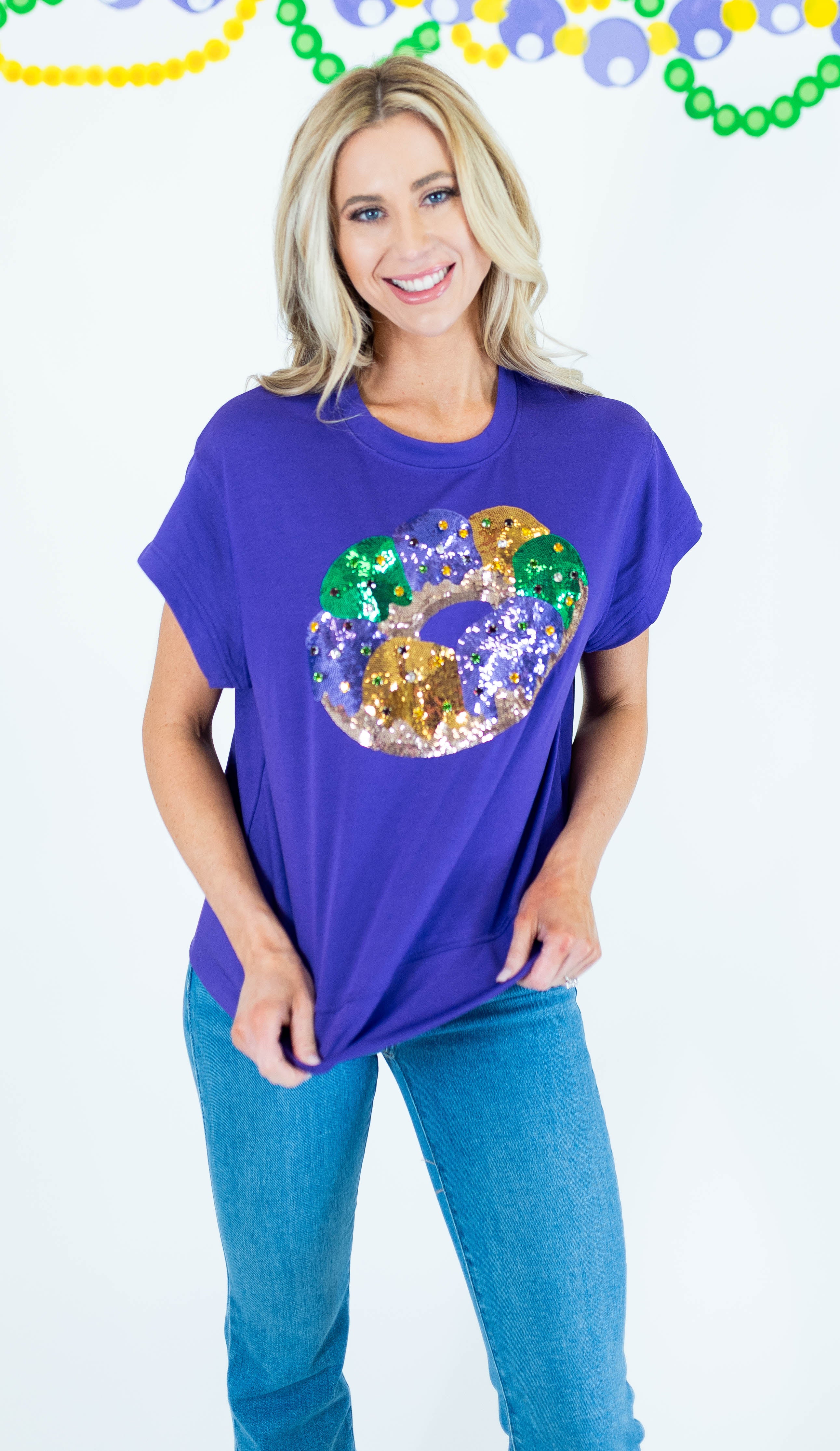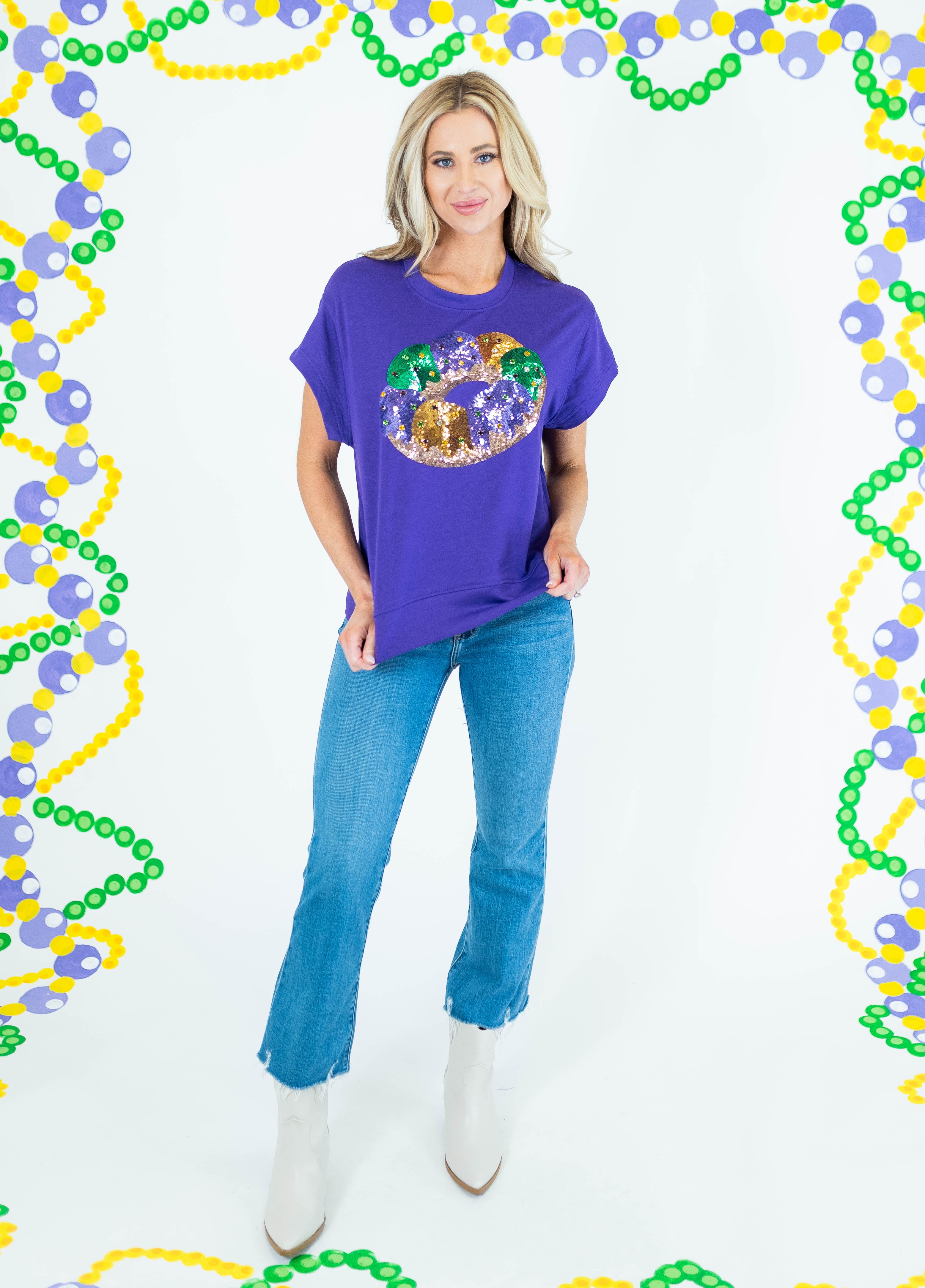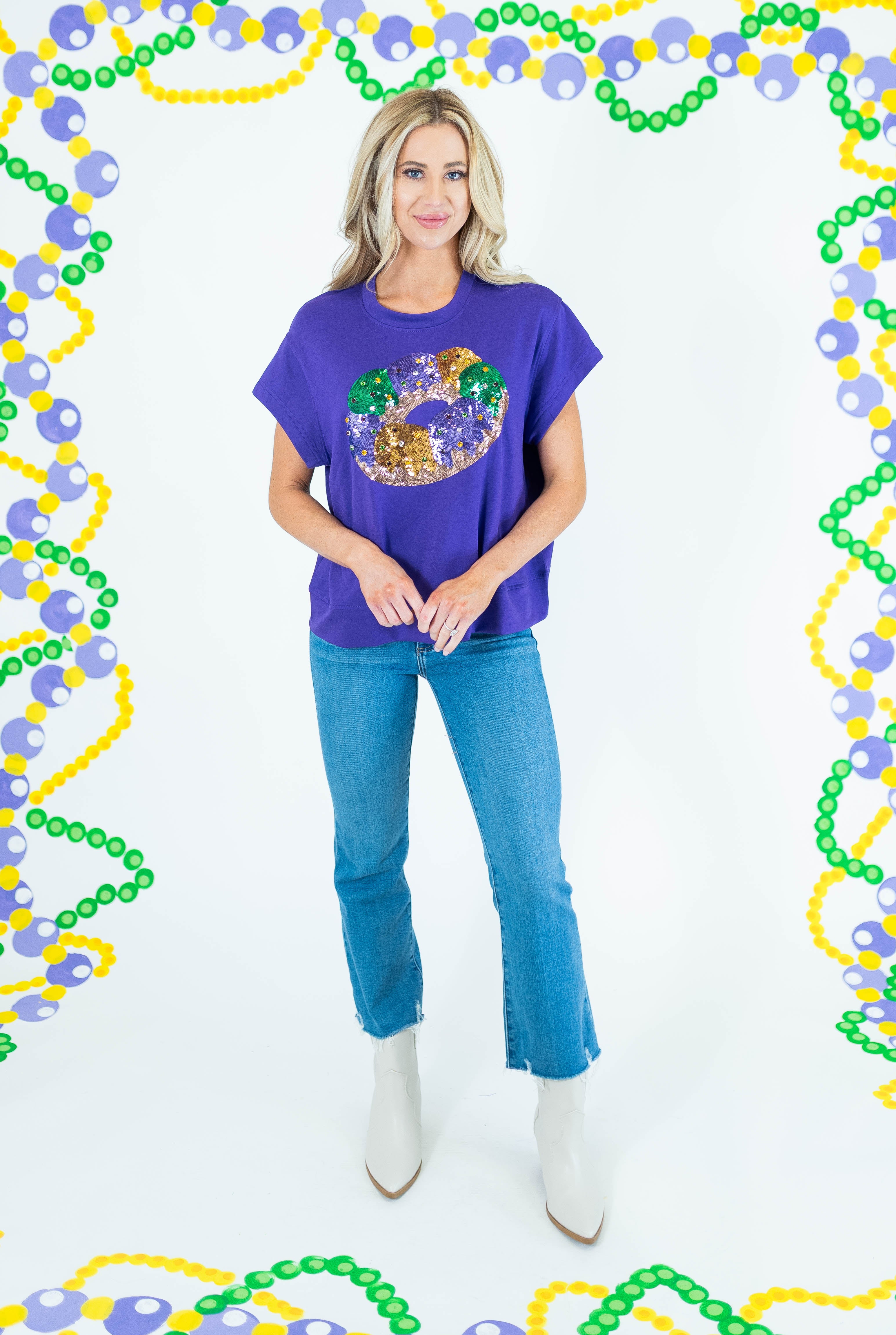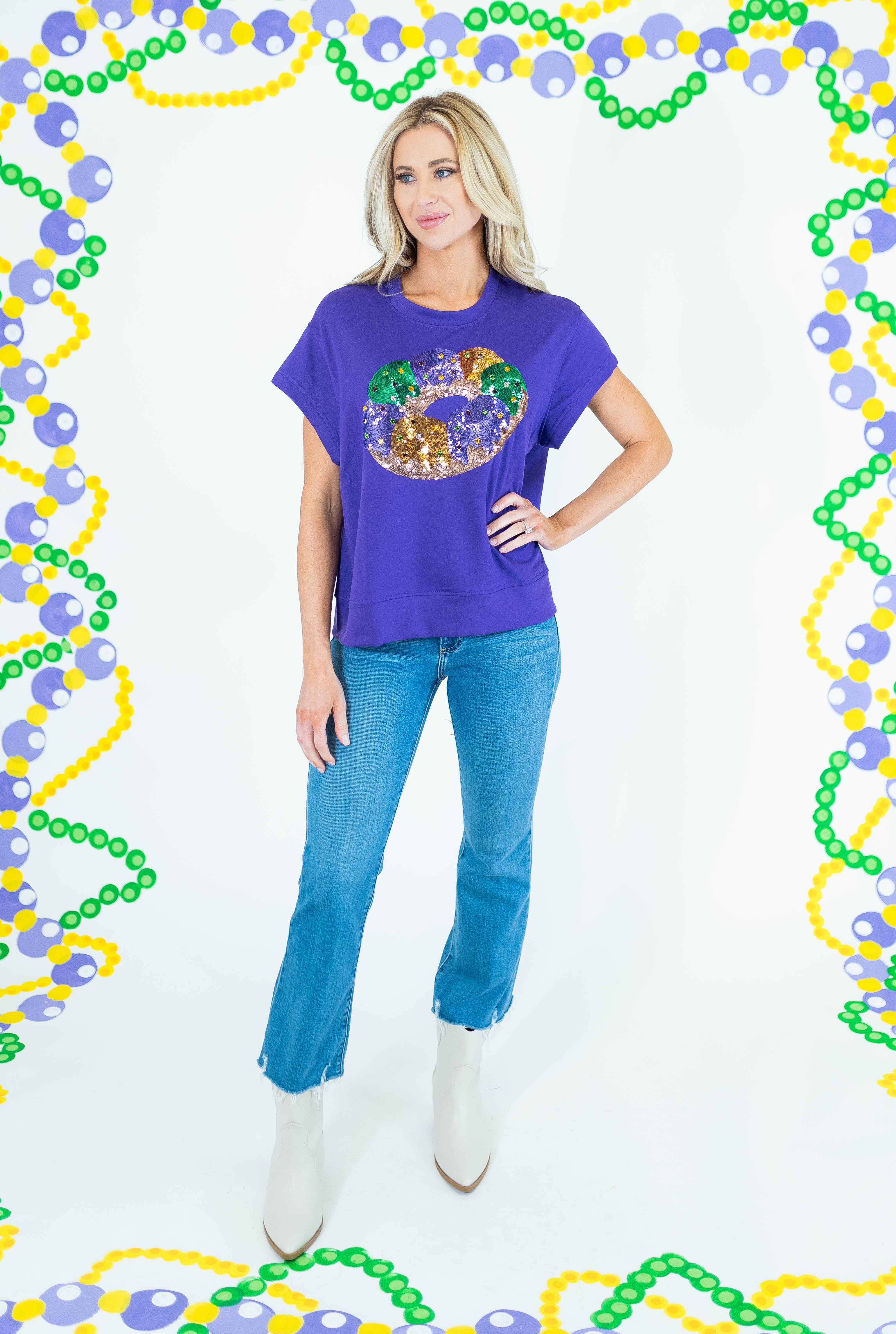 Elevate your festive wardrobe with the King Cake Emily Sequin Top in Purple. This eye-catching piece features shimmering sequins that catch the light with every movement, making you the center of attention at any celebration. The vibrant purple hue brings a bold, luxurious feel perfect for holiday parties, special events, or nights out. Crafted for comfort and style, this top pairs effortlessly with your favorite bottoms for a look that's both glamorous and wearable. Stand out and shine in this statement-making essential.