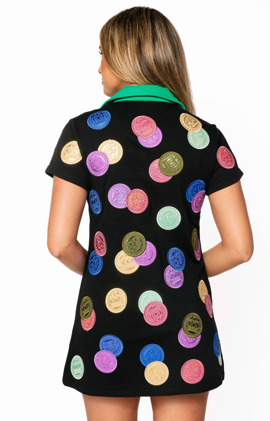 Celebrate Mardi Gras in show-stopping style with this Queen Of Sparkles black dress featuring a stunning multi-colored doubloons collar. The eye-catching collar design brings festive flair and playful elegance, while the short sleeves keep you comfortable throughout the season. Perfect for parades, parties, and special occasions, this dress combines bold statement-making details with wearable sophistication. Whether you're catching beads or turning heads, this piece delivers the sparkle and personality your wardrobe deserves.