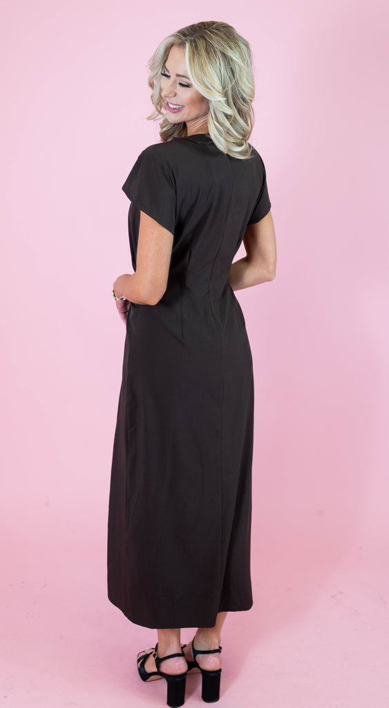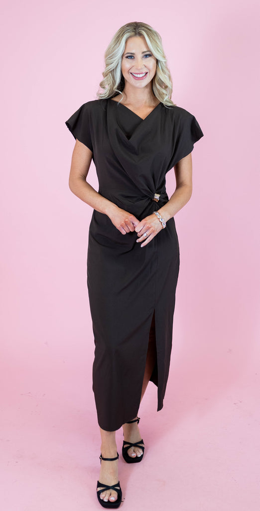 Elevate your wardrobe with the Sienna Draped Midi Dress in black, brown and hunter green. Its elegant draped silhouette flatters every figure, while the midi length adds a timeless touch. Perfect for both sophisticated evenings and stylish daytime events, this dress combines comfort with effortless chic. Designed to make you feel confident and graceful, the Sienna is a versatile staple that enhances your natural allure.