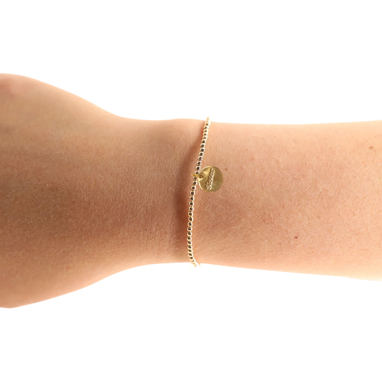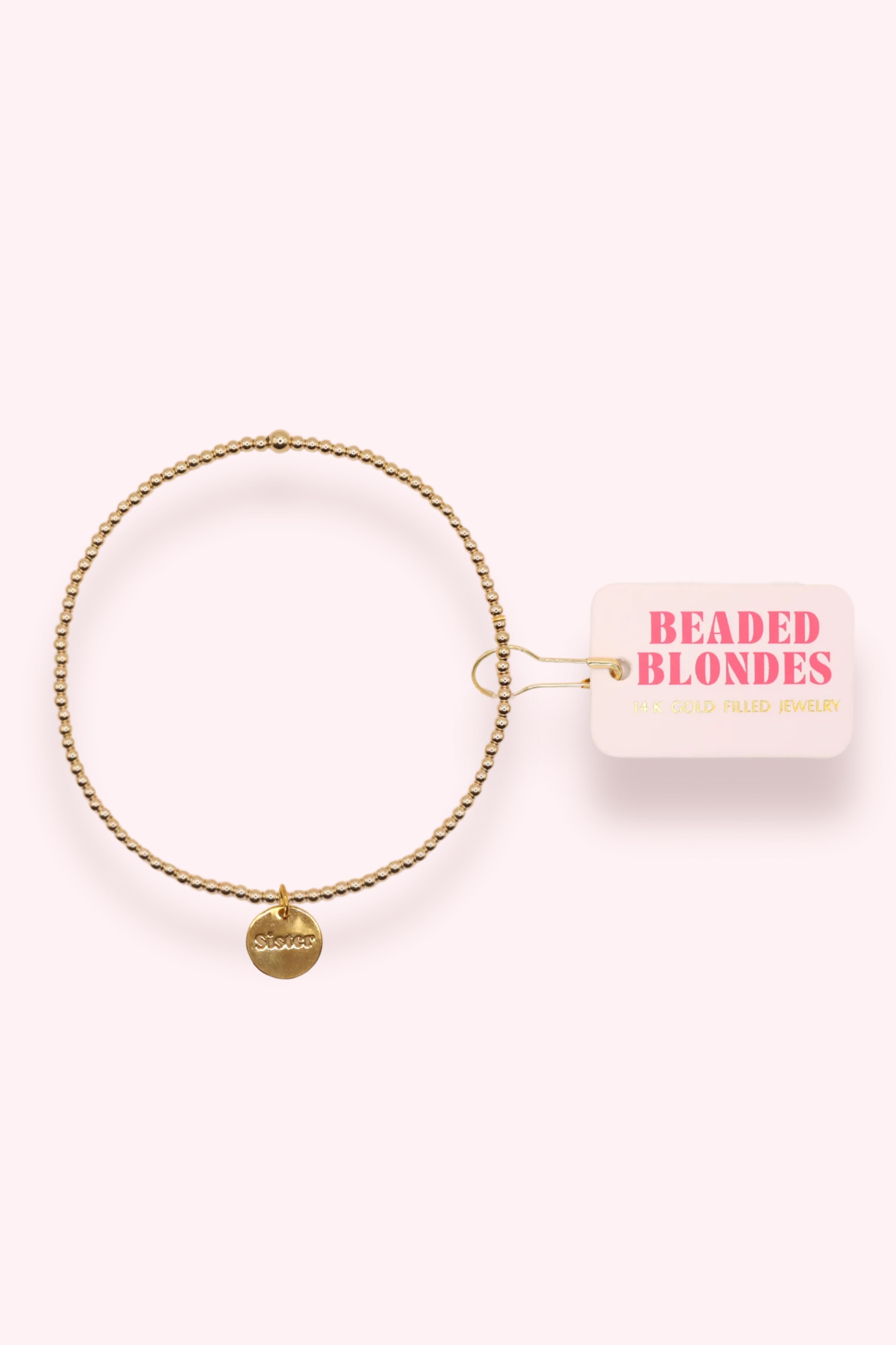 2MM gold beaded stretch bracelet with gold Sister Coin charm.