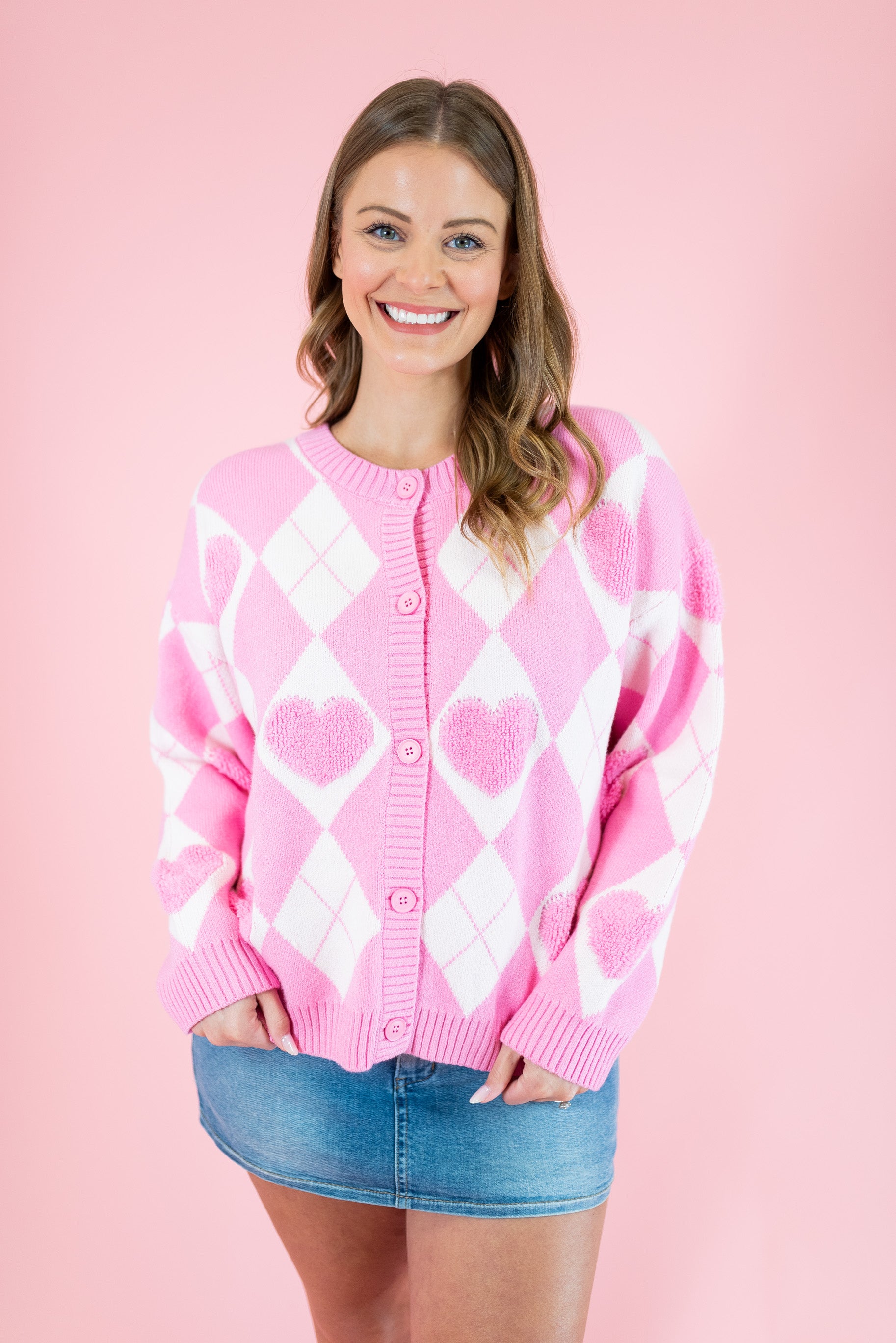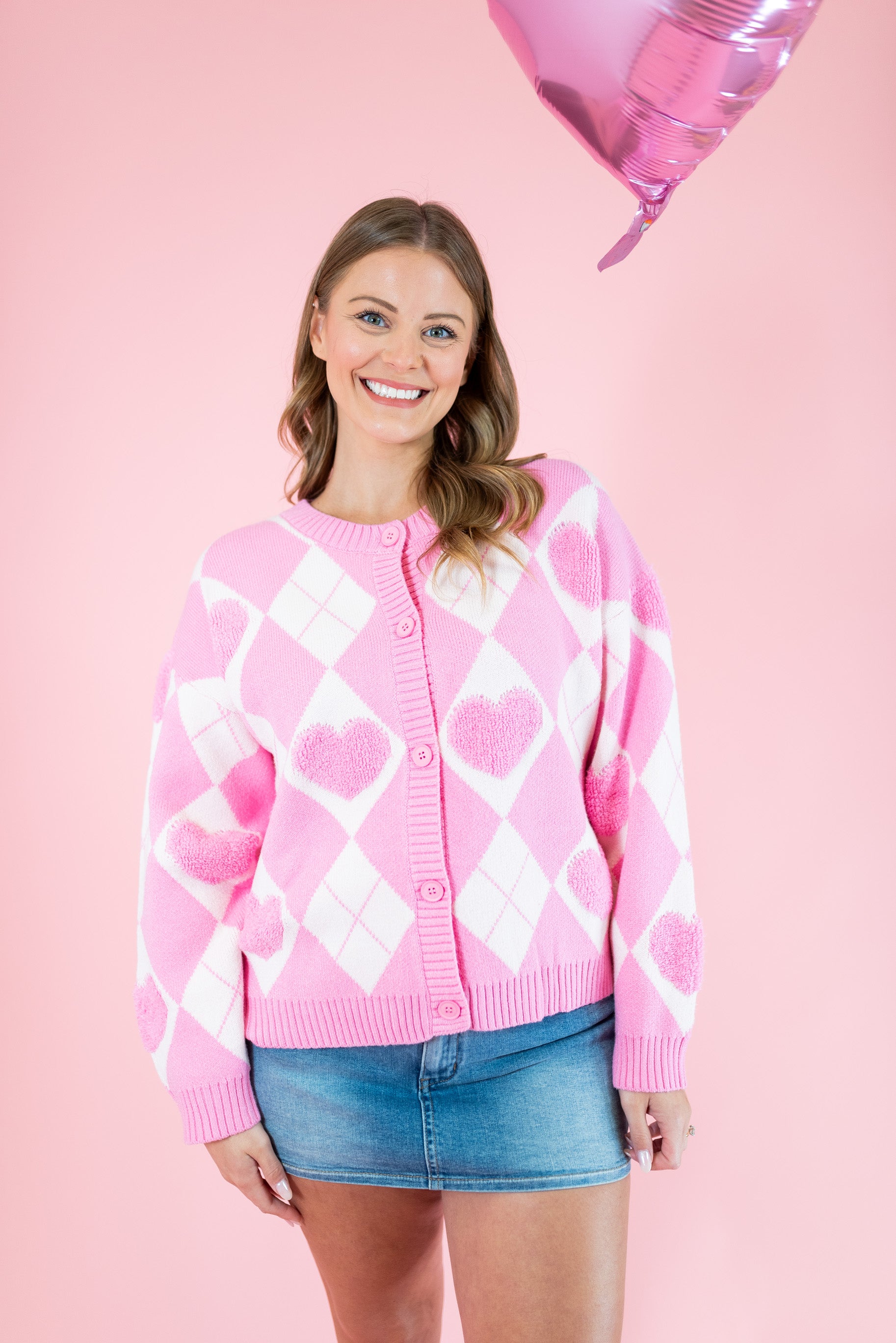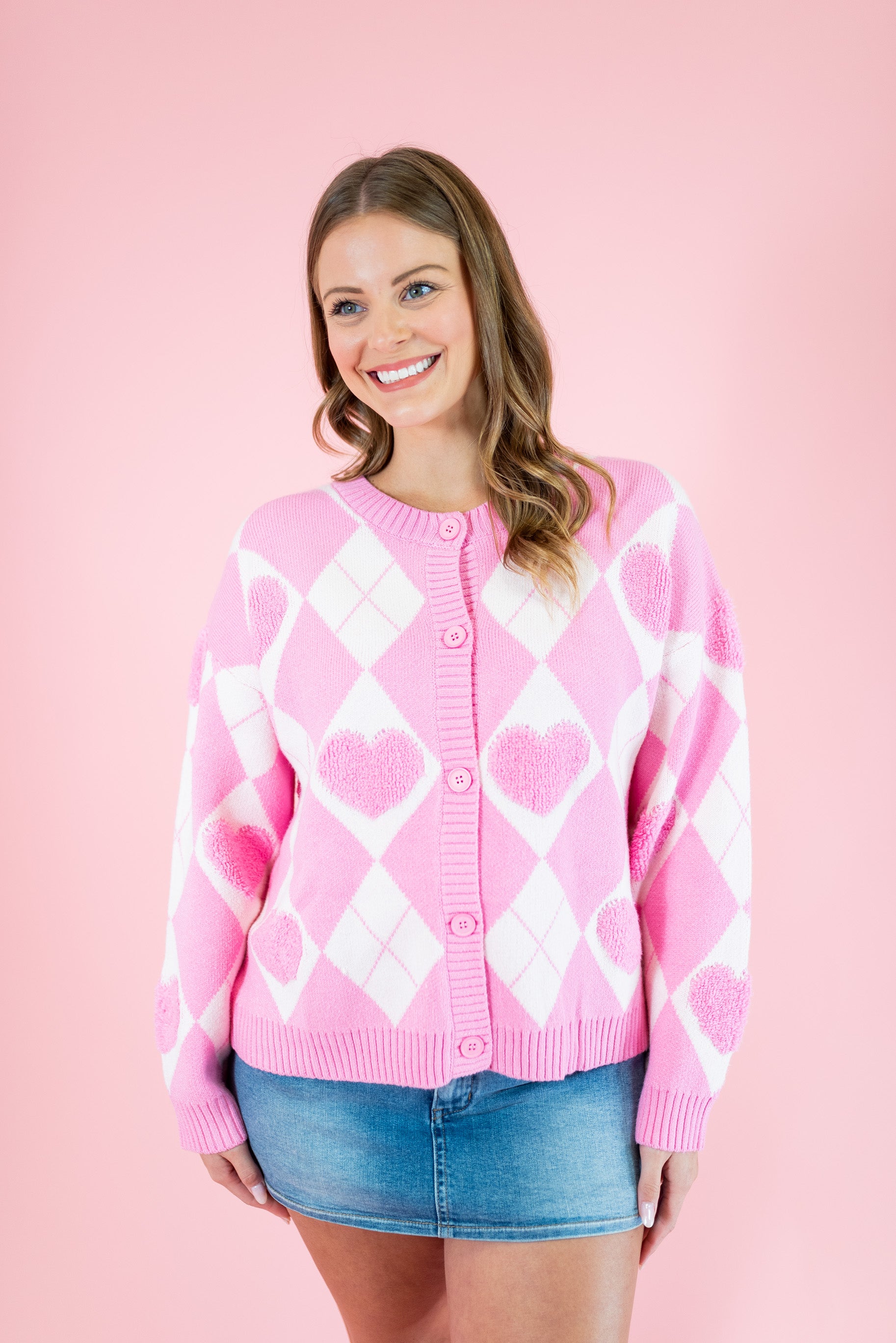Wrap yourself in romance this Valentine's Day with our Heart Diamond Cardigan in soft pink. Featuring an enchanting heart-patterned diamond knit, this cozy layer brings playful charm to any outfit. Perfect for expressing your sweetest side, whether you're celebrating love or simply embracing the season's most romantic hue. Lightweight yet warm, it's the ideal piece for February date nights or casual everyday wear that radiates affection.