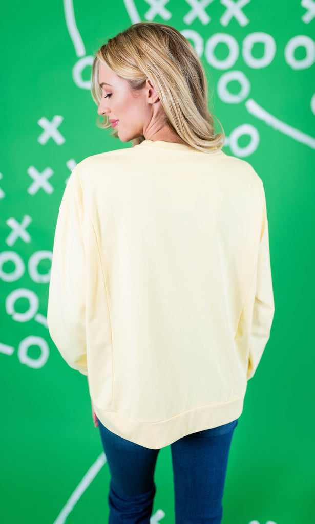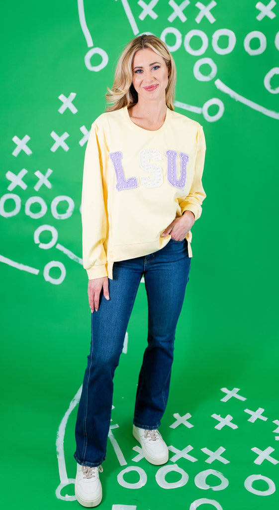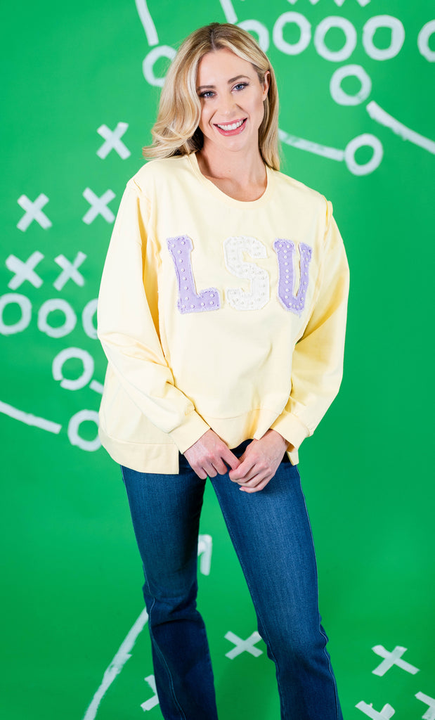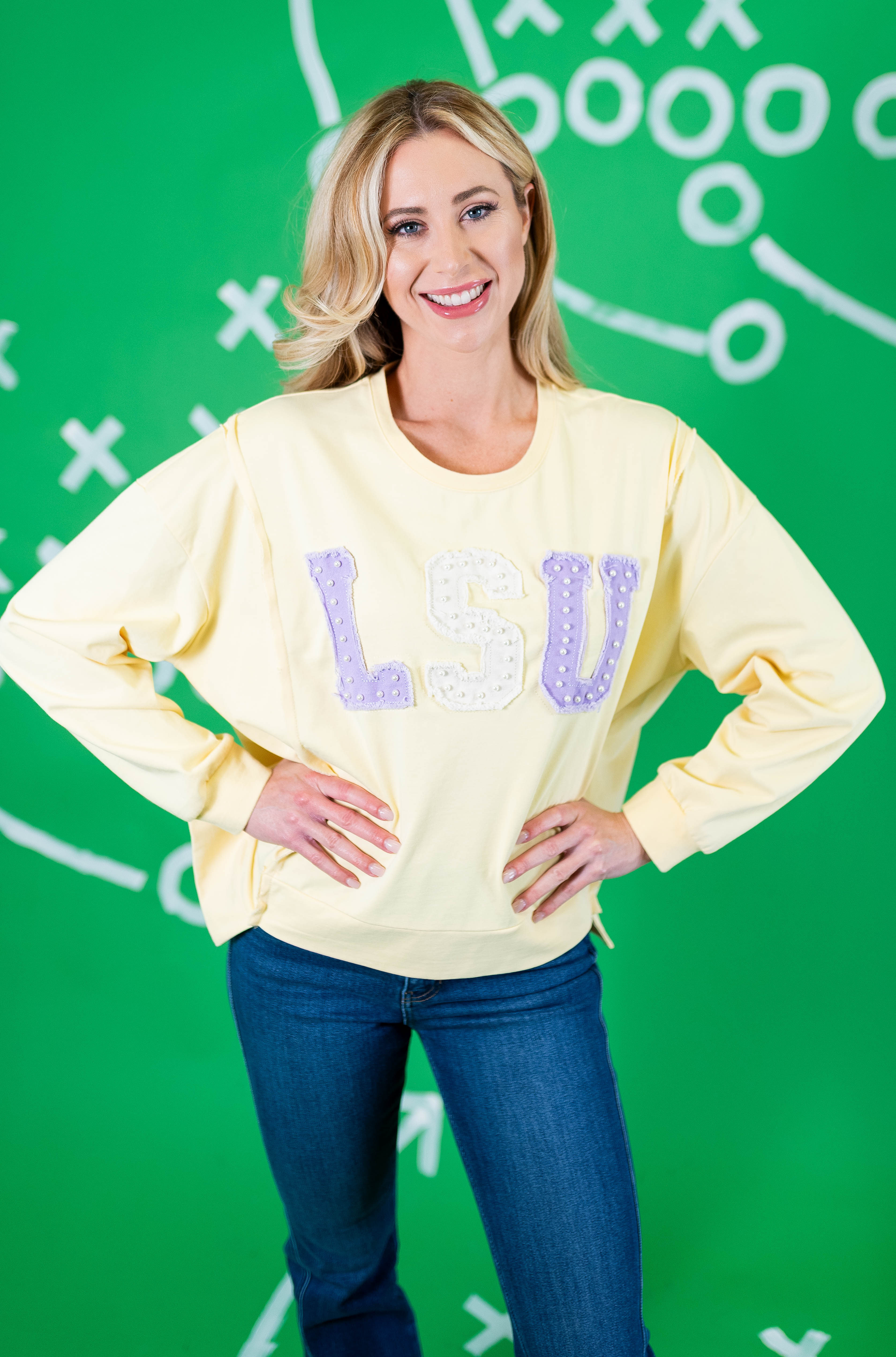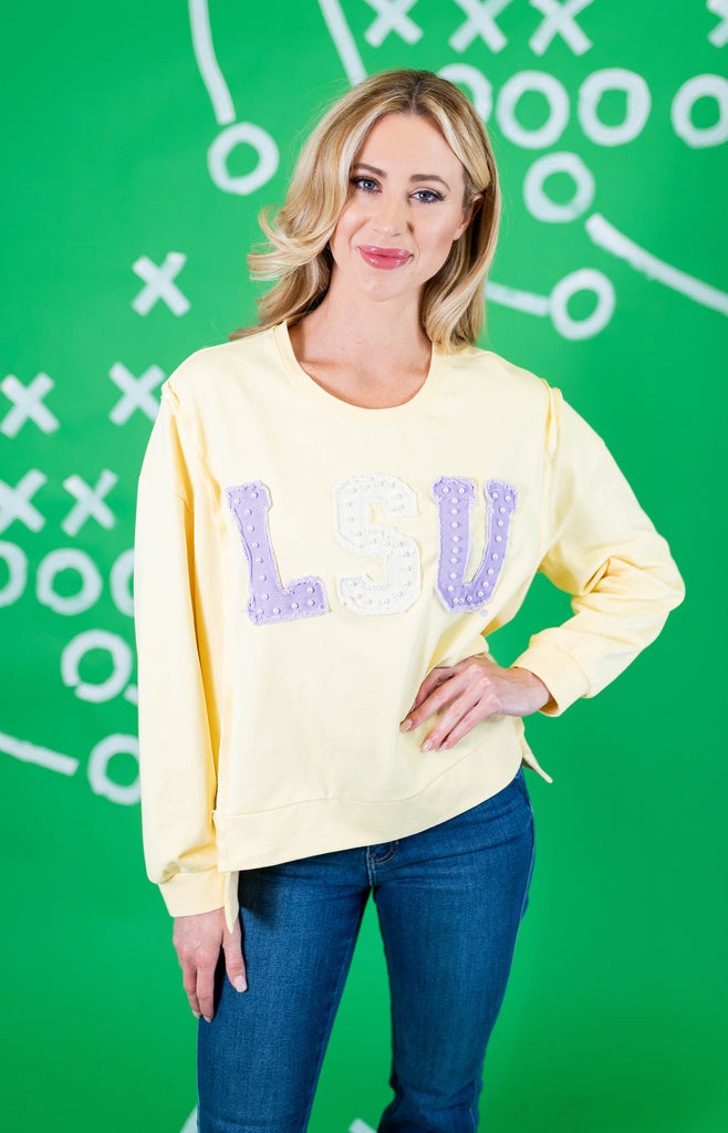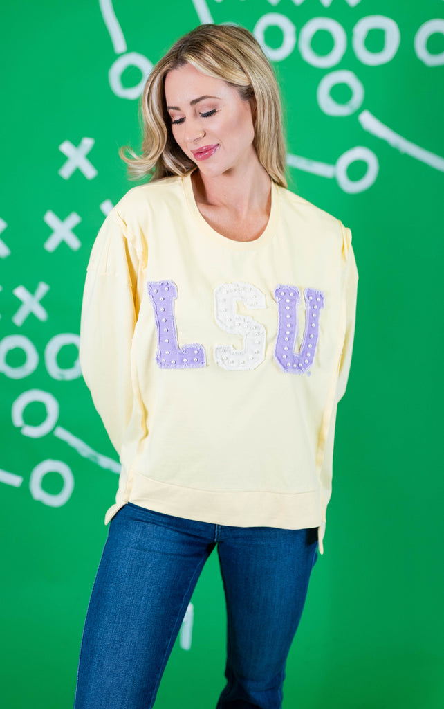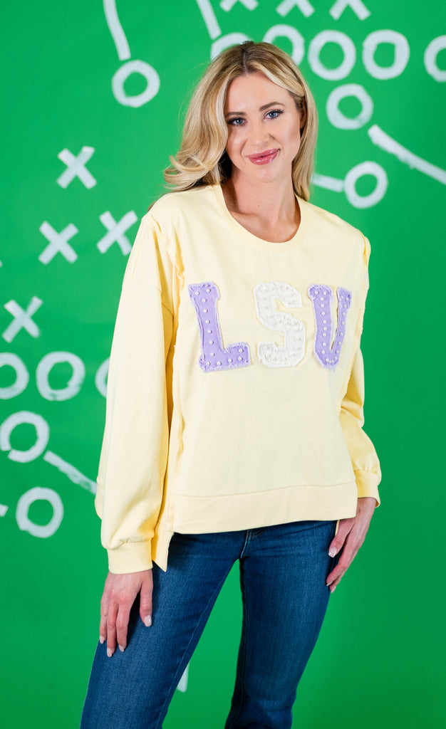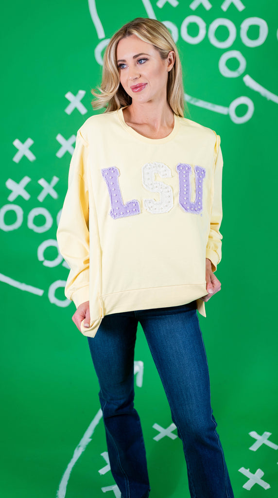 Callin' all LSU Fans! Stay comfy and cute in our distressed embroidery pullover, featuring beautiful pearl embellishments and alternating lavender and off-white lettering.