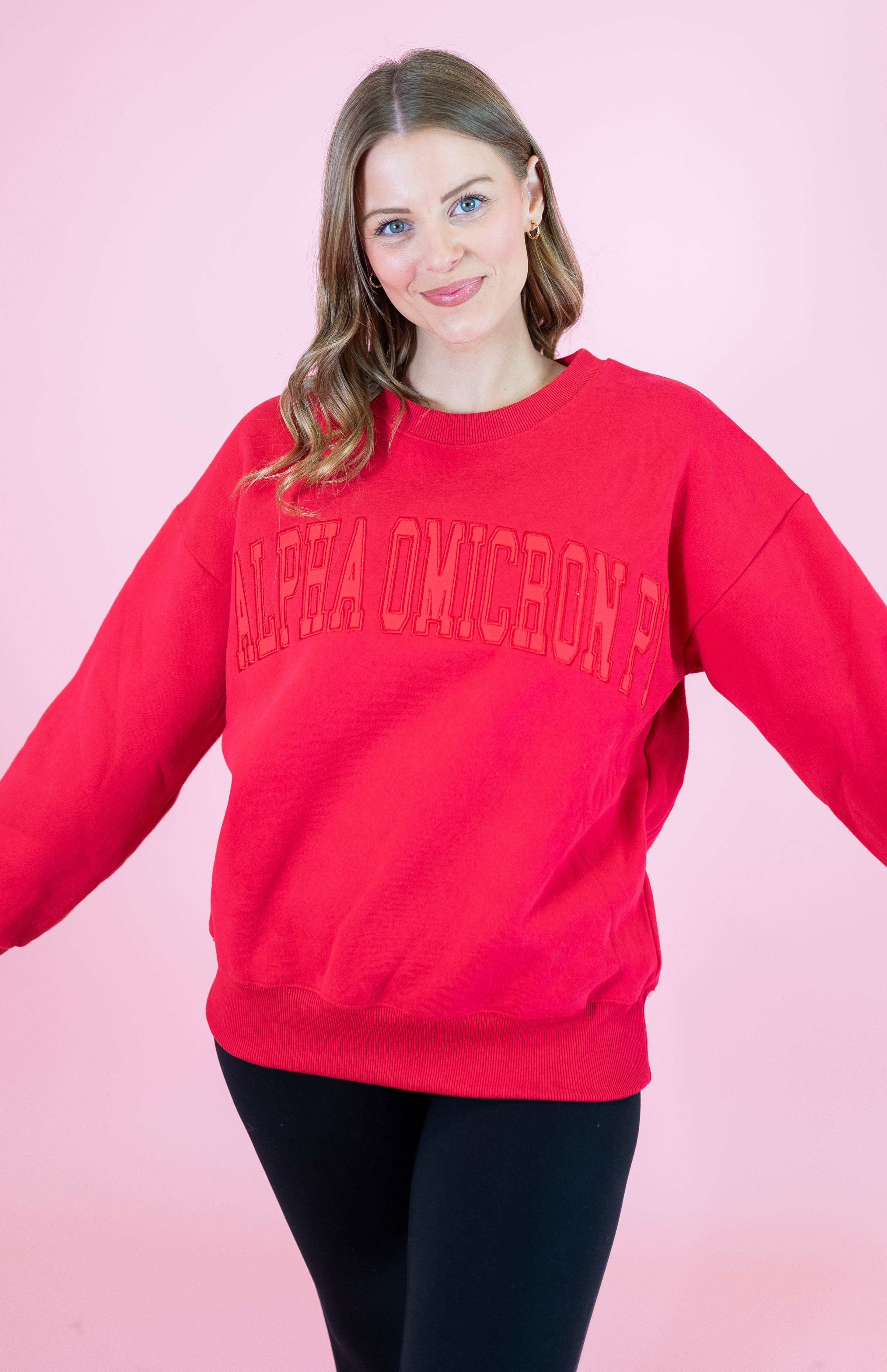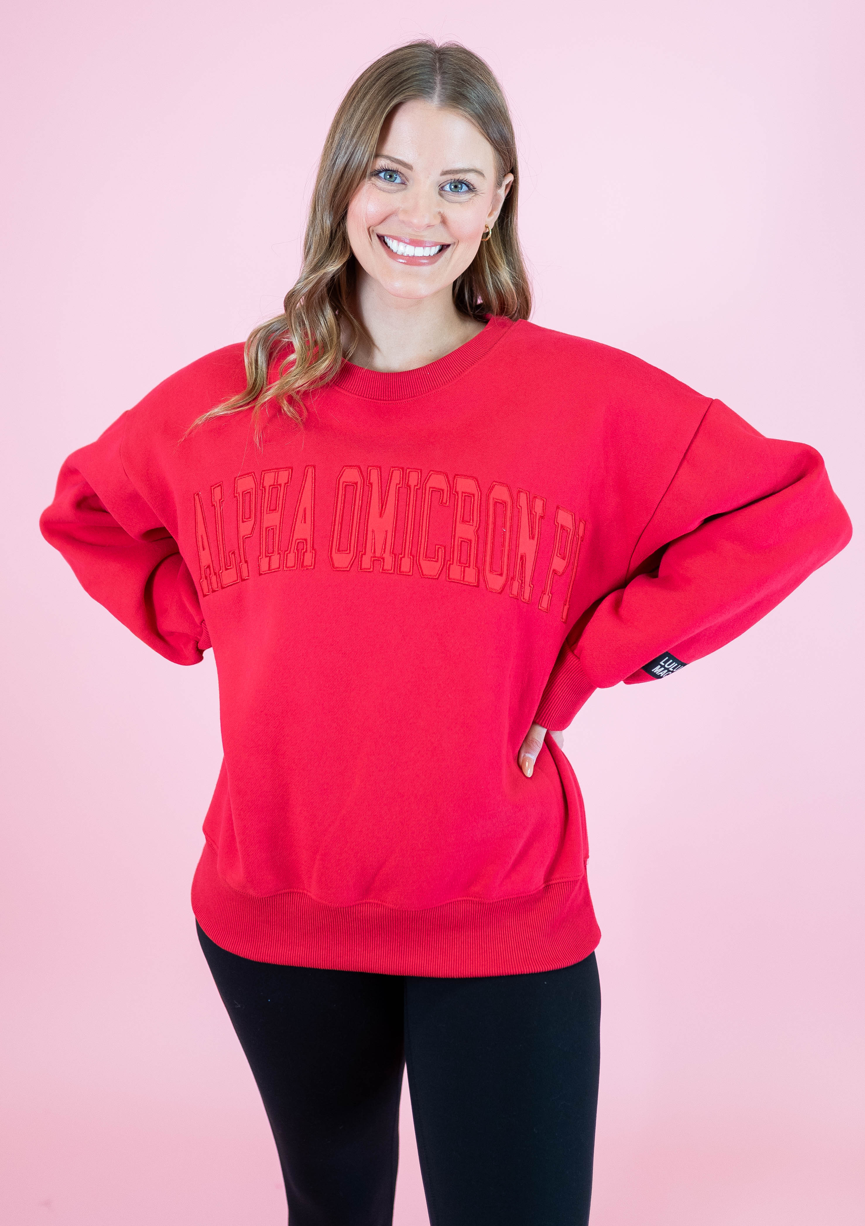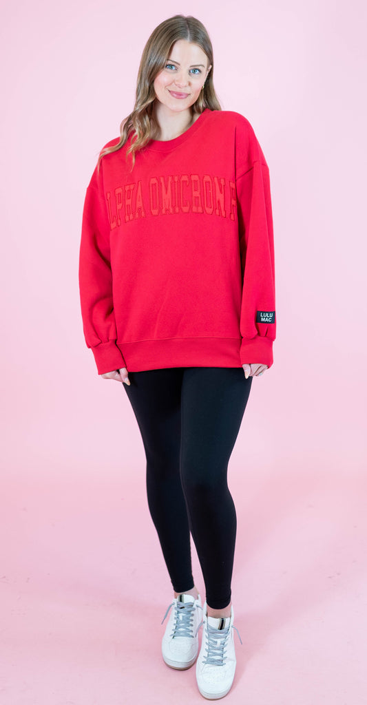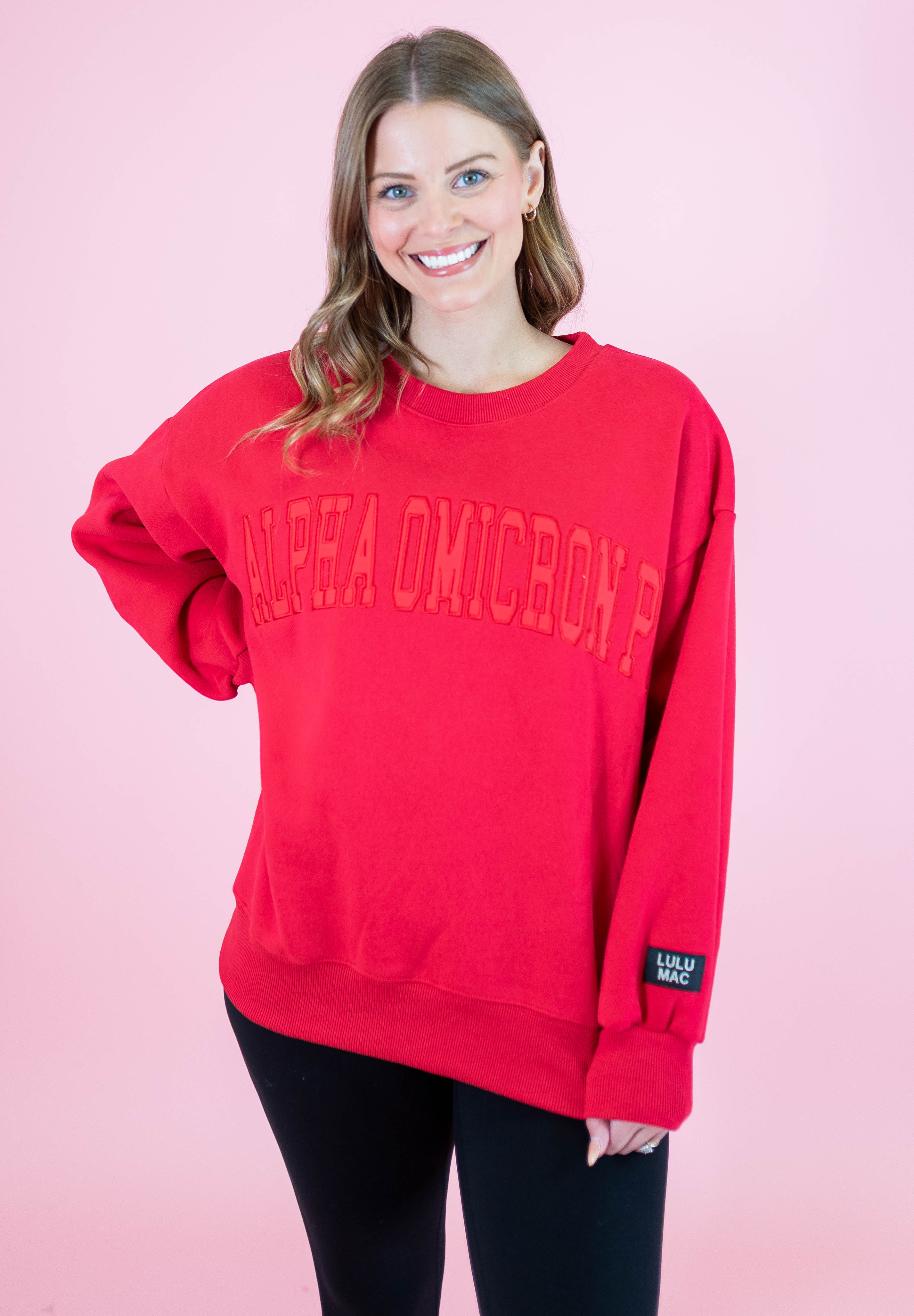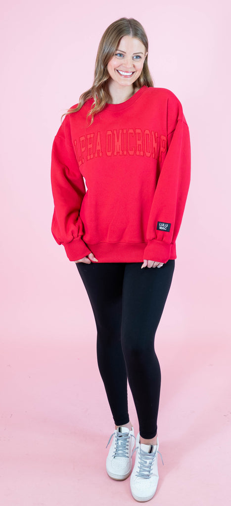 Support your sorority in style with our Lulu Mac: Alpha Omicron Pi Mono Sweatshirt. This red sweatshirt features our sorority's letters in a sleek monotone design. Show off your Greek life pride and stay warm and comfortable with this must-have item!