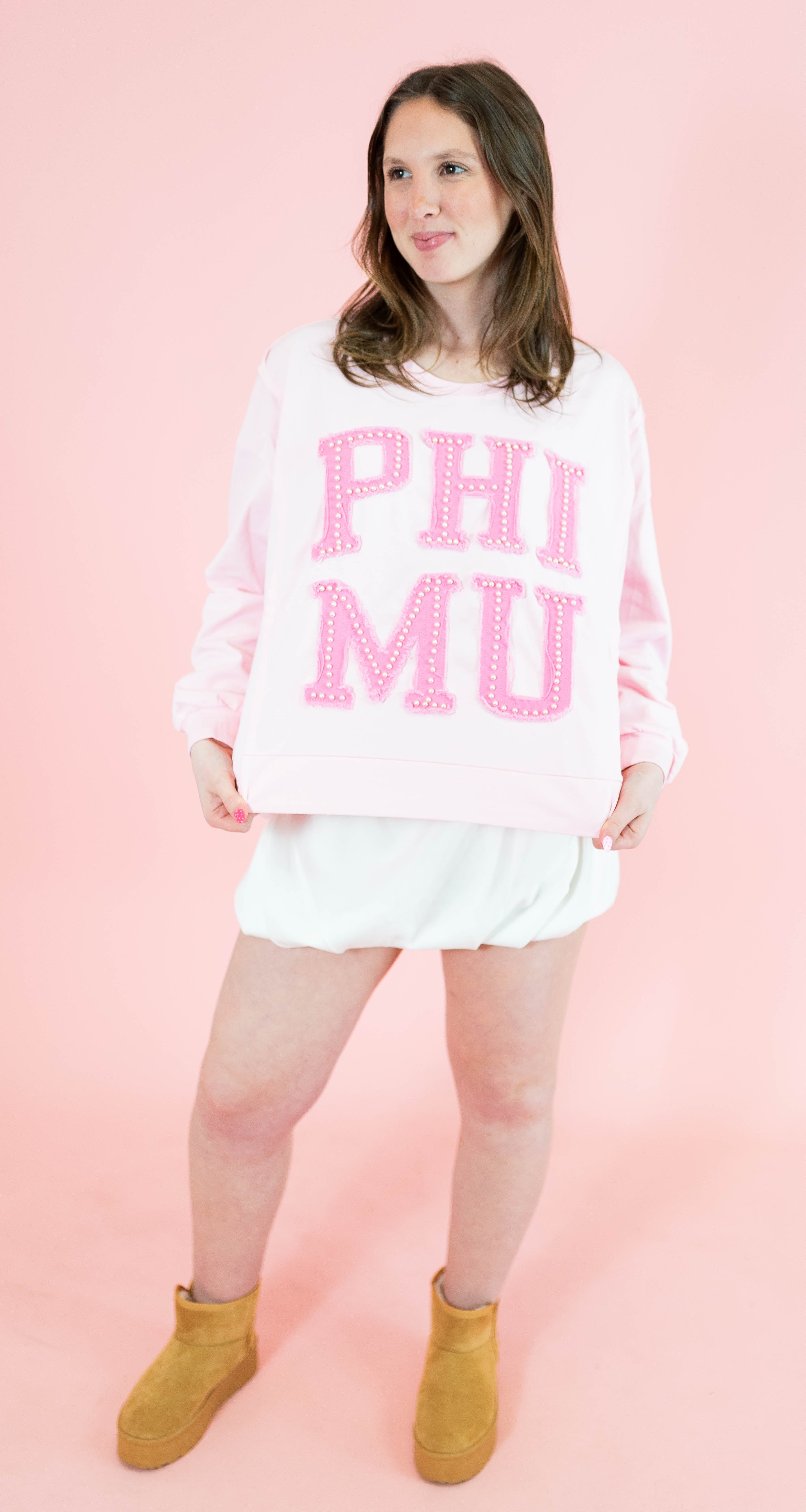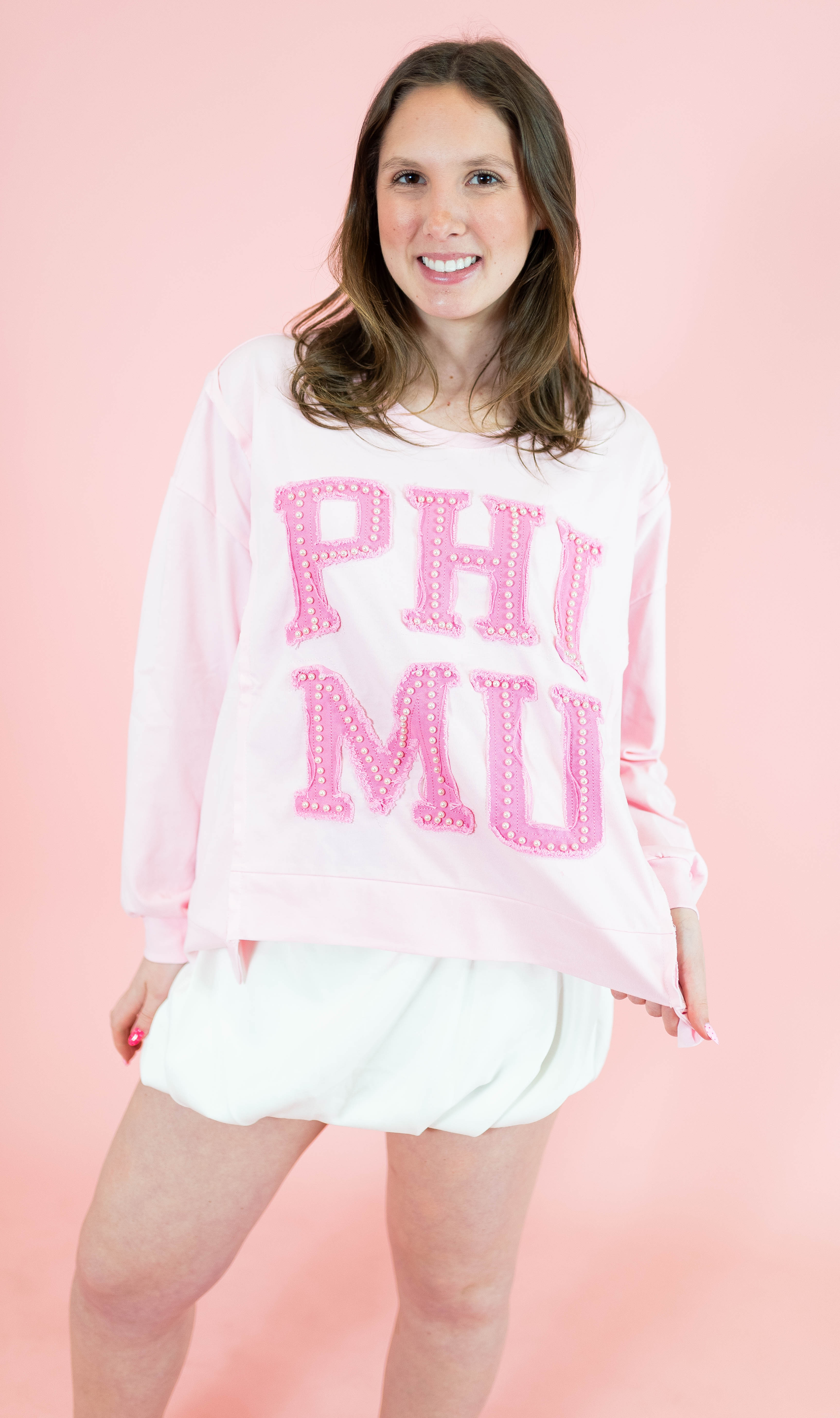 Show your Phi Mu pride in style with this licensed distressed embroidery pullover. The soft pink fabric pairs perfectly with bold embroidered lettering, while the intentional distressed details give it that effortlessly cool, lived-in vibe. Whether you're heading to chapter events, game day, or just want to rep your sorority in comfort, this pullover delivers both spirit and swagger. A must-have for any Phi Mu member's wardrobe.