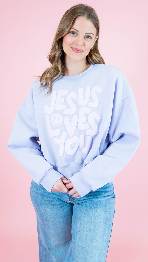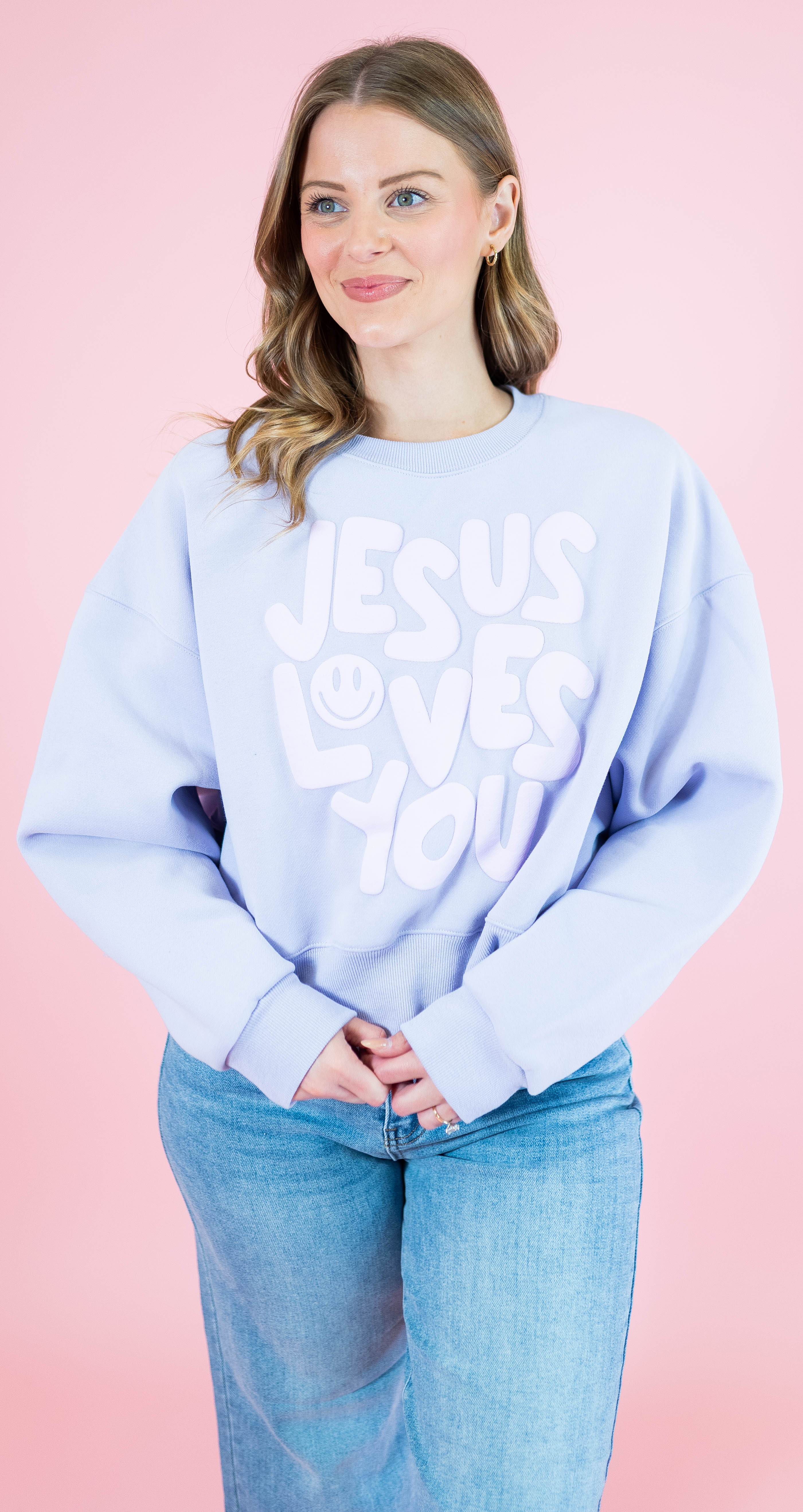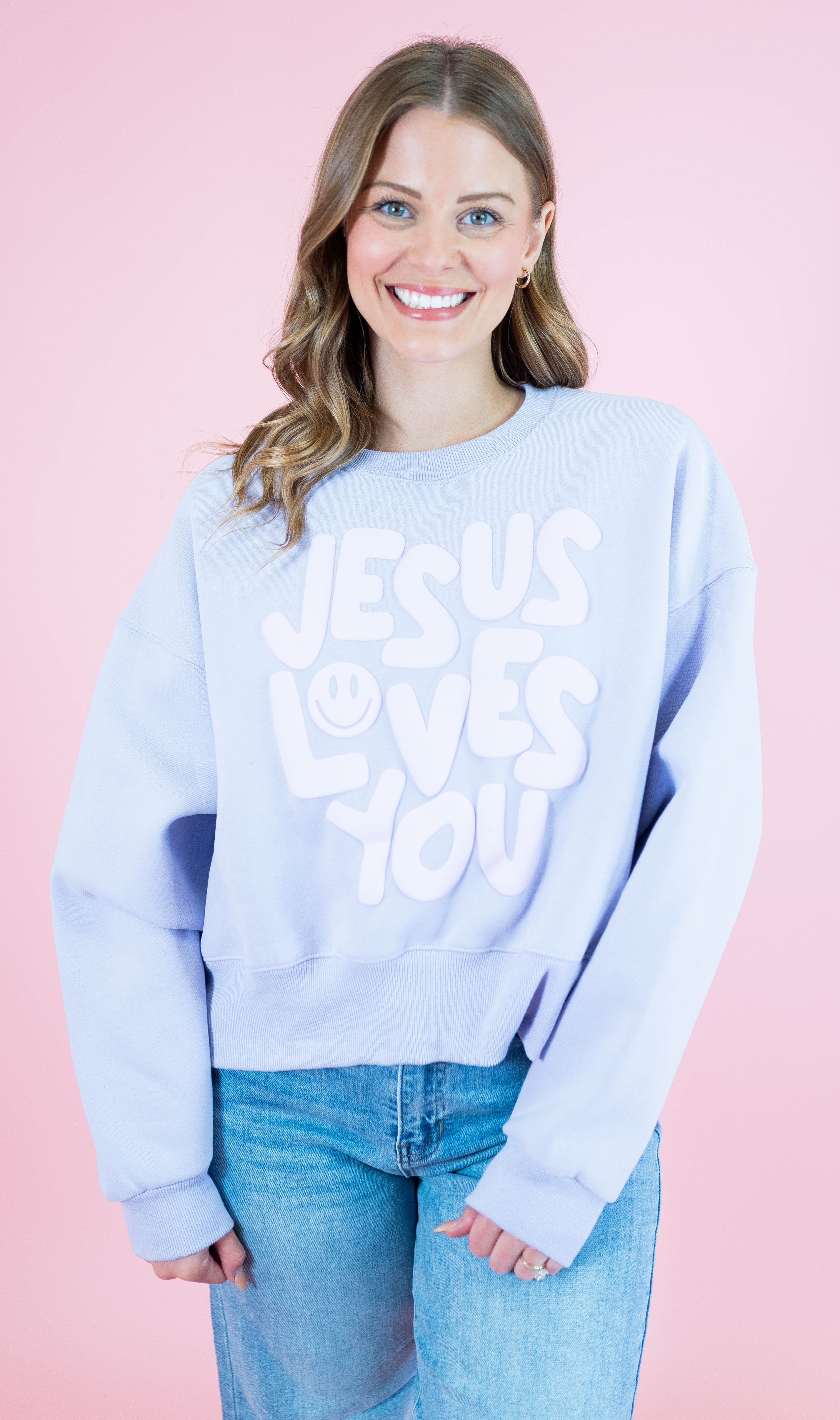 Smiley Jesus Loves You Puff Purple Crop Sweatshirt
