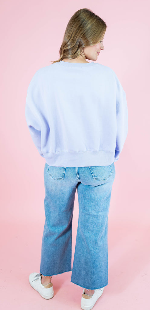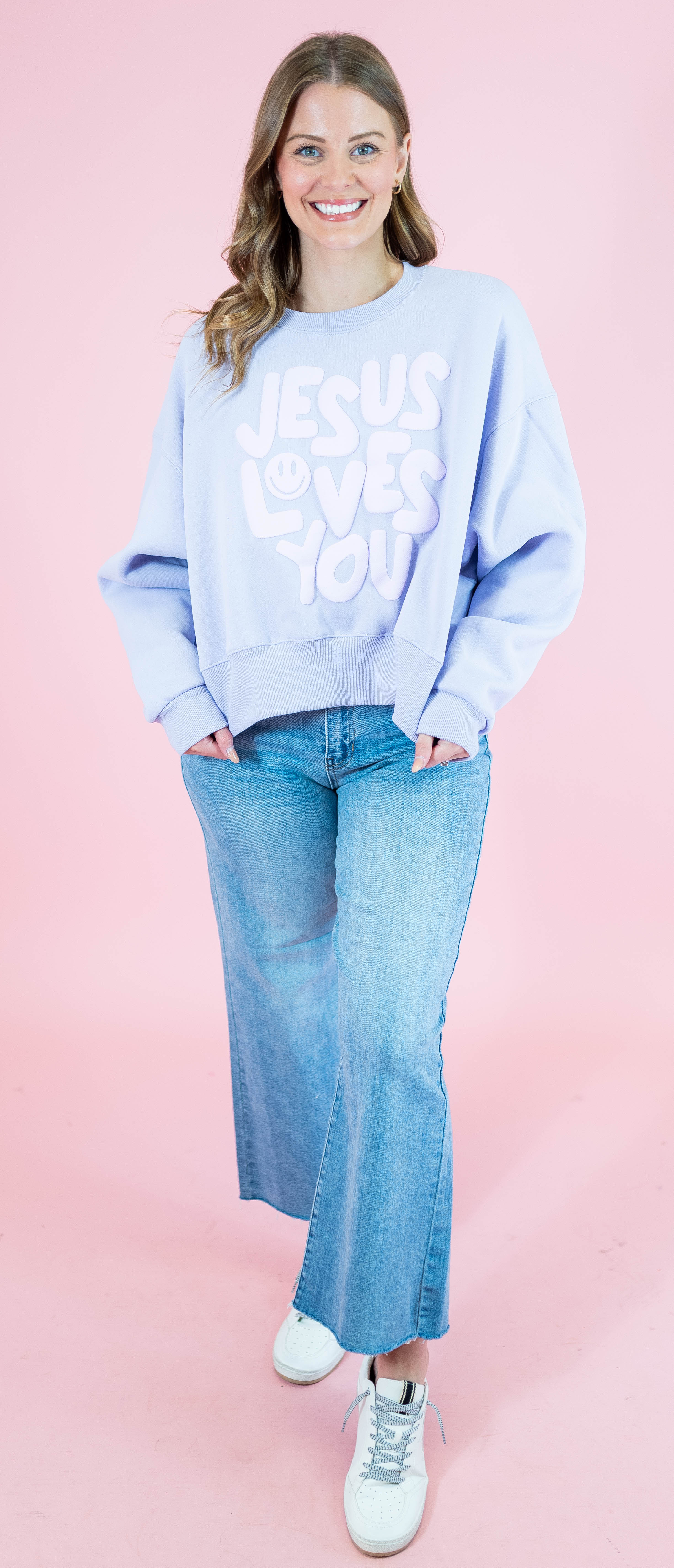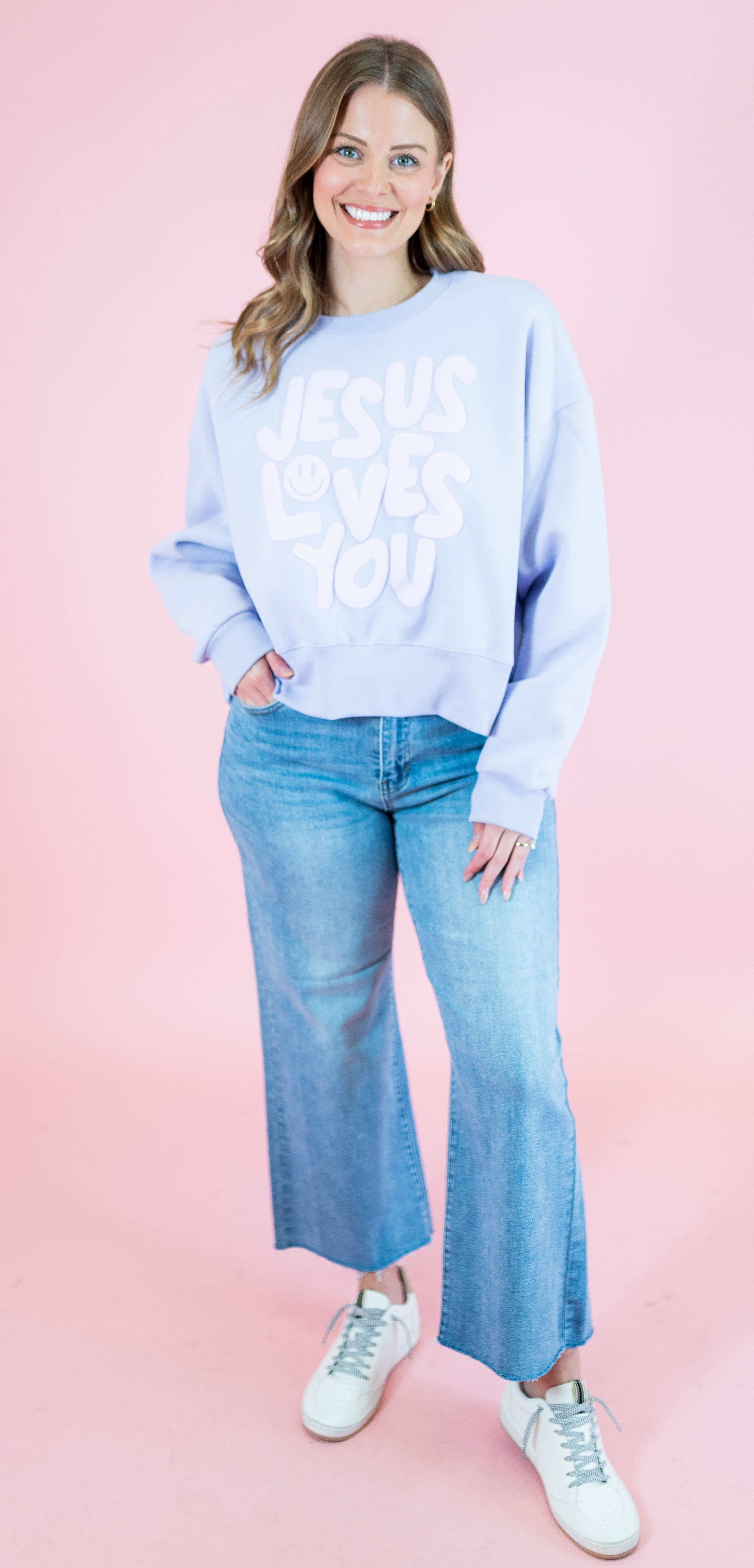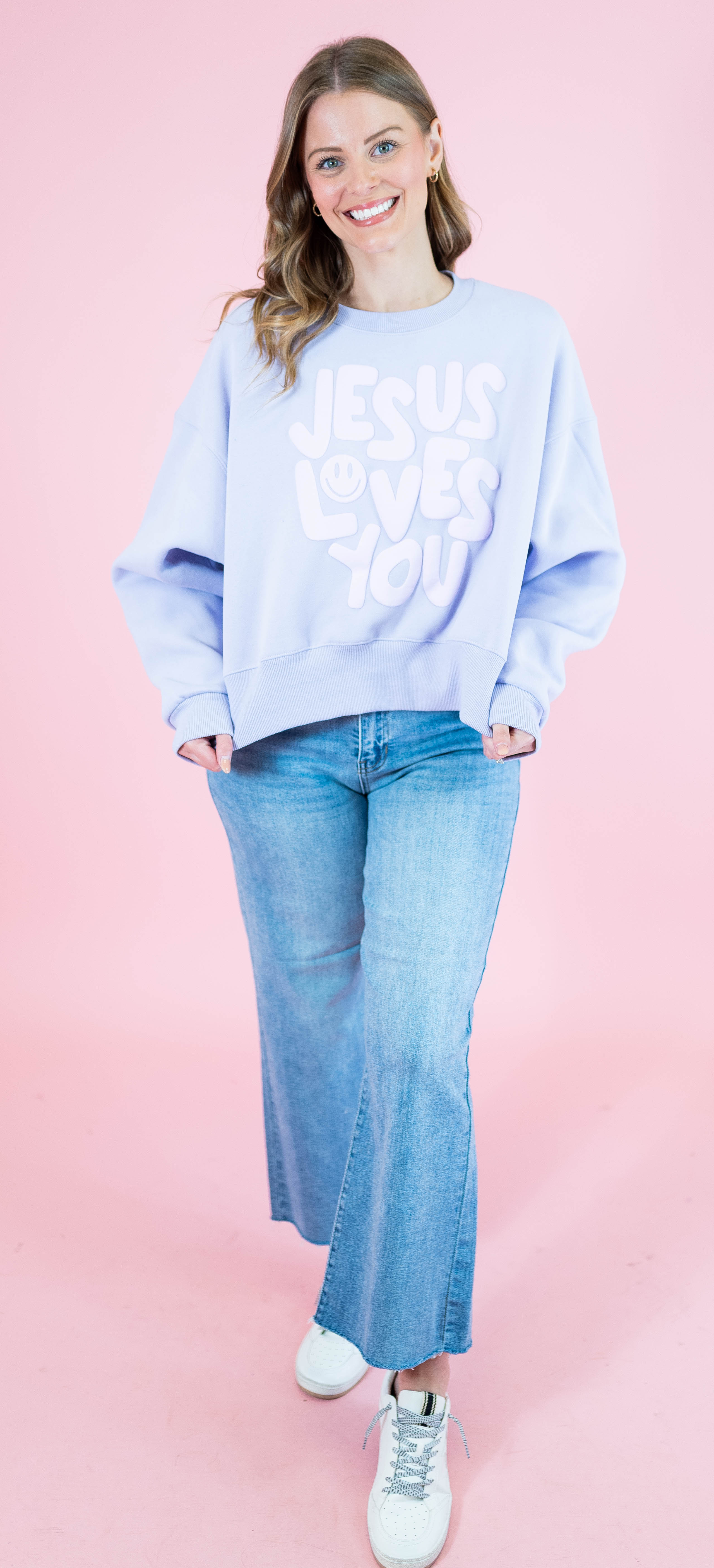 Smiley Jesus Loves You Puff Purple Crop Sweatshirt
