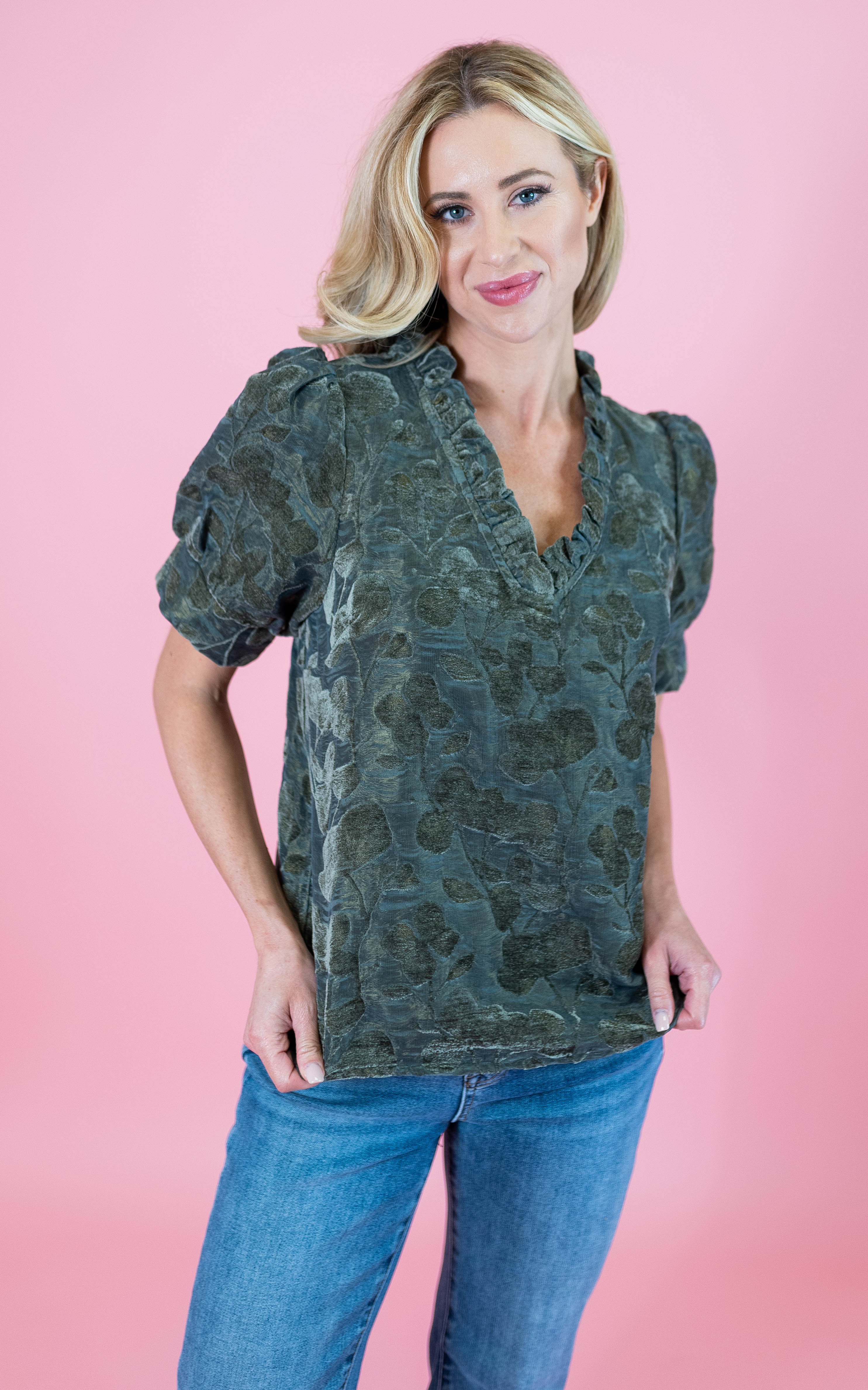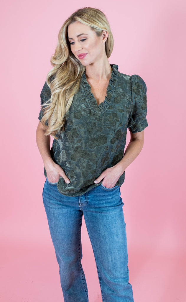Elevate your wardrobe with the Velvet Floral Ruffled V-Neck Blouse in Charcoal. Its soft velvet fabric offers a luxurious feel, while delicate floral patterns add subtle elegance. The flattering V-neckline and gentle ruffles bring a feminine touch, perfect for both casual outings and special occasions. Experience comfort and style seamlessly combined in this versatile blouse.