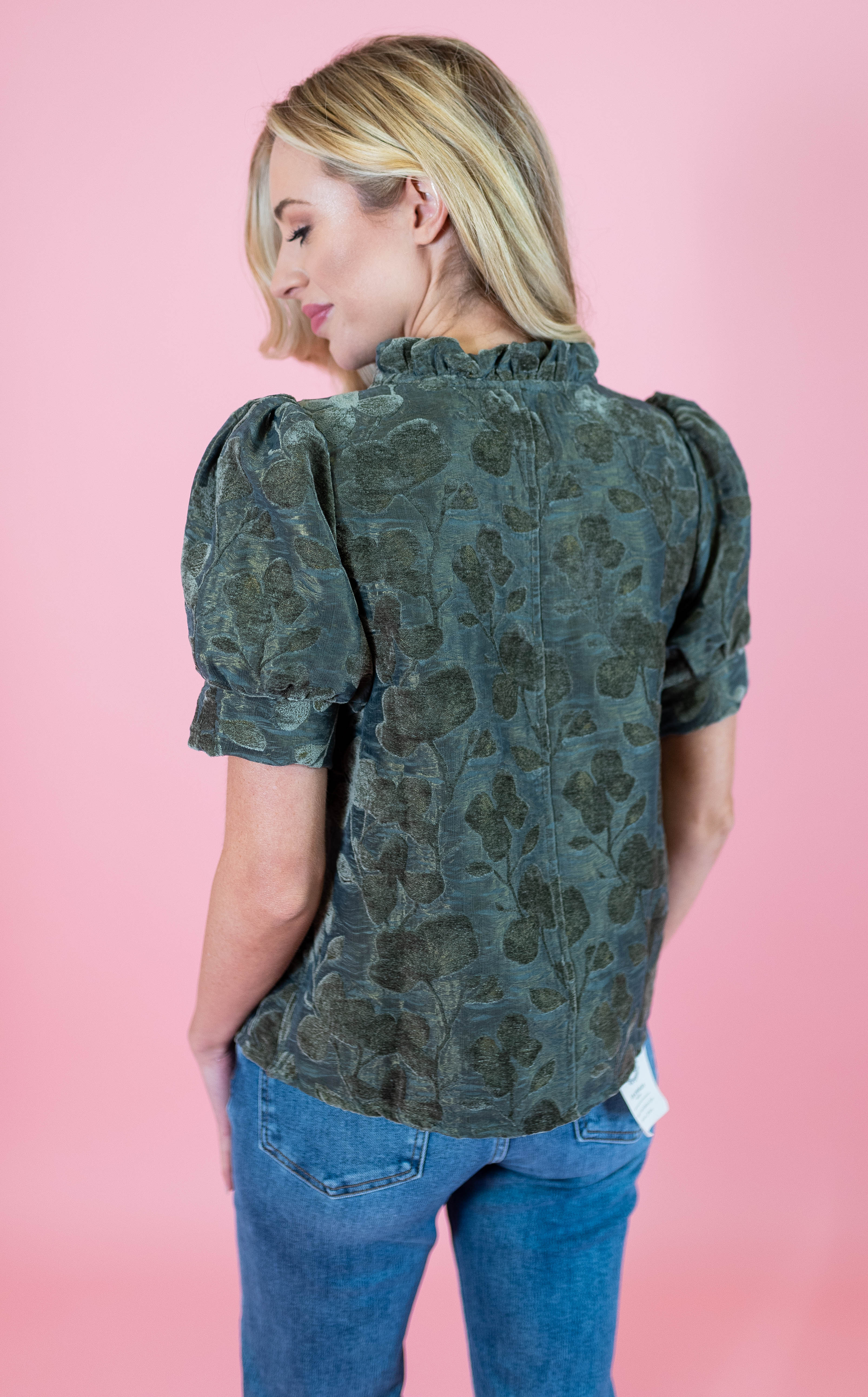 Velvet Floral Ruffled V-Neck Blouse - Charcoal