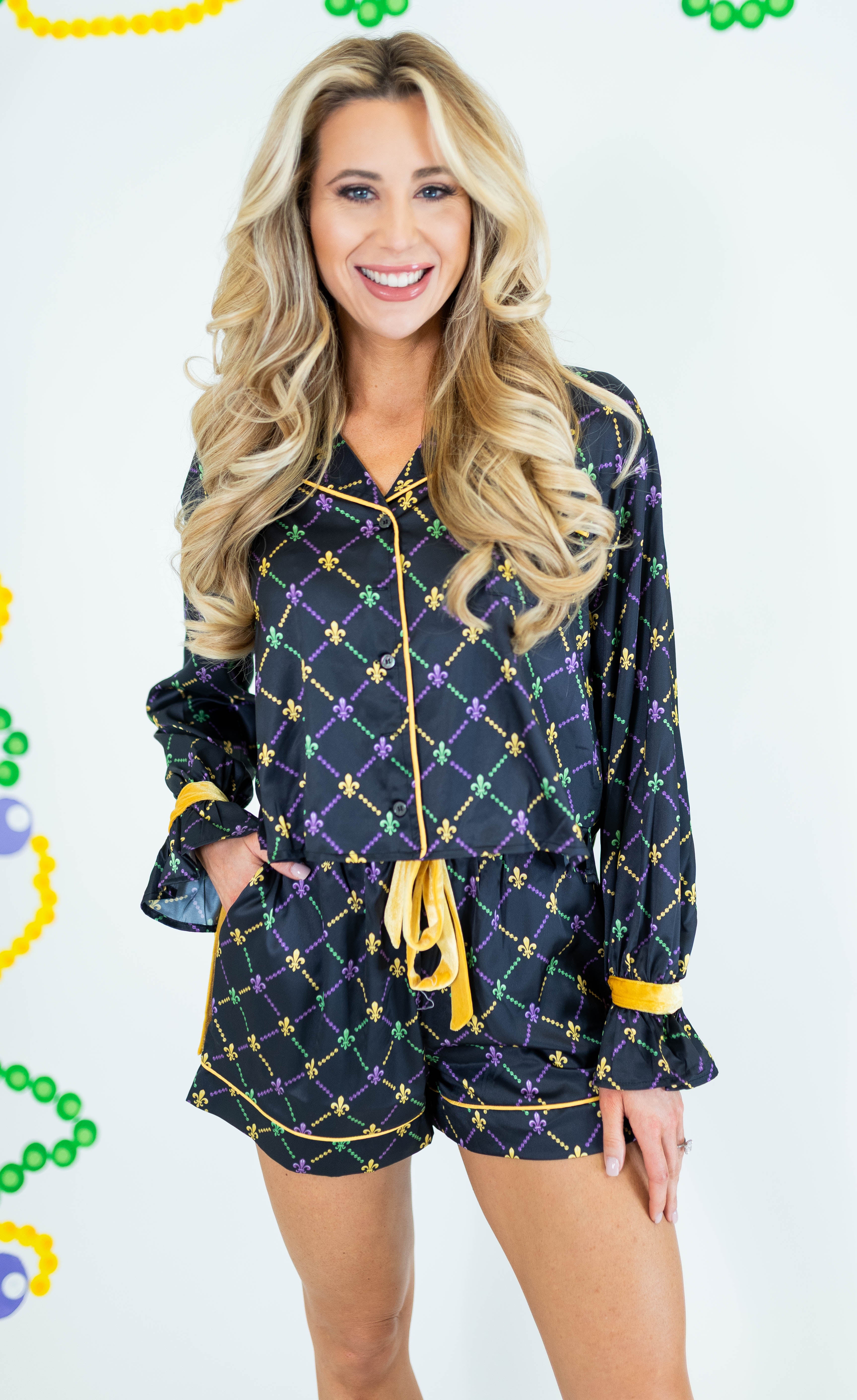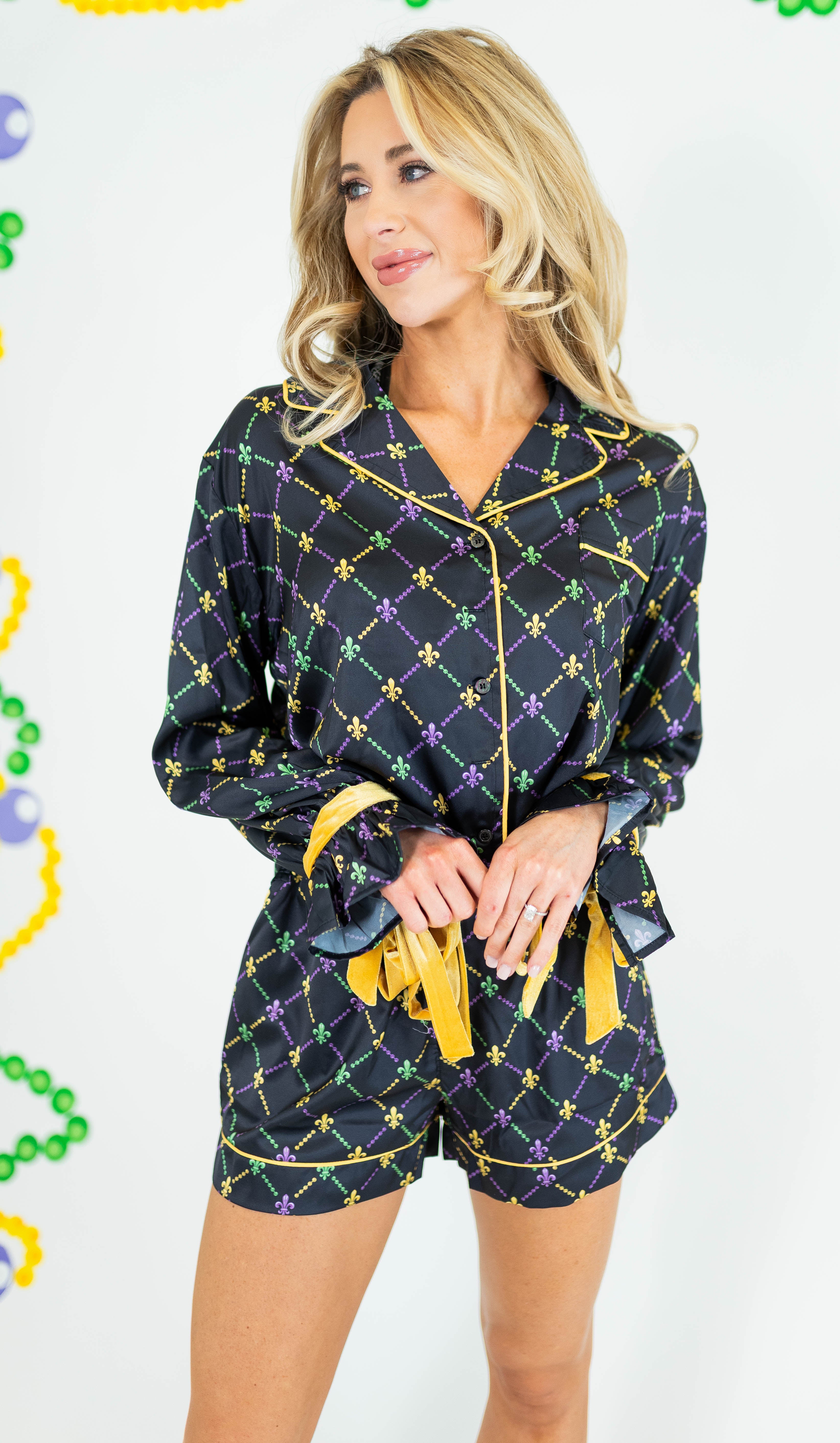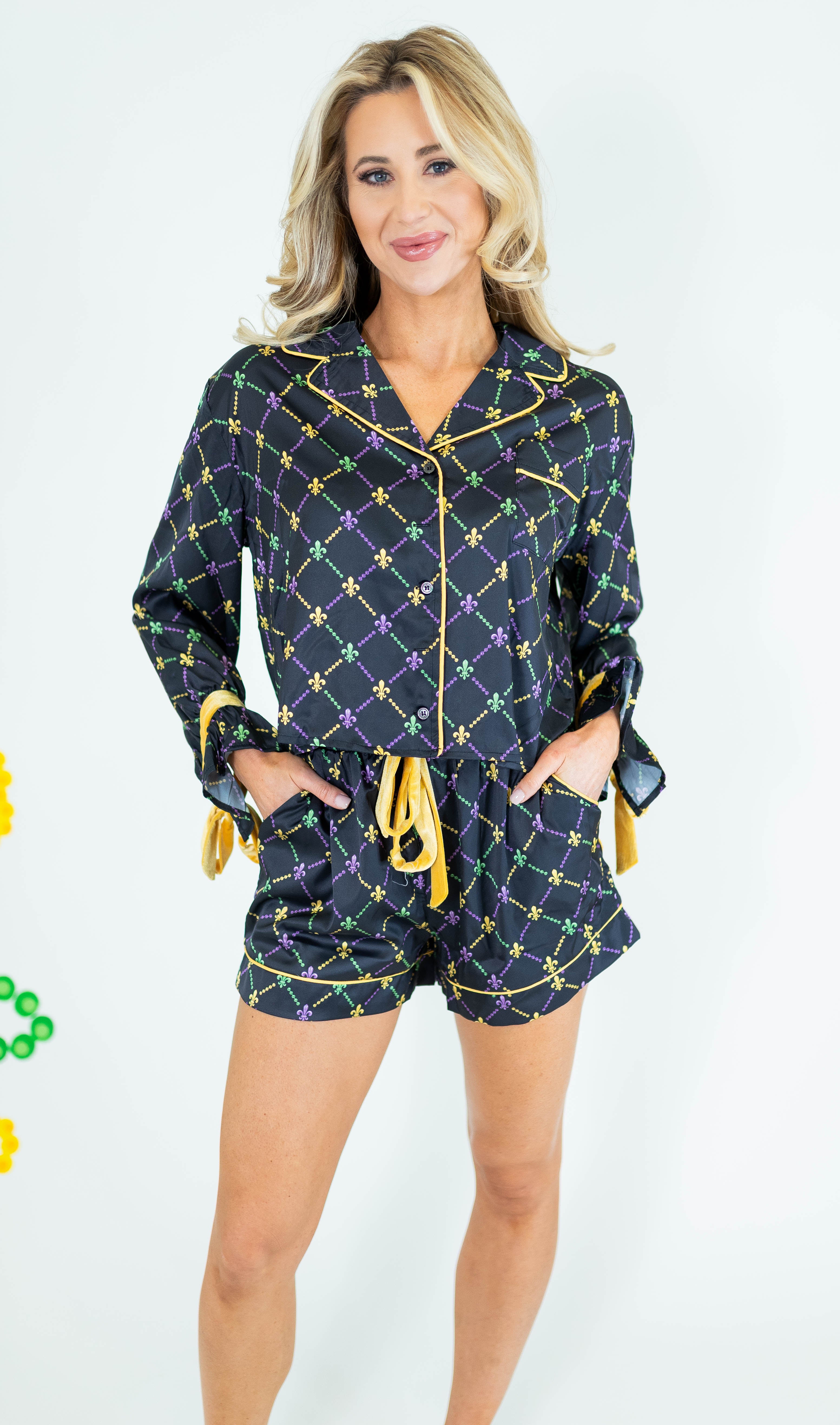 Slip into luxury with these stunning Mardi Gras Satin Pajamas in classic black. Crafted from silky-smooth satin, they drape beautifully against your skin for an indulgent feel that transforms bedtime into a personal retreat. The elegant design combines comfort with sophistication, making them perfect for restful nights or lounging in style. Whether you're treating yourself or searching for a thoughtful gift, these pajamas deliver that coveted blend of glamour and coziness that makes getting ready for bed something to look forward to.