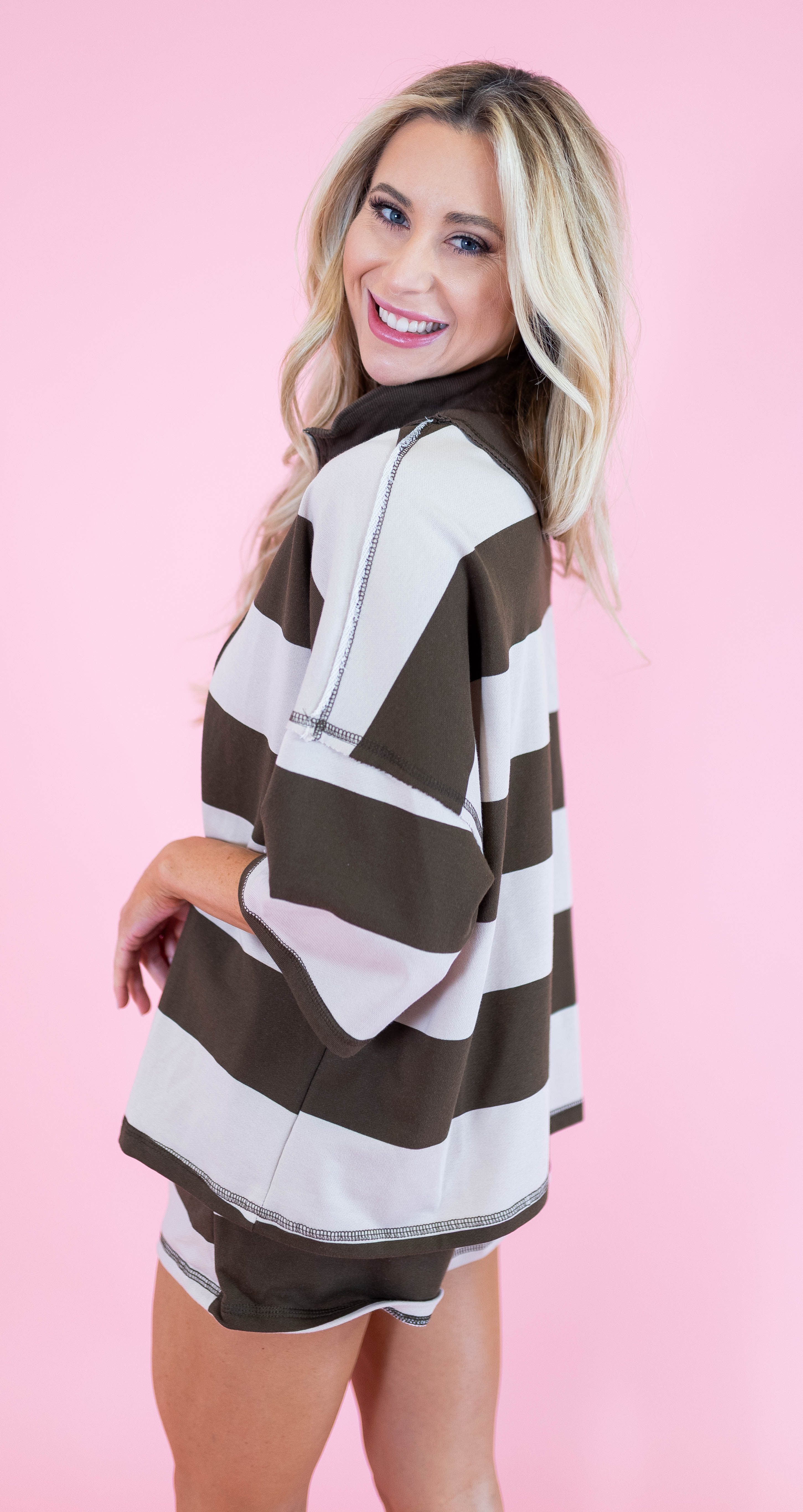Striped Zip Up Oversized Top And Shorts Set - Brown