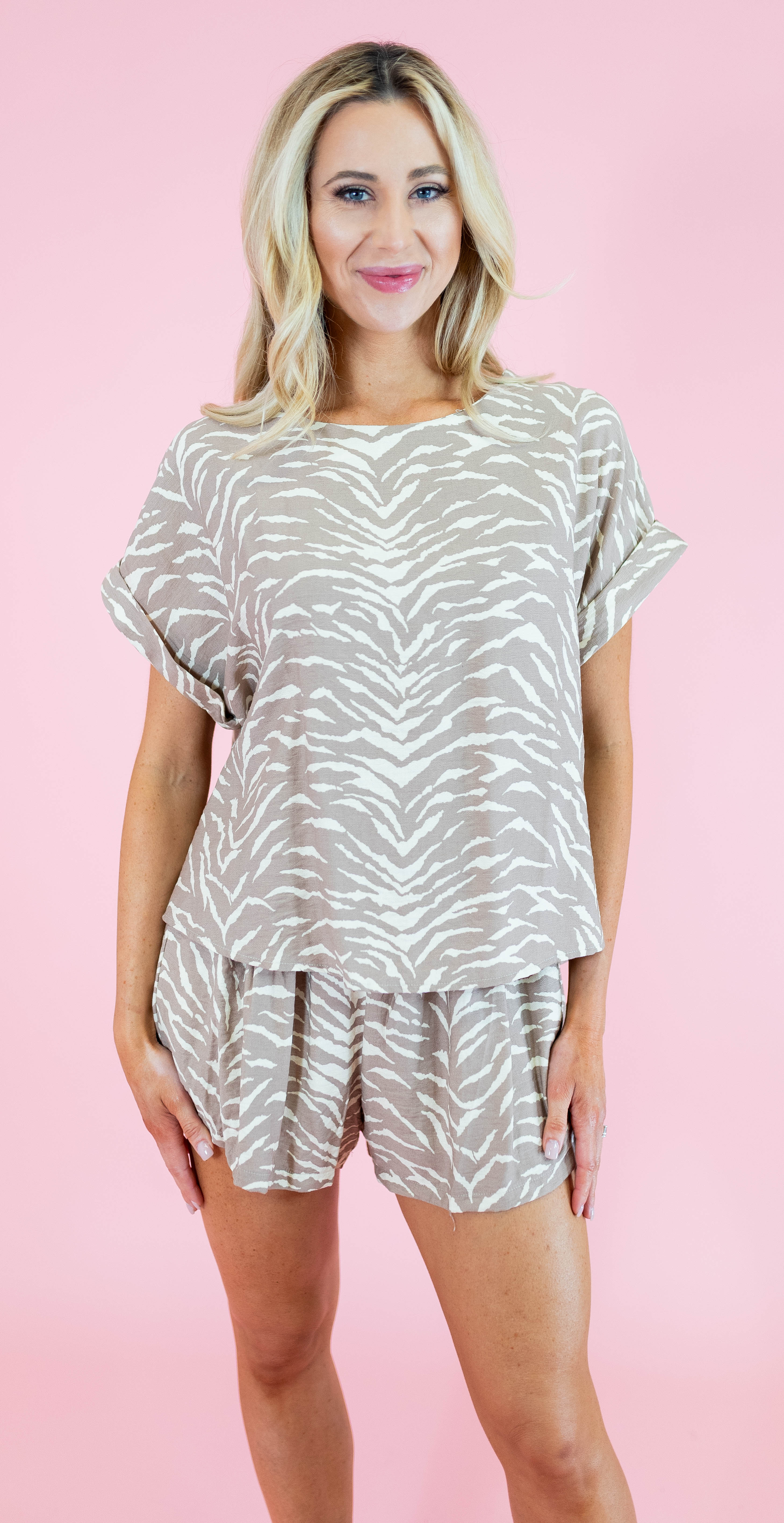 Elevate your casual wardrobe with this stunning taupe animal print set that effortlessly blends style and comfort. The coordinated top and shorts feature a sophisticated neutral palette with eye-catching animal print detailing, making it perfect for weekend outings, brunches, or relaxed evenings out. The soft, breathable fabric moves with you throughout the day, while the thoughtfully designed pieces work beautifully together or separately to maximize your styling options. Whether you're dressing up with accessories or keeping it laid-back, this versatile set delivers an on-trend look that feels both polished and approachable.