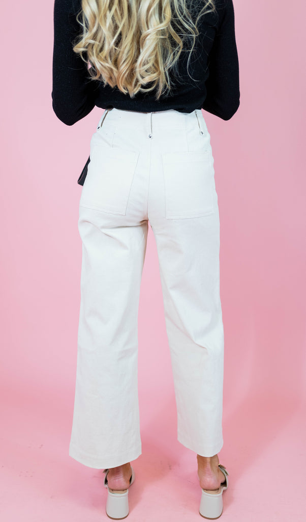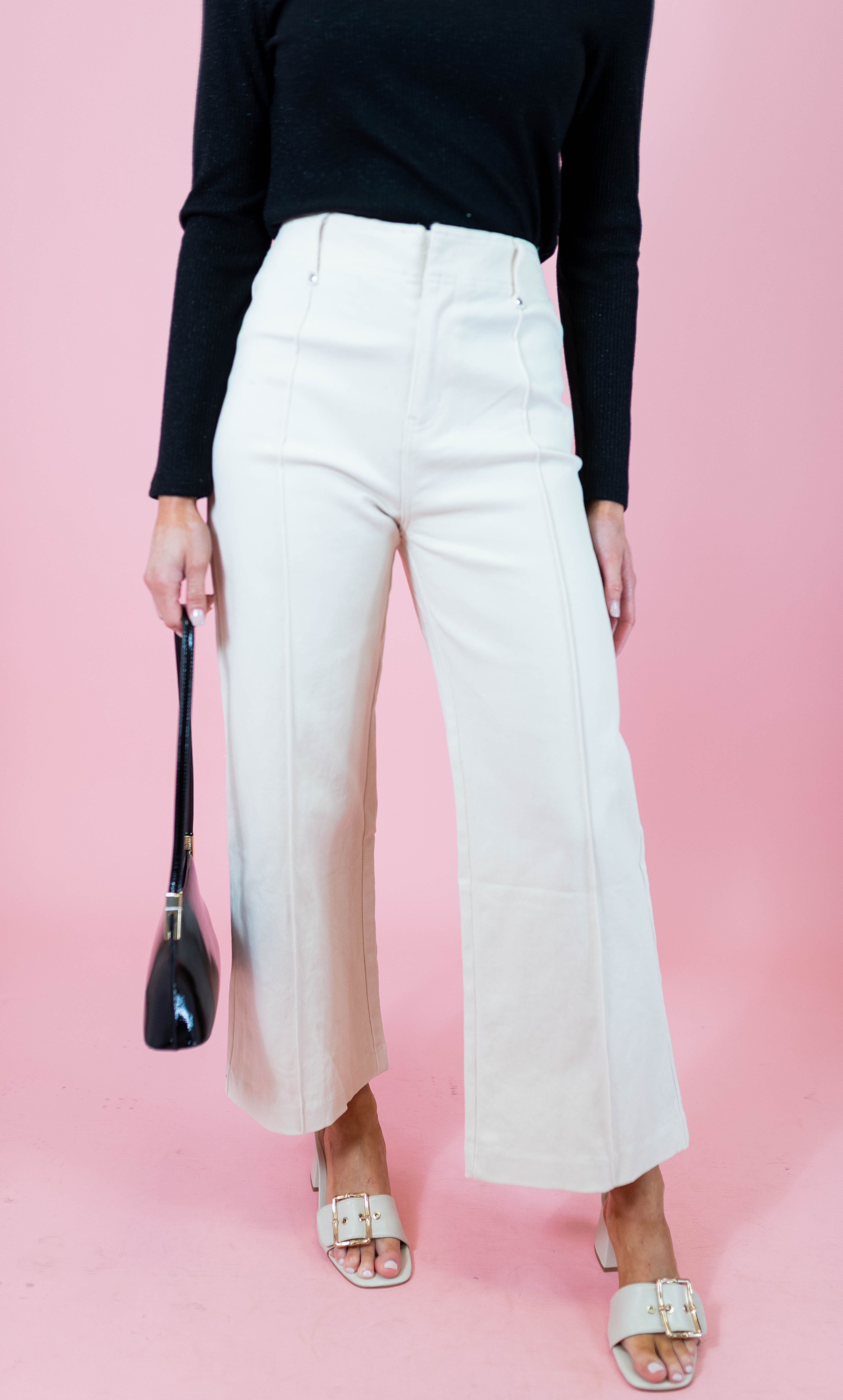 Elevate your wardrobe with these Solid High Rise Wide Leg Pants in elegant ecru. Designed to flatter your silhouette, the high-rise fit enhances your waist while the wide leg provides effortless comfort and movement. Perfect for both professional settings and casual outings, these pants offer a versatile, chic look that pairs seamlessly with your favorite tops and shoes. Embrace style and confidence every time you wear them.