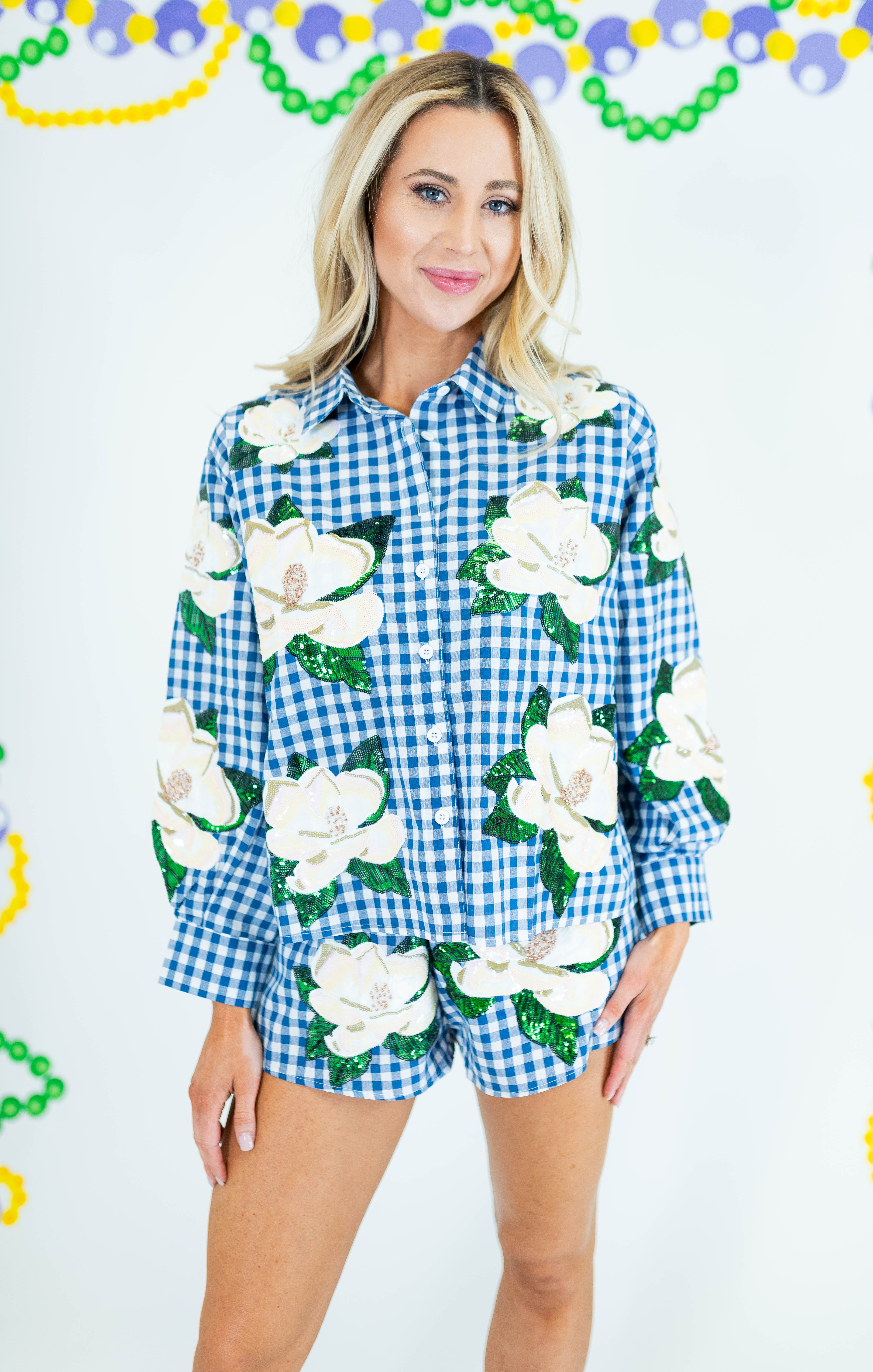 Elevate your wardrobe with this Queen Of Sparkles button-up top, featuring a striking blue and white checkered pattern accented with delicate scattered magnolia details. The refined design seamlessly transitions from casual daytime wear to sophisticated evening occasions. Crafted with attention to detail, this piece offers a polished aesthetic that complements both classic and contemporary styling. Perfect for those who appreciate timeless elegance with a modern twist.