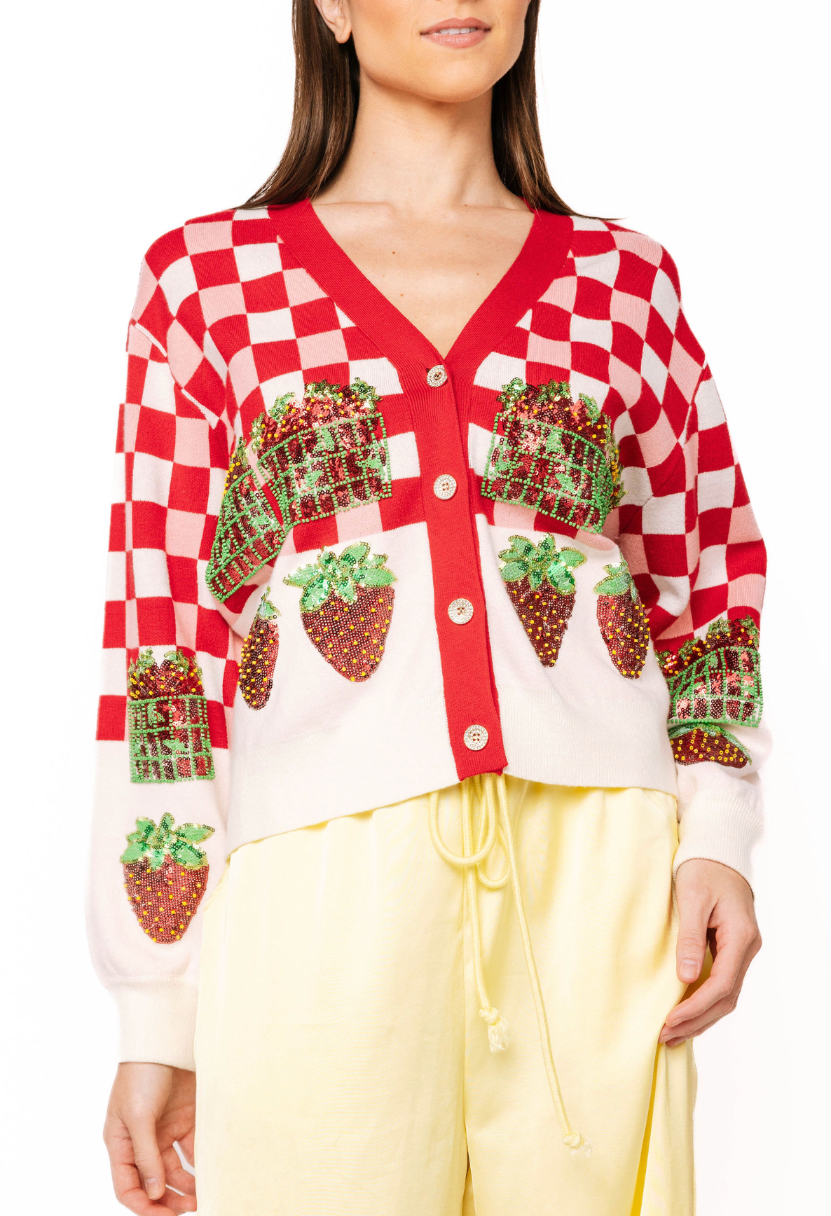 Embrace your sweetest style with this adorable Queen Of Sparkles cardigan featuring a charming red and white checkered pattern adorned with strawberry details. Perfect for strawberry season and spring adventures, this button-up layer brings whimsical fun to any outfit. The playful design captures that carefree festival spirit while the classic cardigan silhouette keeps it versatile for everyday wear. Whether you're heading to a farmers market or just spreading joy, this piece is your ticket to looking absolutely delightful.