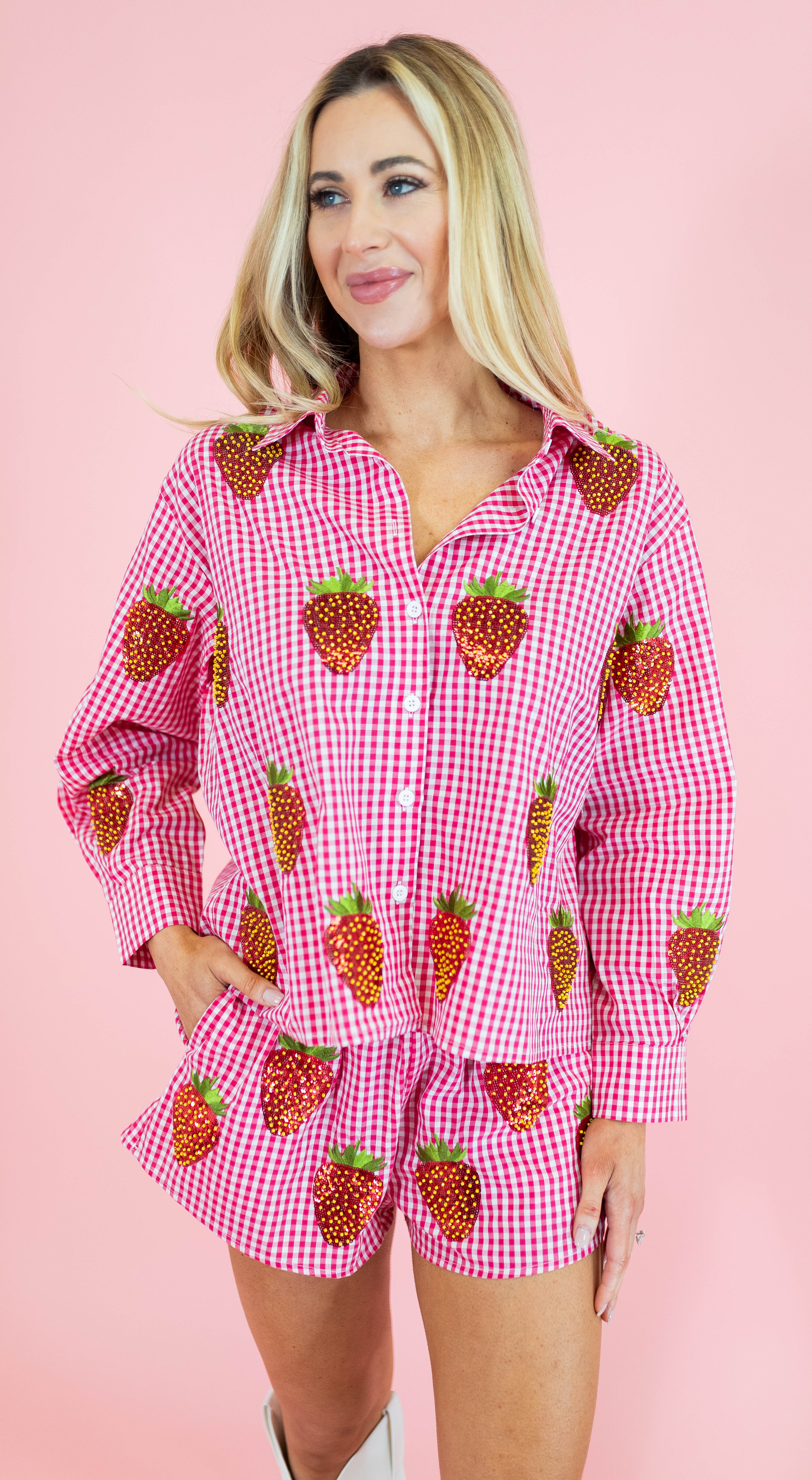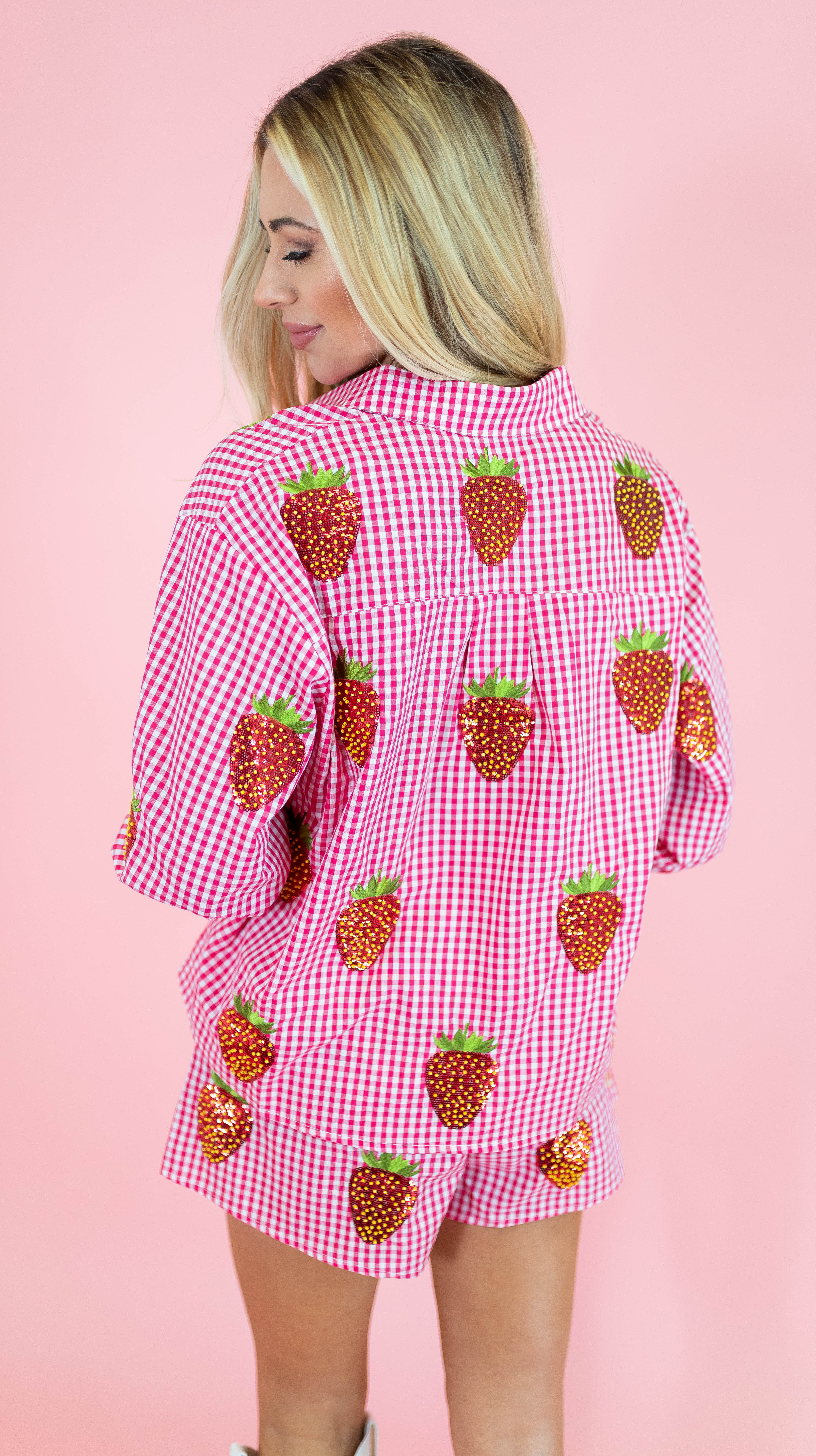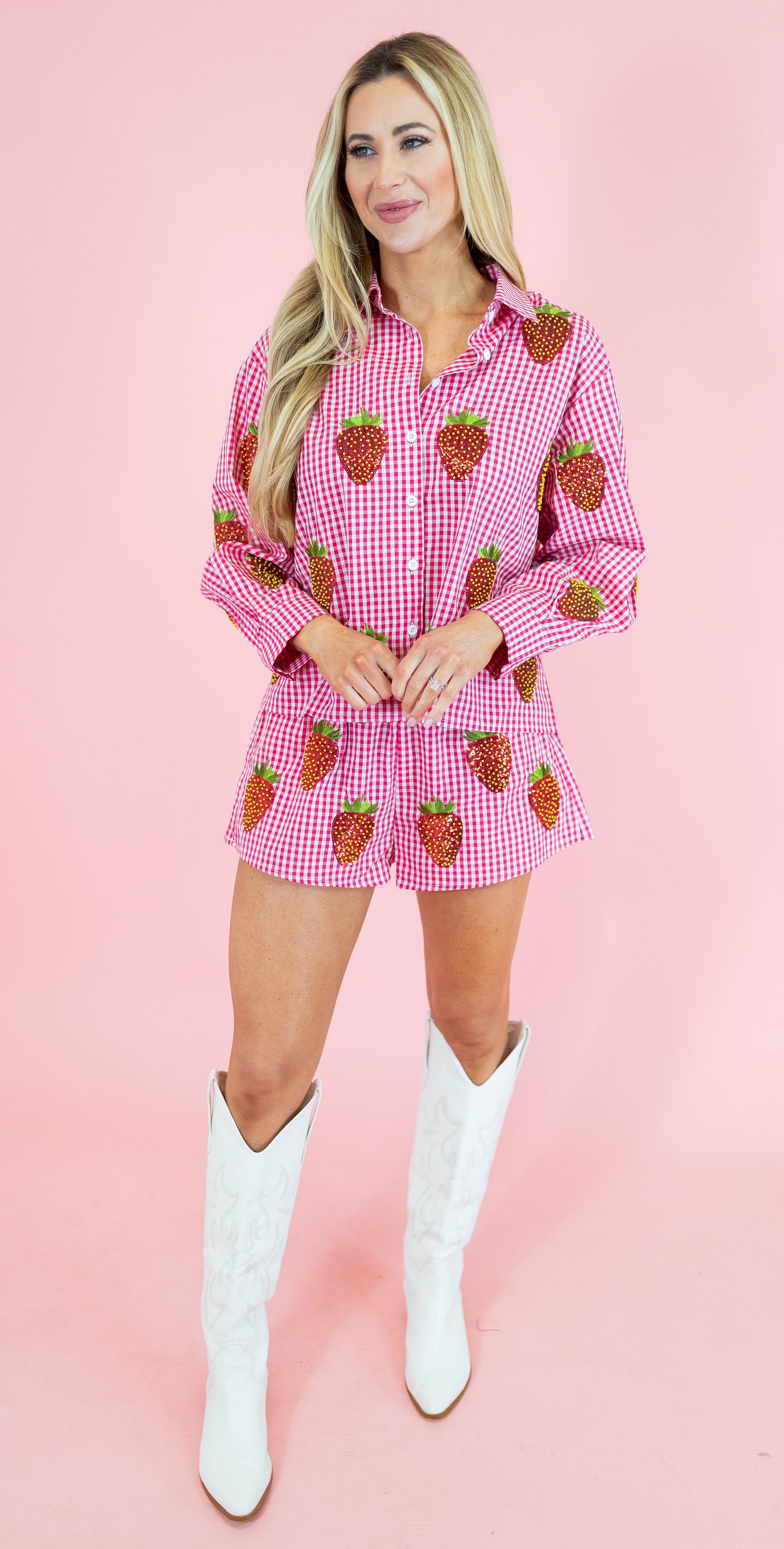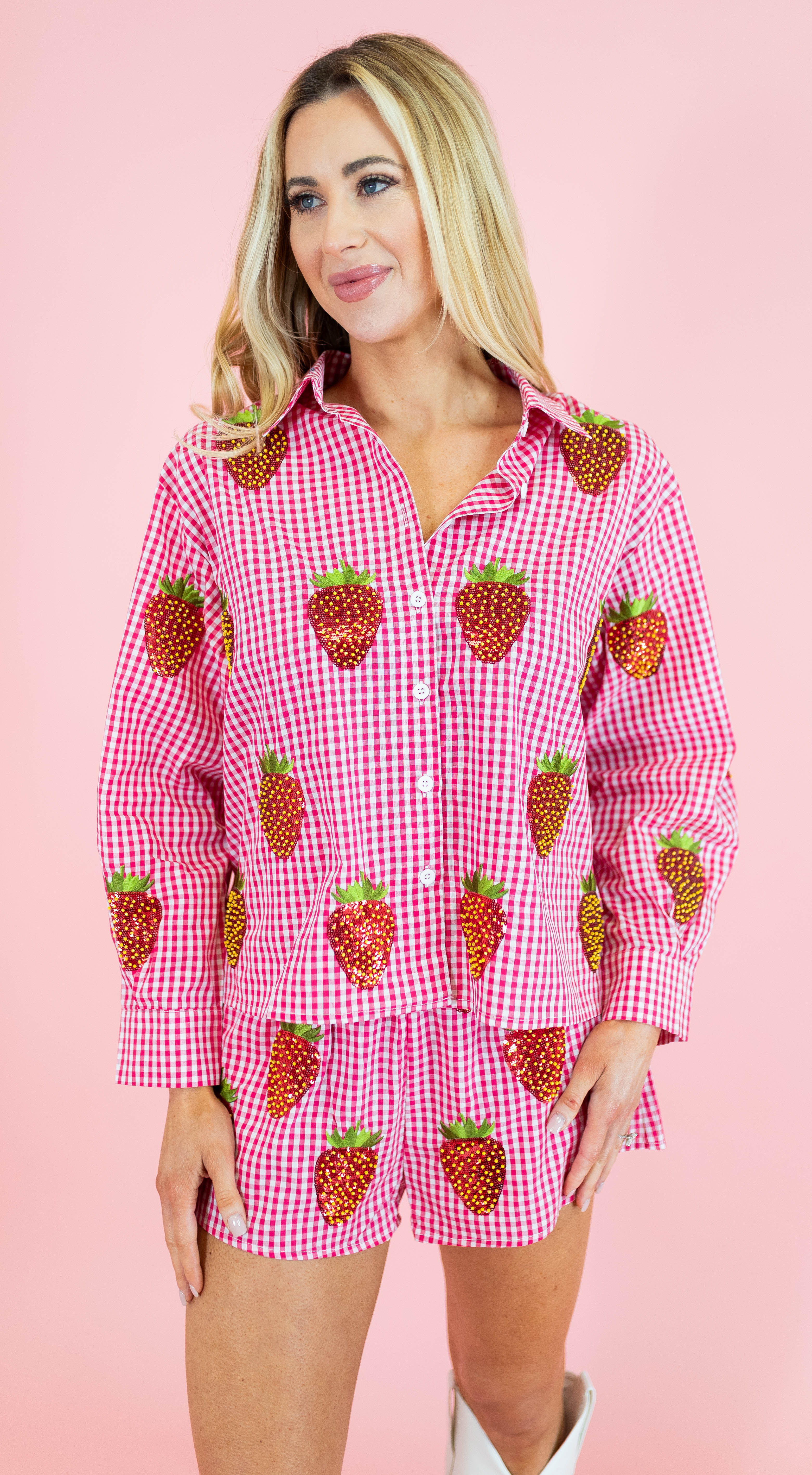 Queen Of Sparkles: Gingham Beaded Strawberry Button Up Top