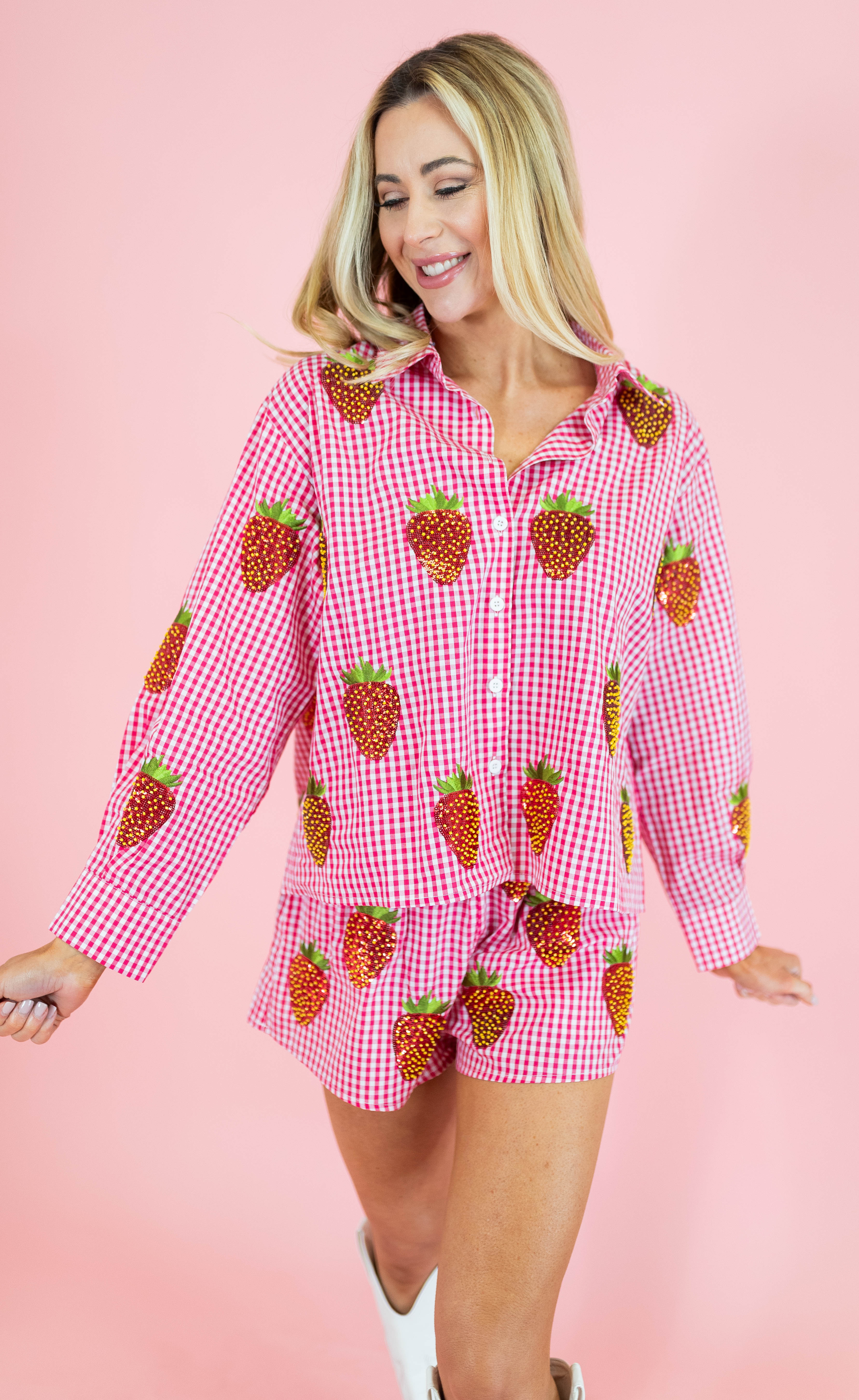 Embrace your sweetest style with this adorable gingham button-up top from Queen Of Sparkles, featuring a charming beaded strawberry design perfect for strawberry fest season. The playful gingham pattern pairs beautifully with the matching shorts for a coordinated look that's bursting with personality. Whether you're heading to a festival or just want to add some fruity fun to your wardrobe, this top delivers sparkle and whimsy in every stitch. A delightful piece that celebrates bold, joyful fashion.