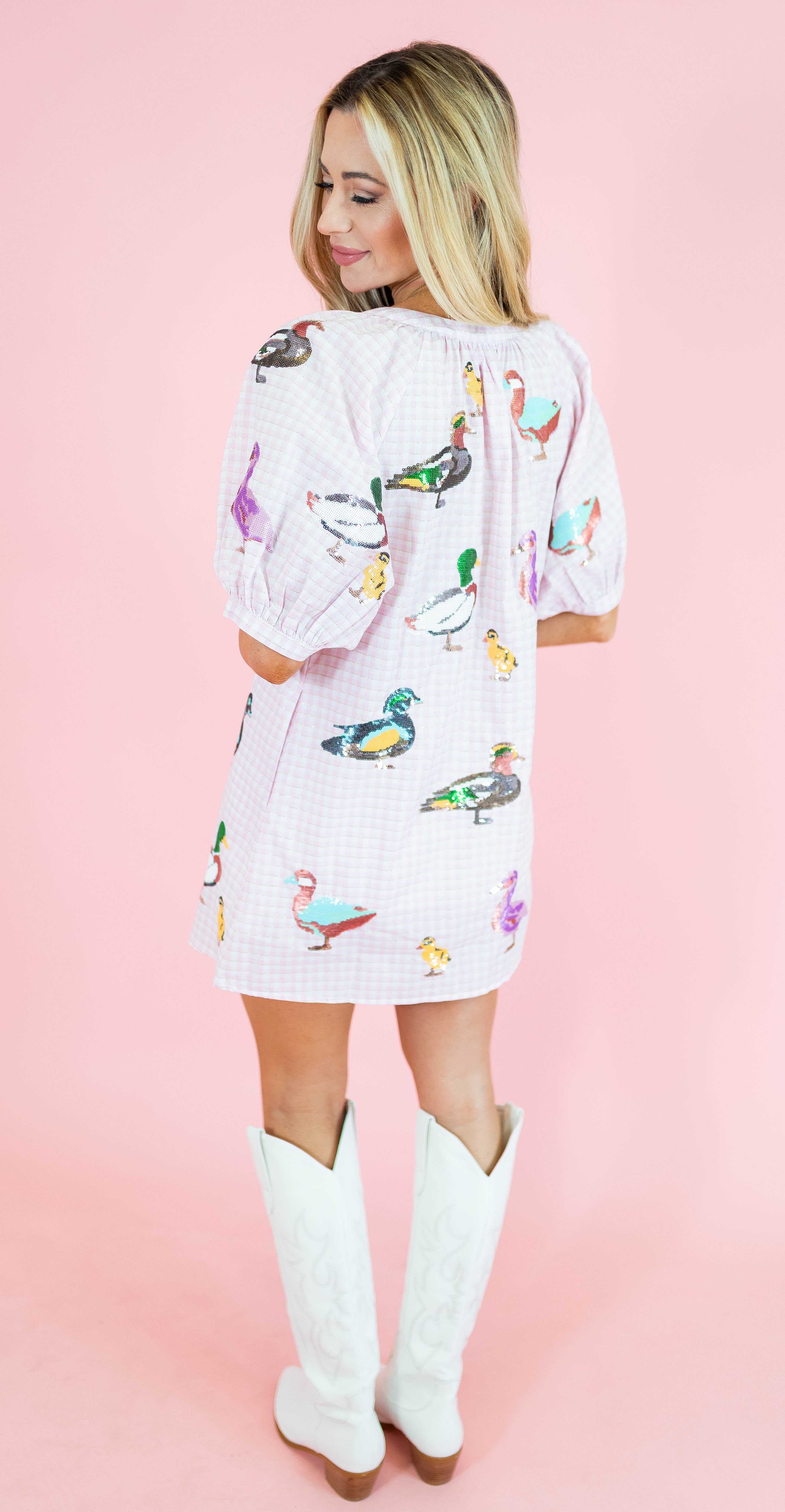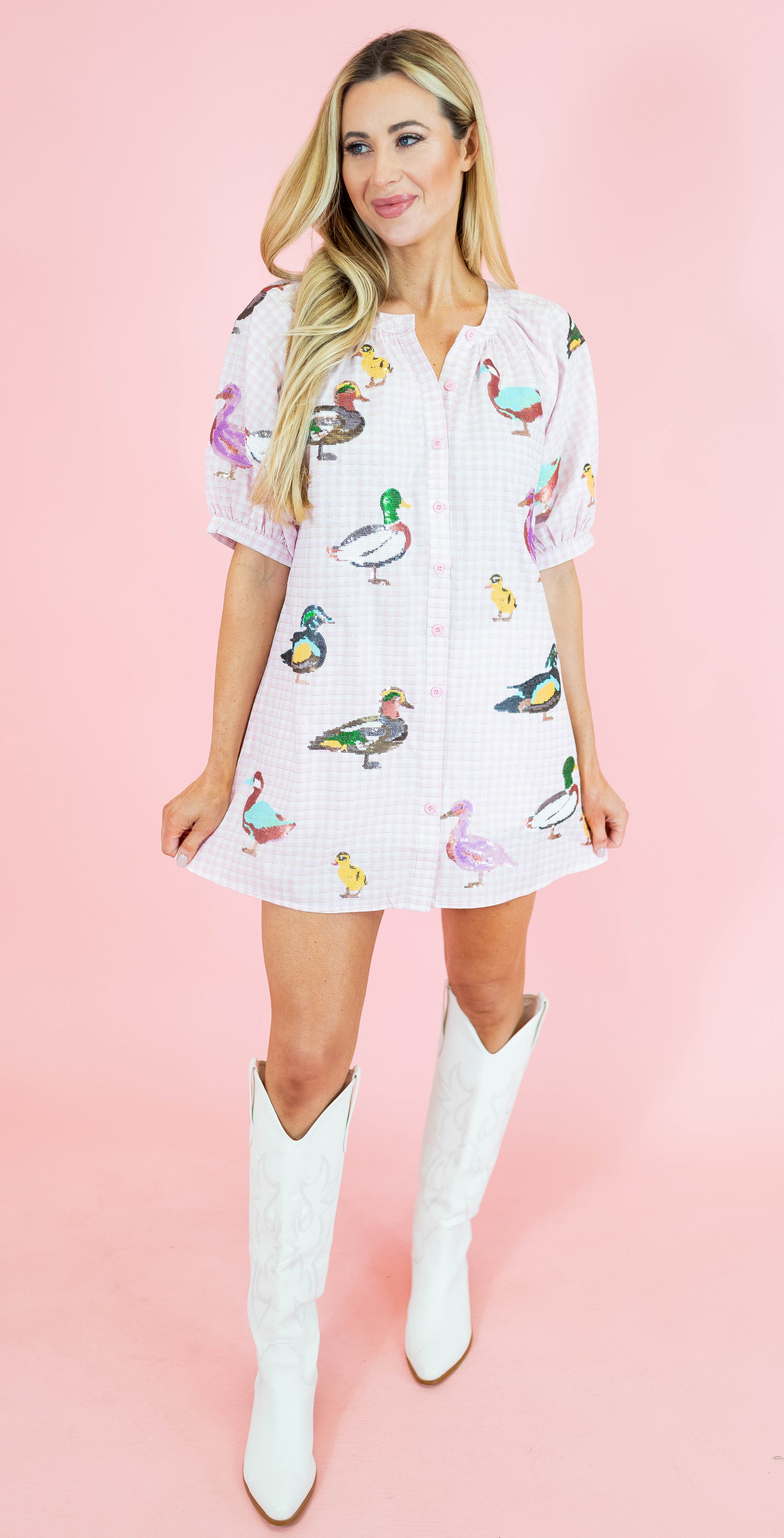 Hop into spring style with this adorable gingham button-up dress from Queen Of Sparkles! Featuring a charming light pink palette scattered with cute duck motifs, this piece brings whimsical charm to your seasonal wardrobe. The classic gingham pattern pairs perfectly with the playful duck details for a look that's equal parts sweet and fun. With its button-up front and relaxed fit, it's ideal for casual outings, picnics, or any springtime adventure. Embrace your inner fashionista with this delightful dress that celebrates the joy of the season!