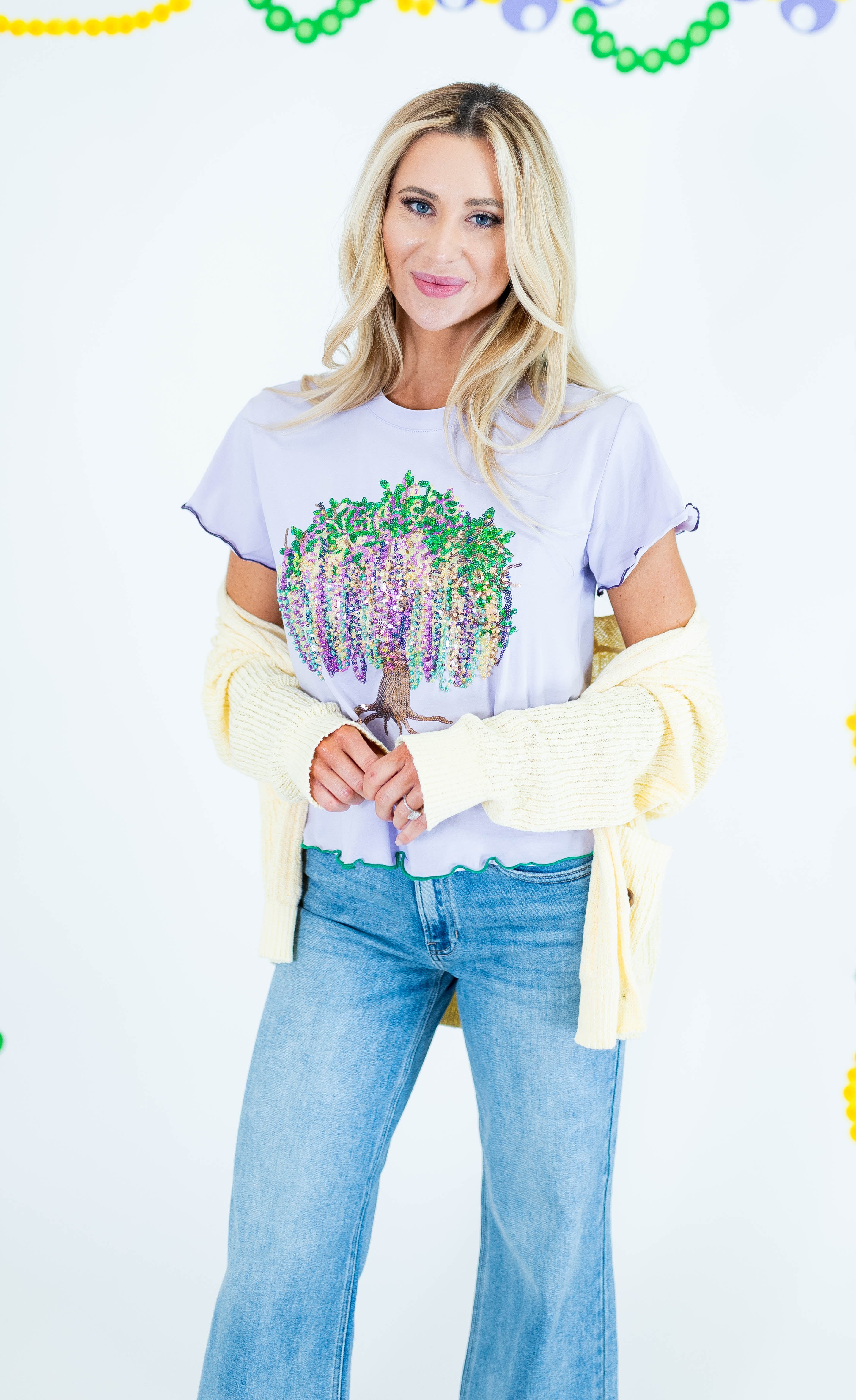Make a refined statement this Mardi Gras season in the Queen Of Sparkles Lavender Frill Edge Beads In Tree Tee. Lavender tee with delicate frilled edges form an elegant tree motif across the chest, delivering understated glamour with festive flair. The meticulous beadwork showcases quality craftsmanship, while the soft lavender palette offers a sophisticated alternative to traditional bold carnival colors. Ideal for those seeking polished holiday style without compromising on sparkle and presence.