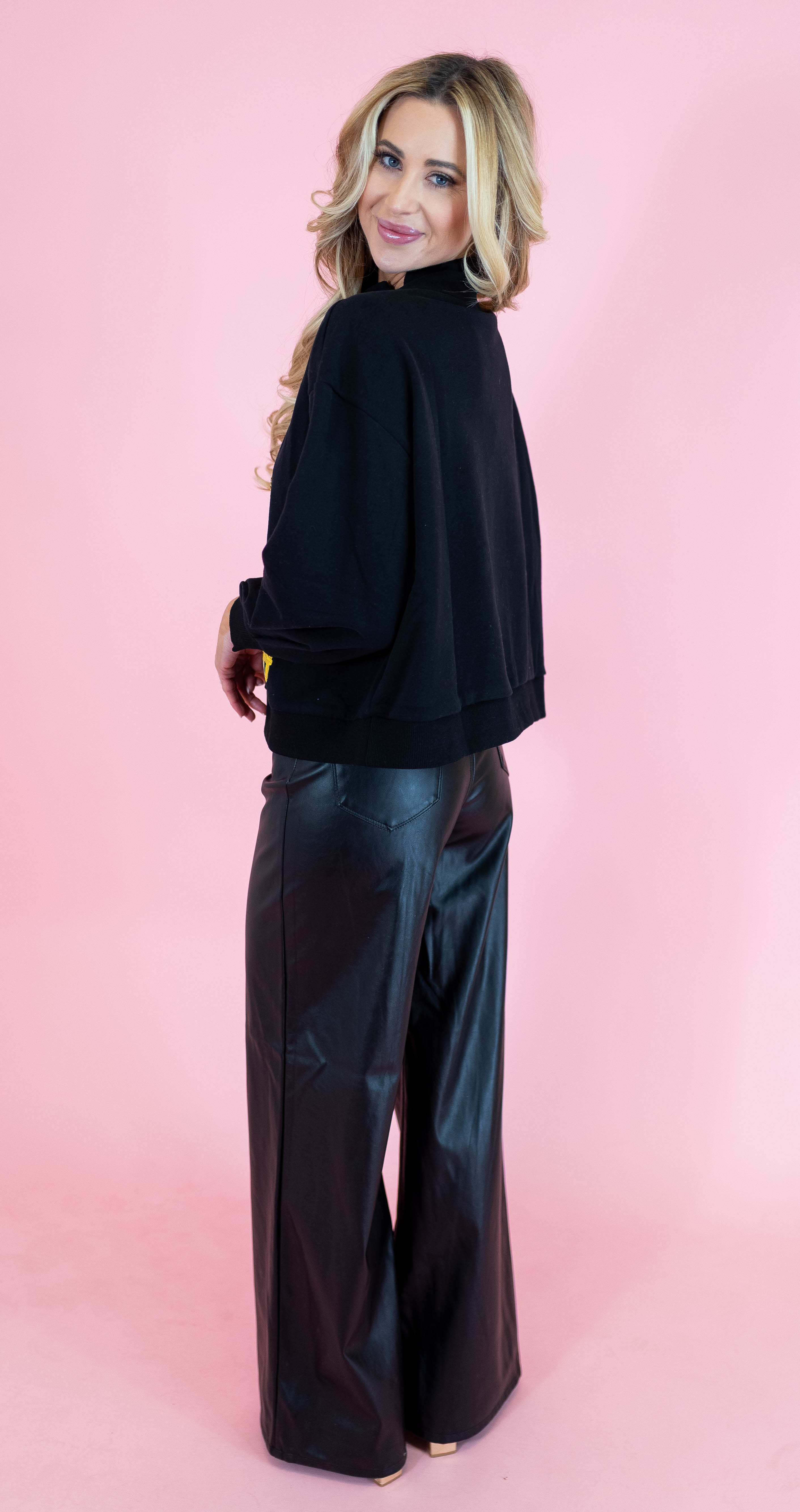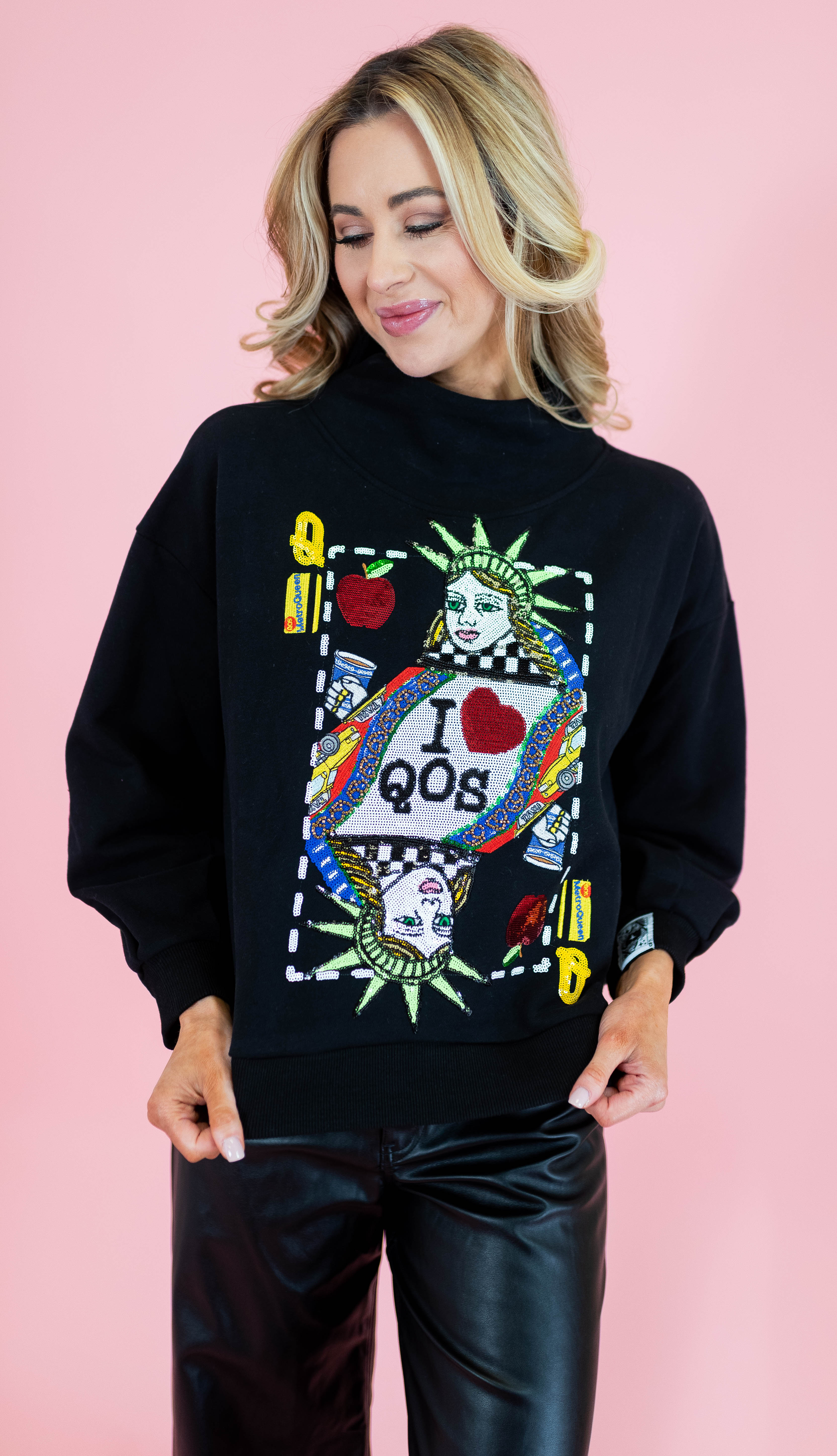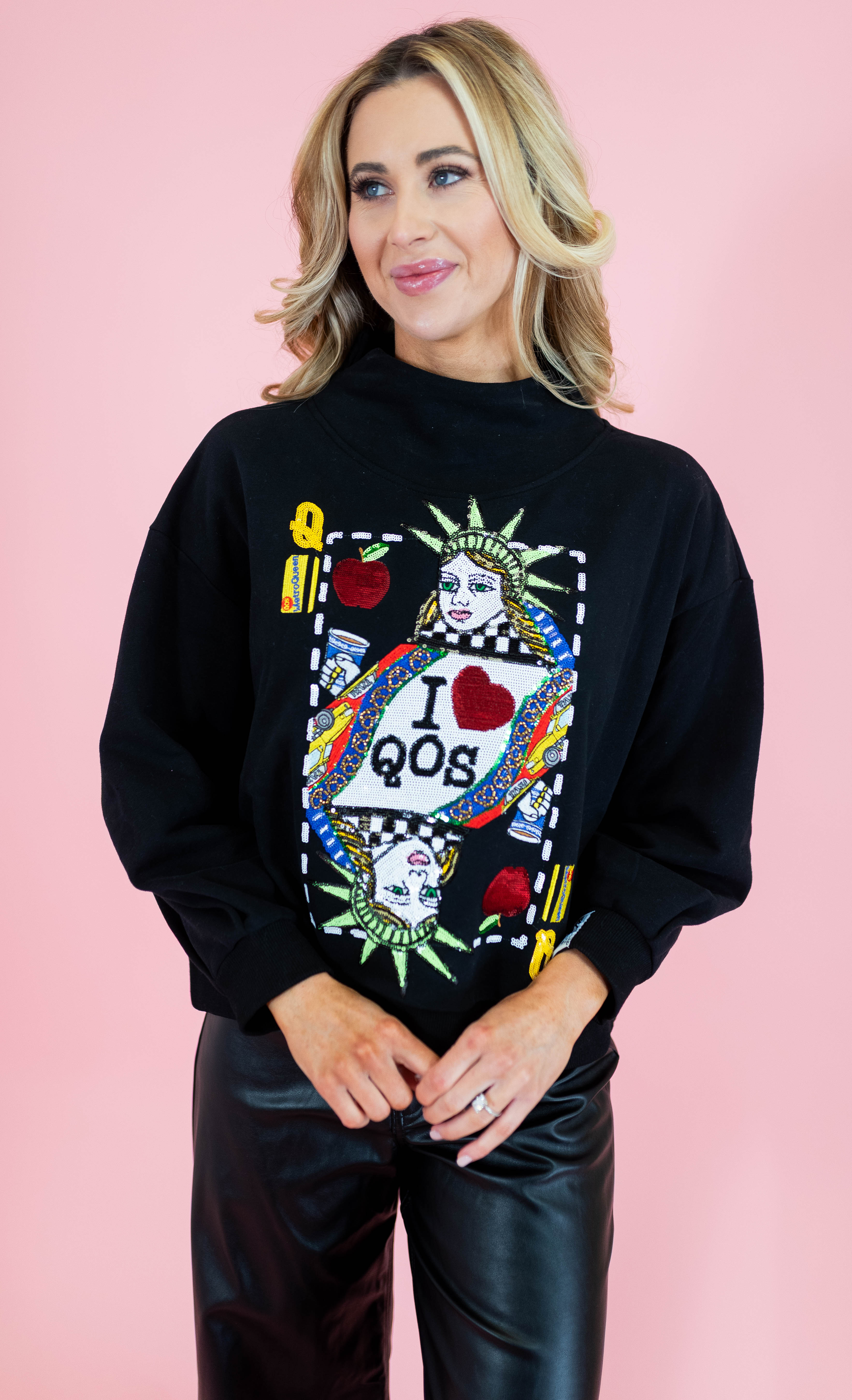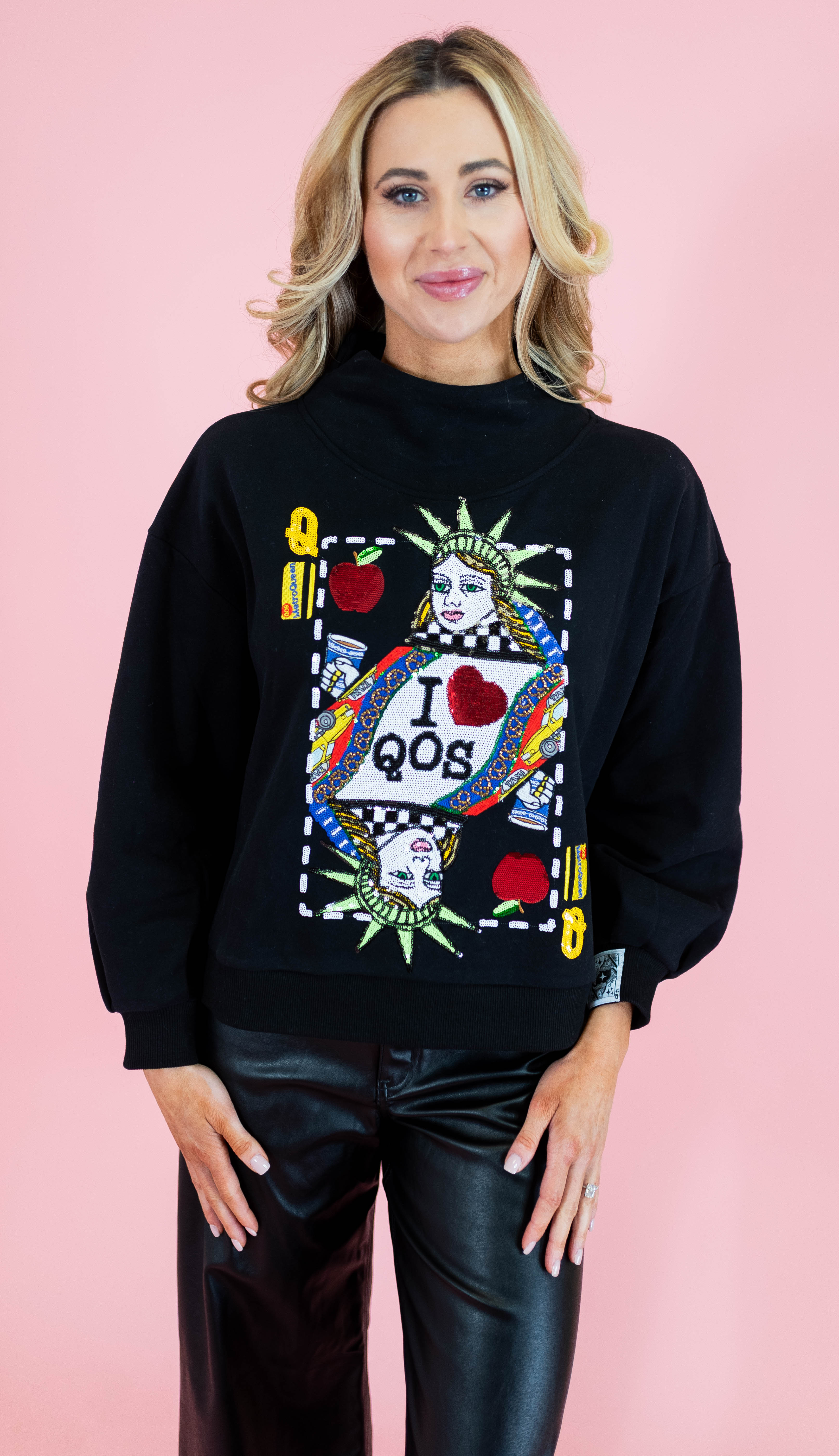 Elevate your everyday style with this chic mock neck sweatshirt from Queen Of Sparkles. Featuring a bold NYC Queen Card graphic, this black essential brings attitude and sparkle to your wardrobe. The cozy mock neck design offers comfort without compromise, while the eye-catching front design makes a statement wherever you go. Perfect for layering or wearing solo, this sweatshirt is your new go-to piece for looking effortlessly fabulous.