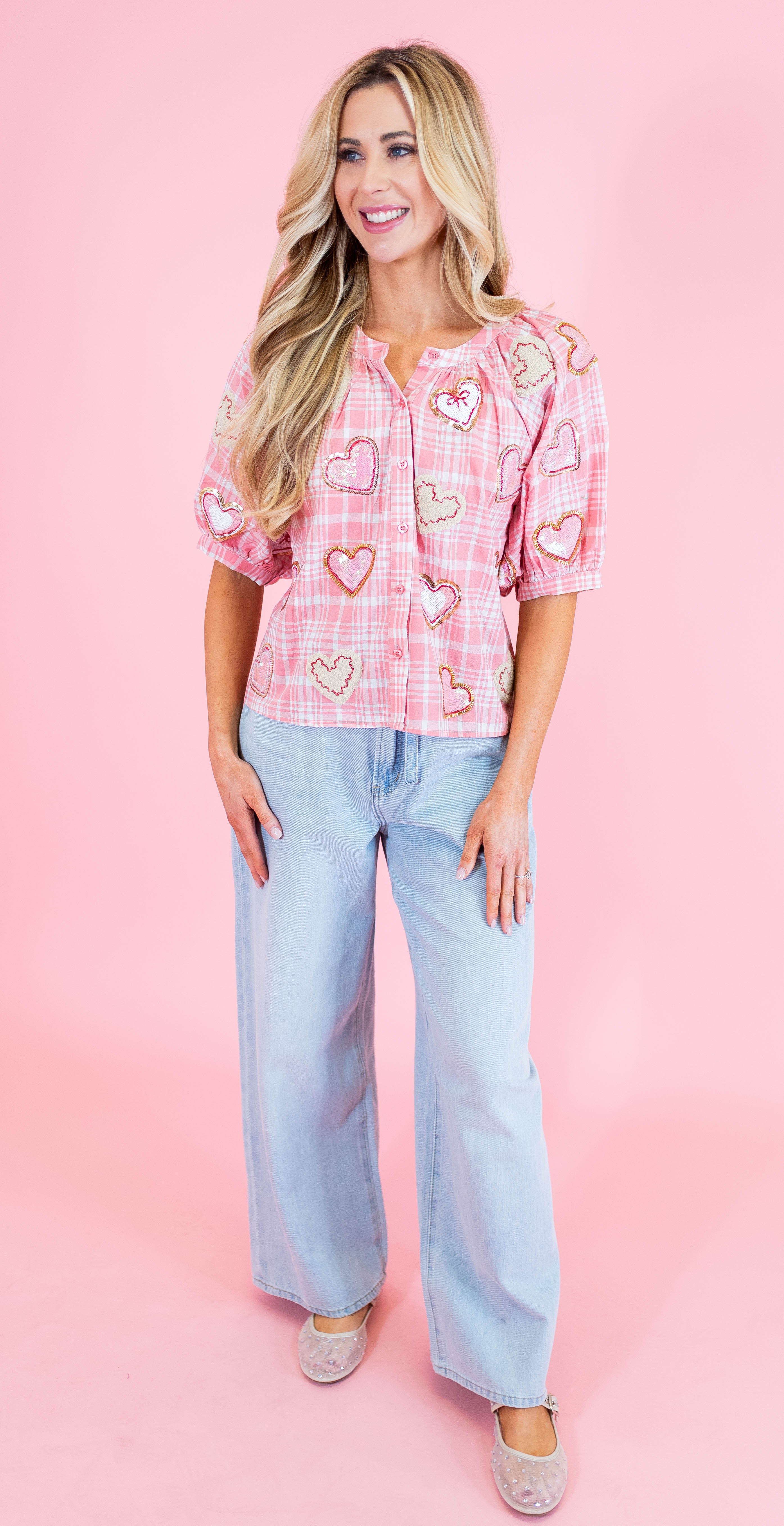 Spread the love this Valentine's Day in this adorable Queen Of Sparkles top! Featuring a charming pink and white plaid design with sweet heart-shaped cookie details, it's the perfect blend of cozy and cute. Whether you're celebrating with your sweetheart or treating yourself, this playful piece brings festive cheer and whimsical style to your seasonal wardrobe. A delightful choice for anyone who loves a touch of sparkle and sweetness.