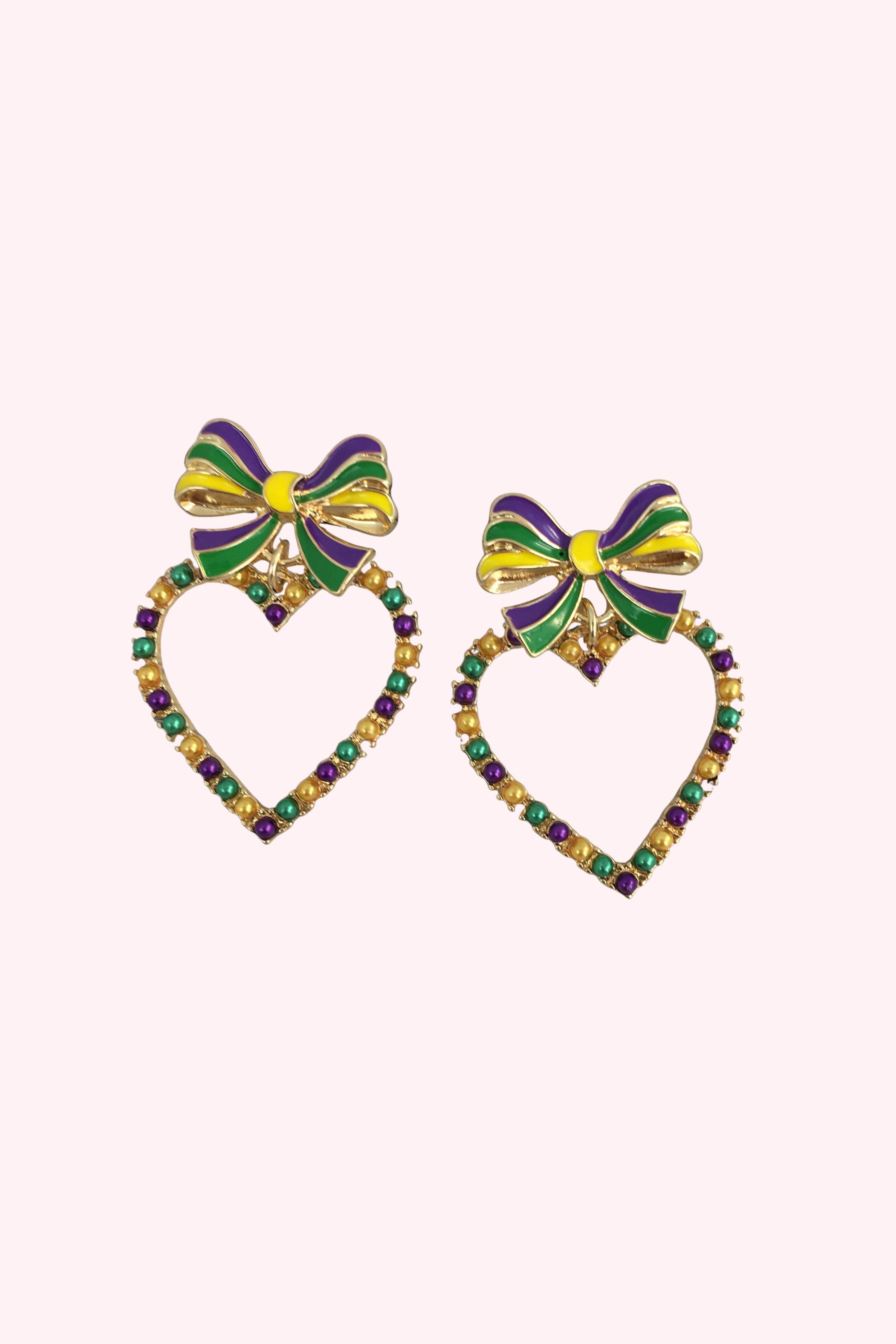 These are our gorgeous Mardi Gras bow heart earrings! These are feminine and beautiful and perfect for the Mardi Gras season!