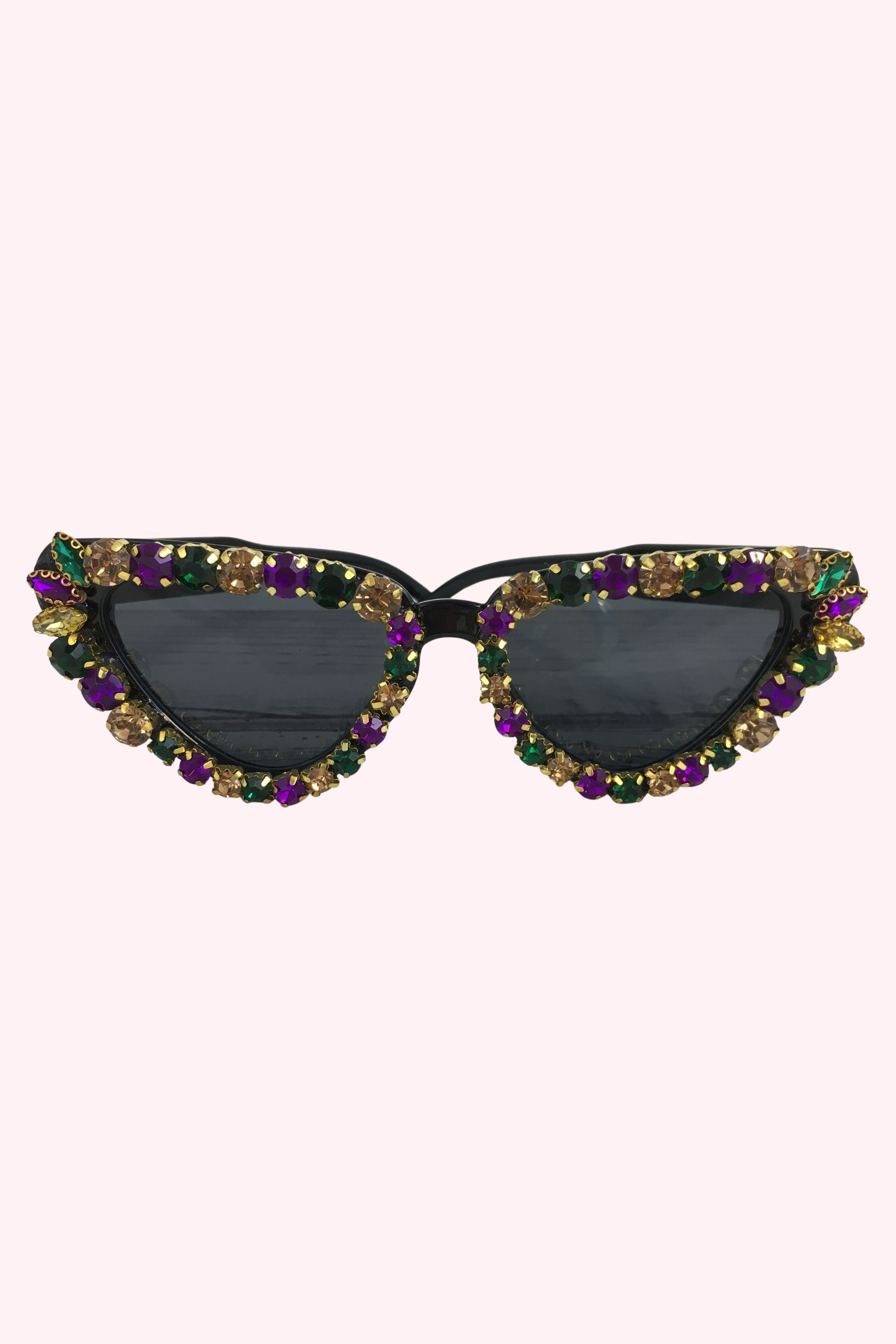 These are our gorgeous stone Mardi Gras sunglasses! These are so fun and practical and perfect for the Mardi Gras season!
