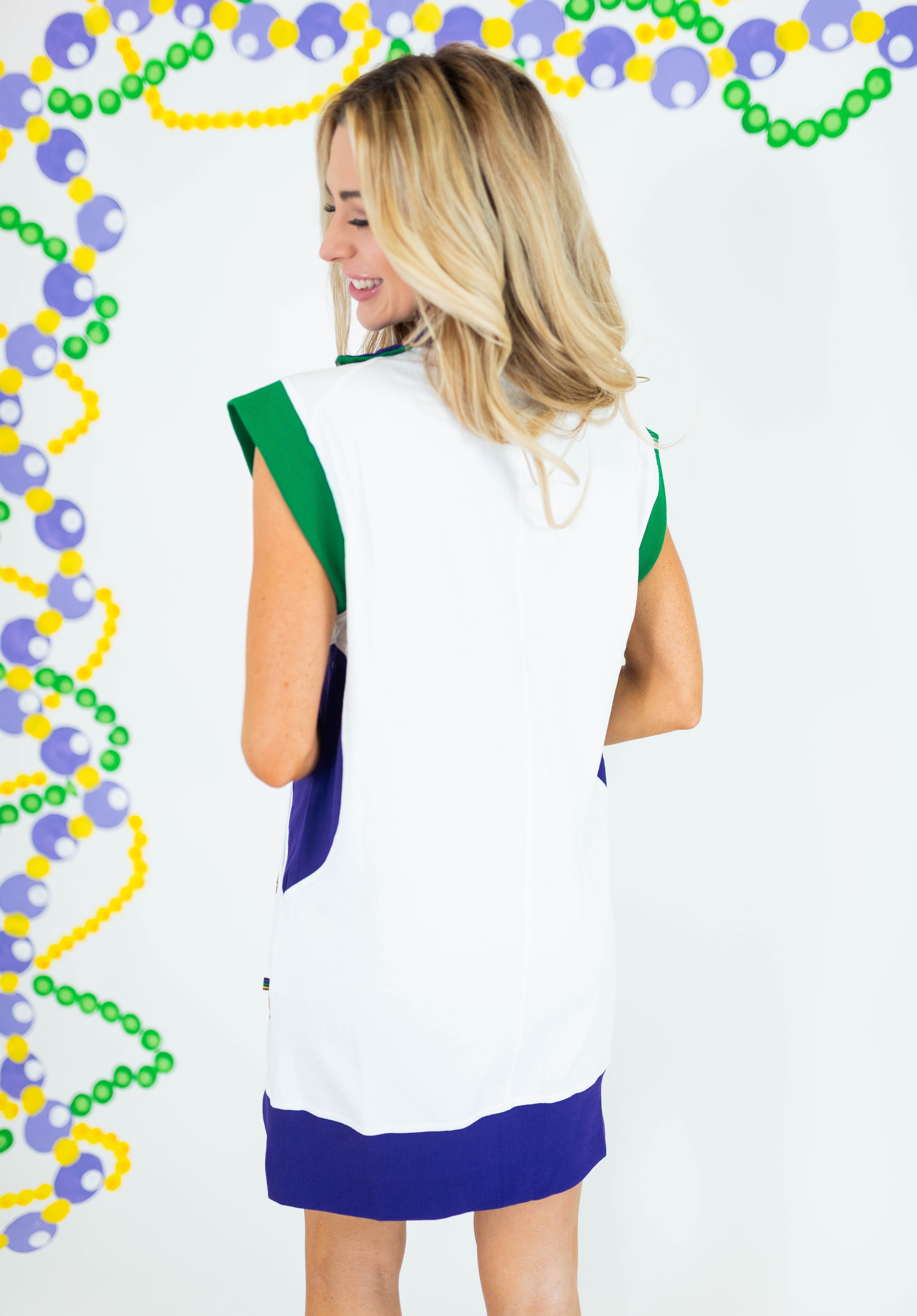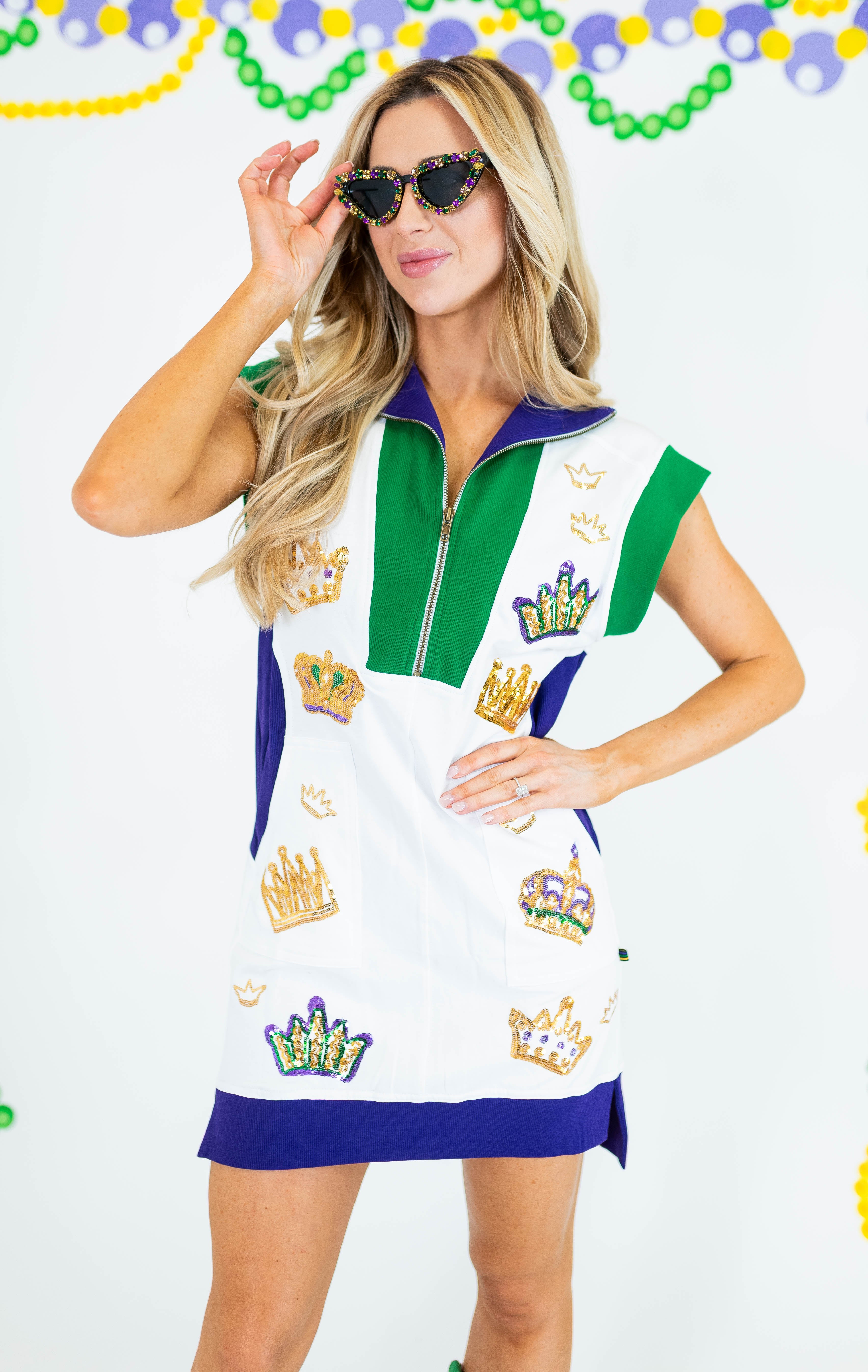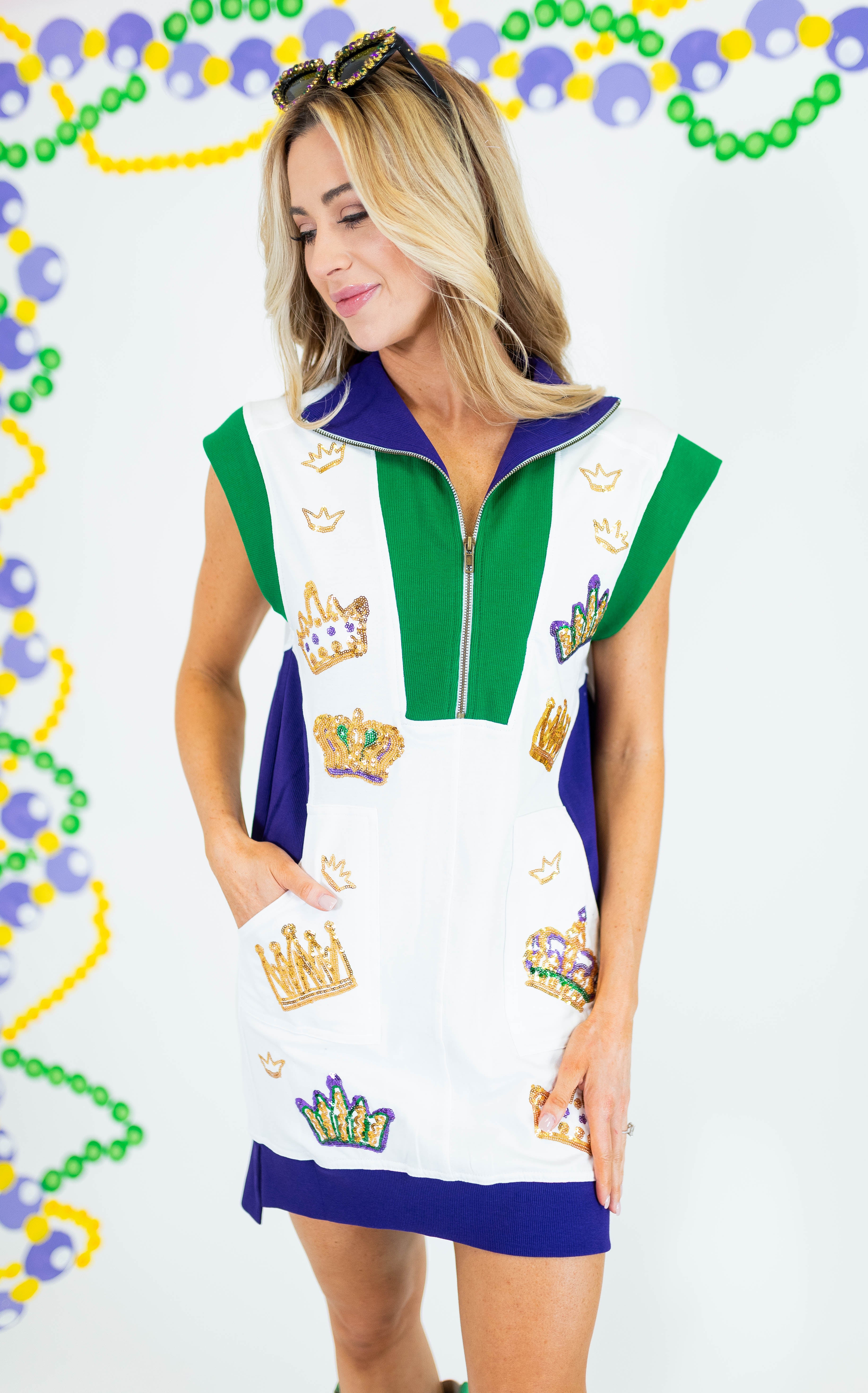 Add a playful tennis-inspired touch to your Mardi Gras look with this colorblock half zip dress! Featuring an allover Mardi Gras design of assorted crowns, it's perfect for a fun and unique look on and off the court and route. Wear it on its own or layer it over leggings for a versatile outfit. Game, set, match!
