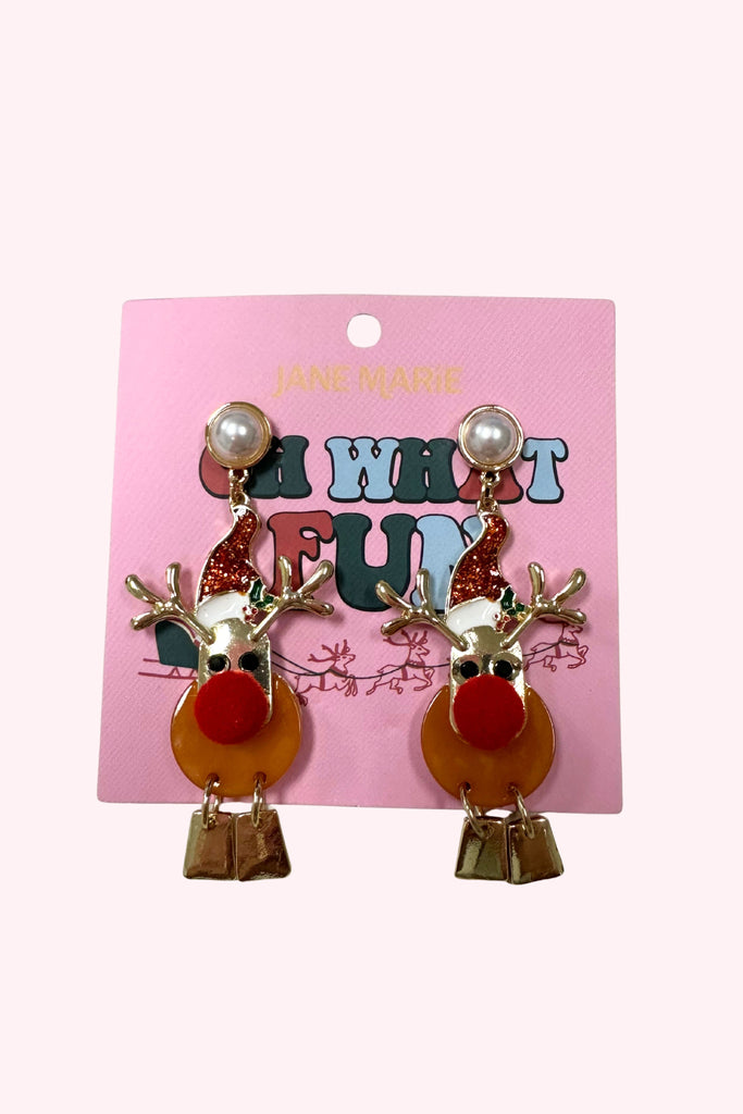 Bring joyful holiday spirit to your look with these Reindeer w/ Red Pom Post Earrings. Featuring a charming brown, gold, red, and white reindeer design accented by a playful red pom-pom nose and a delicate pearl circle post, these earrings offer a perfect mix of whimsy and elegance. Lightweight and festive, they easily complement any seasonal outfit, making them ideal for holiday gatherings or as a thoughtful gift for someone who loves unique holiday accessories. Add a touch of festive fun with these delightful earrings.
