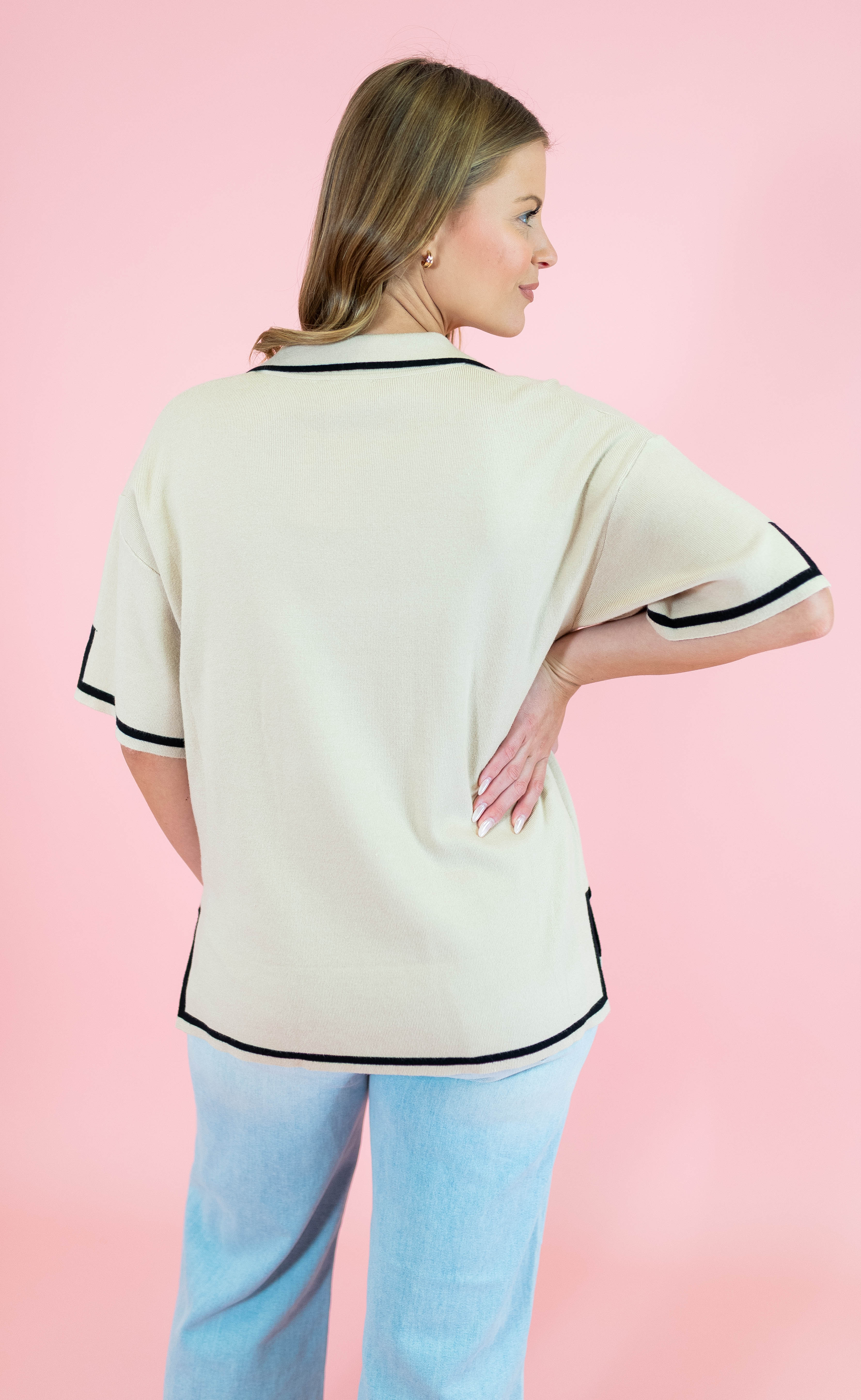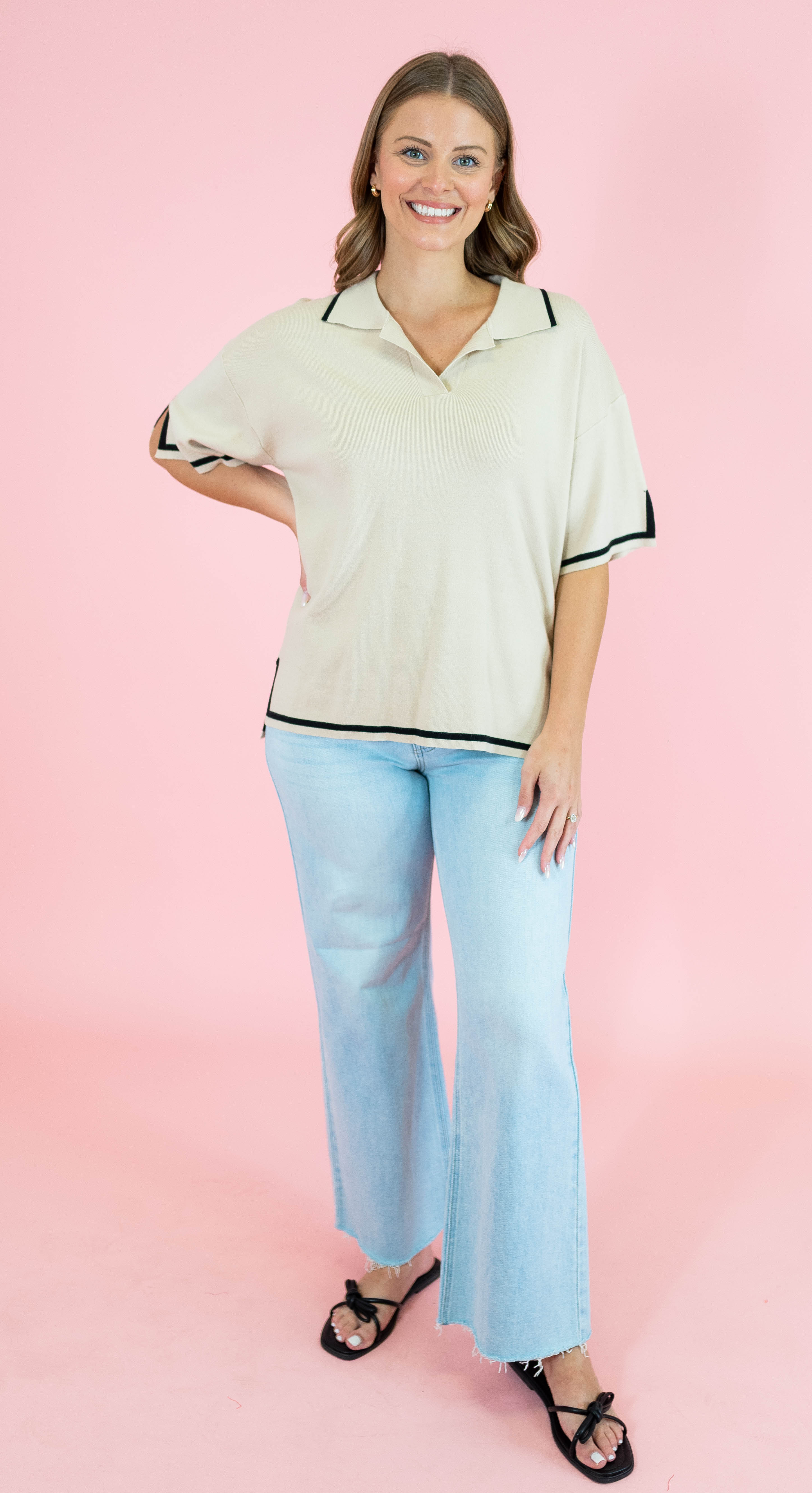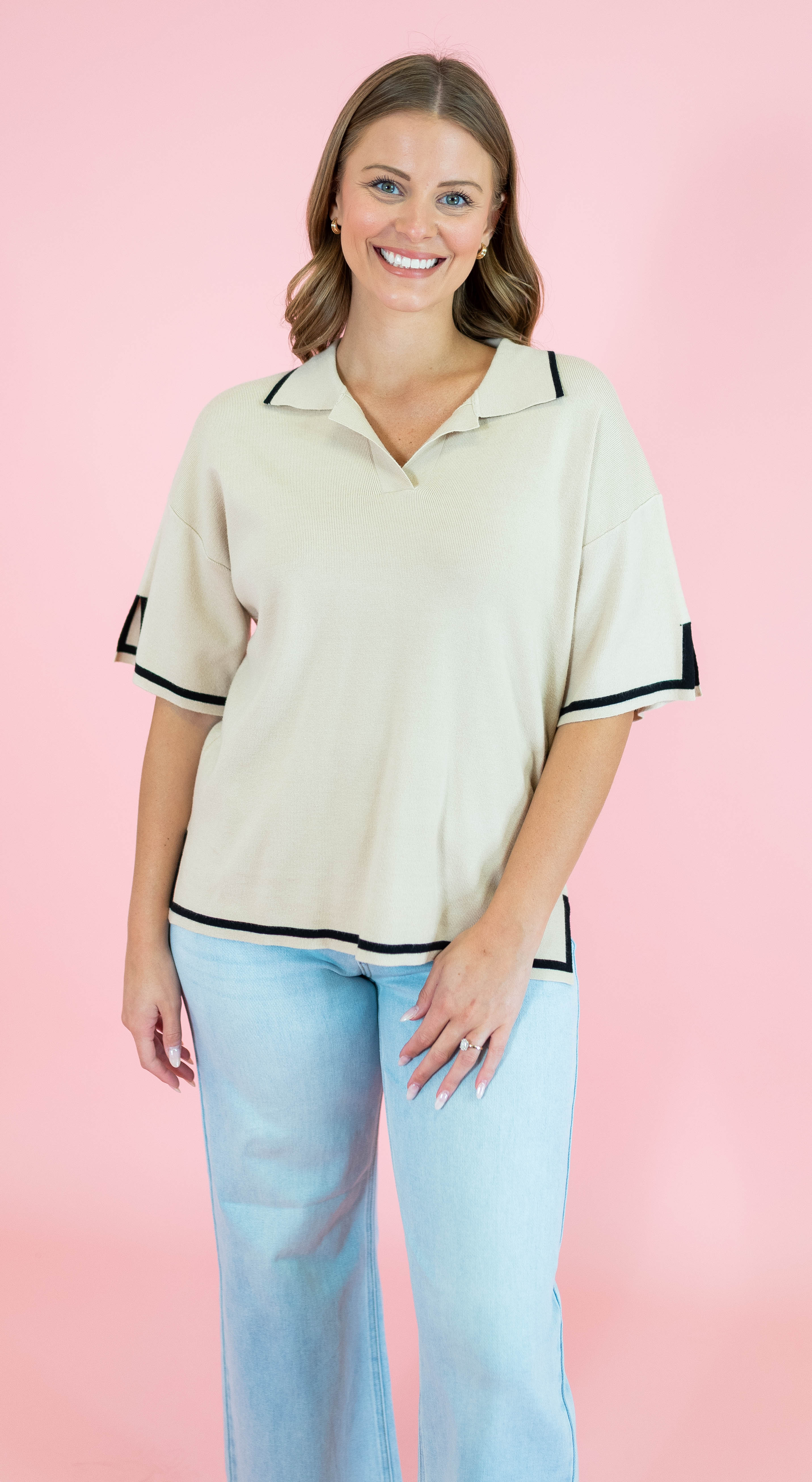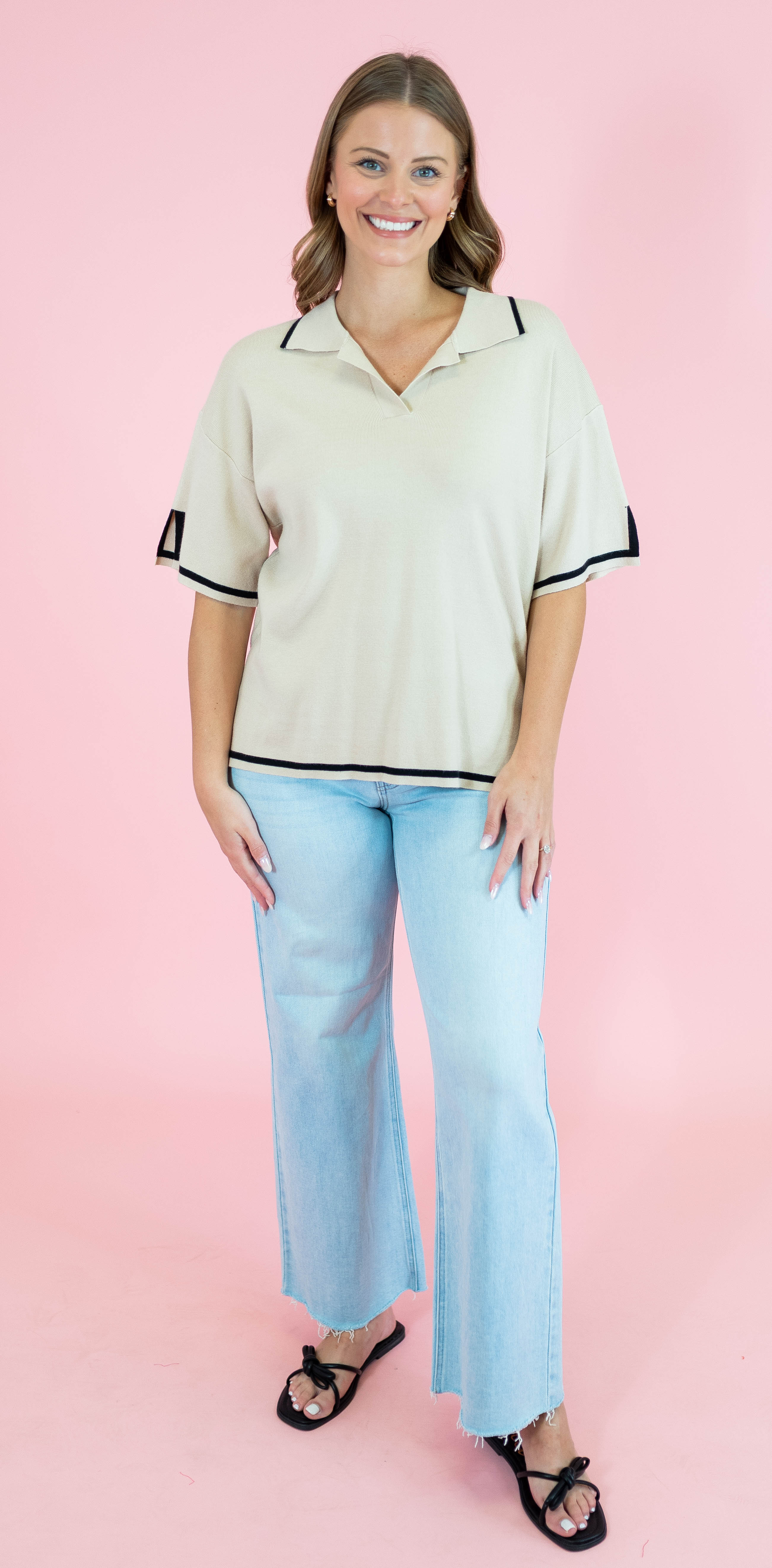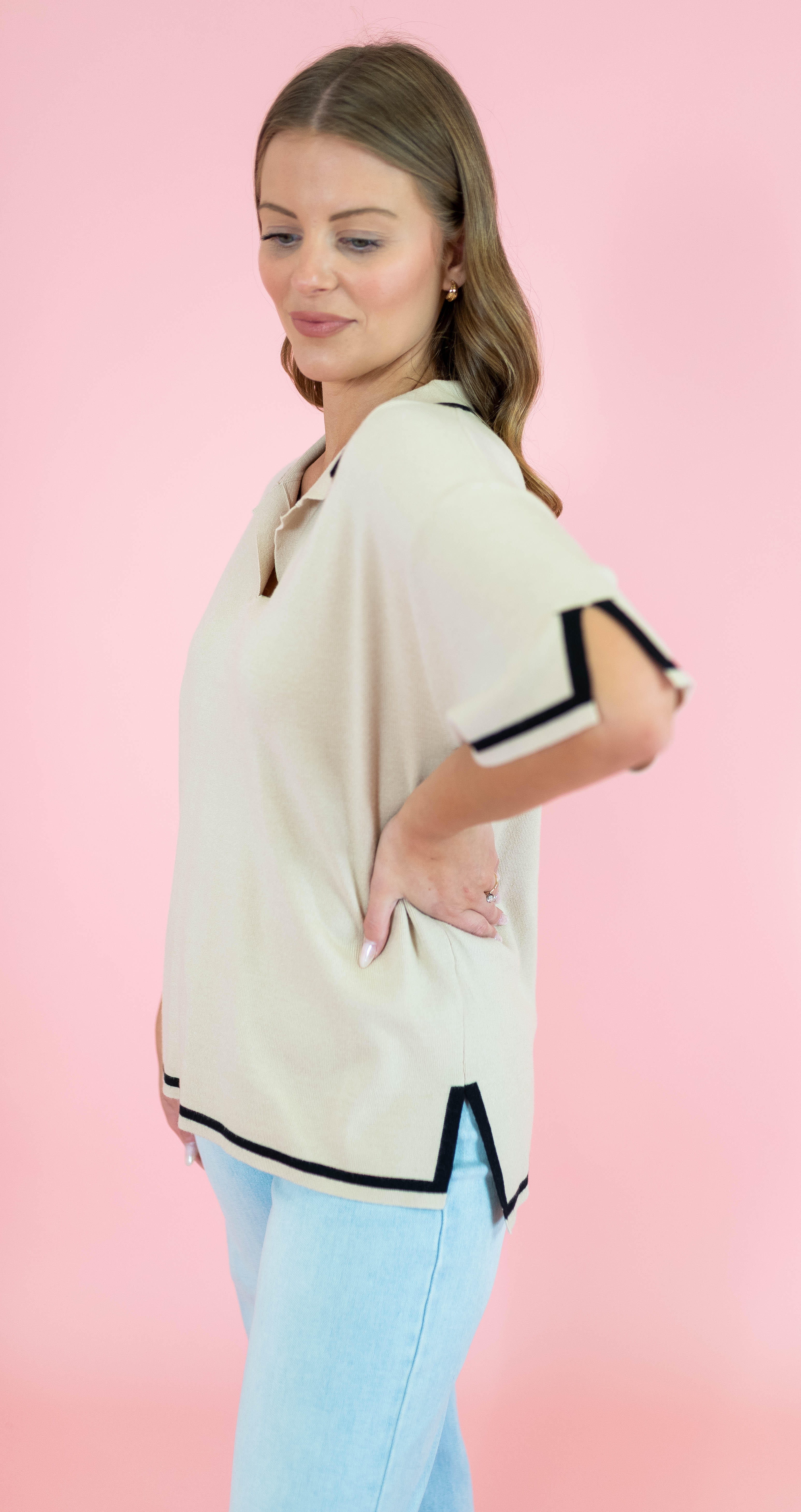 Half Sleeve Contrast Hem Collared Sweater - Taupe