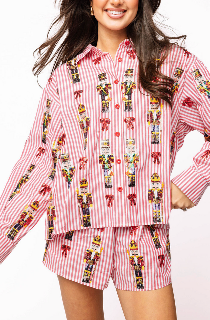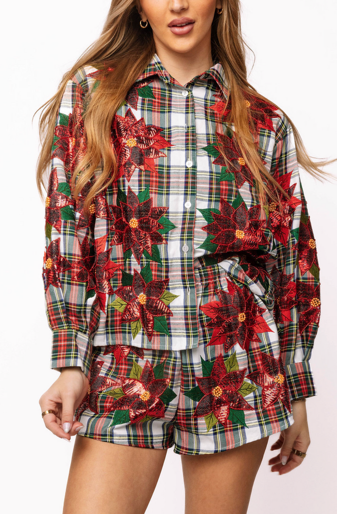 Queen Of Sparkles: Plaid Poinsettia Button Up Top