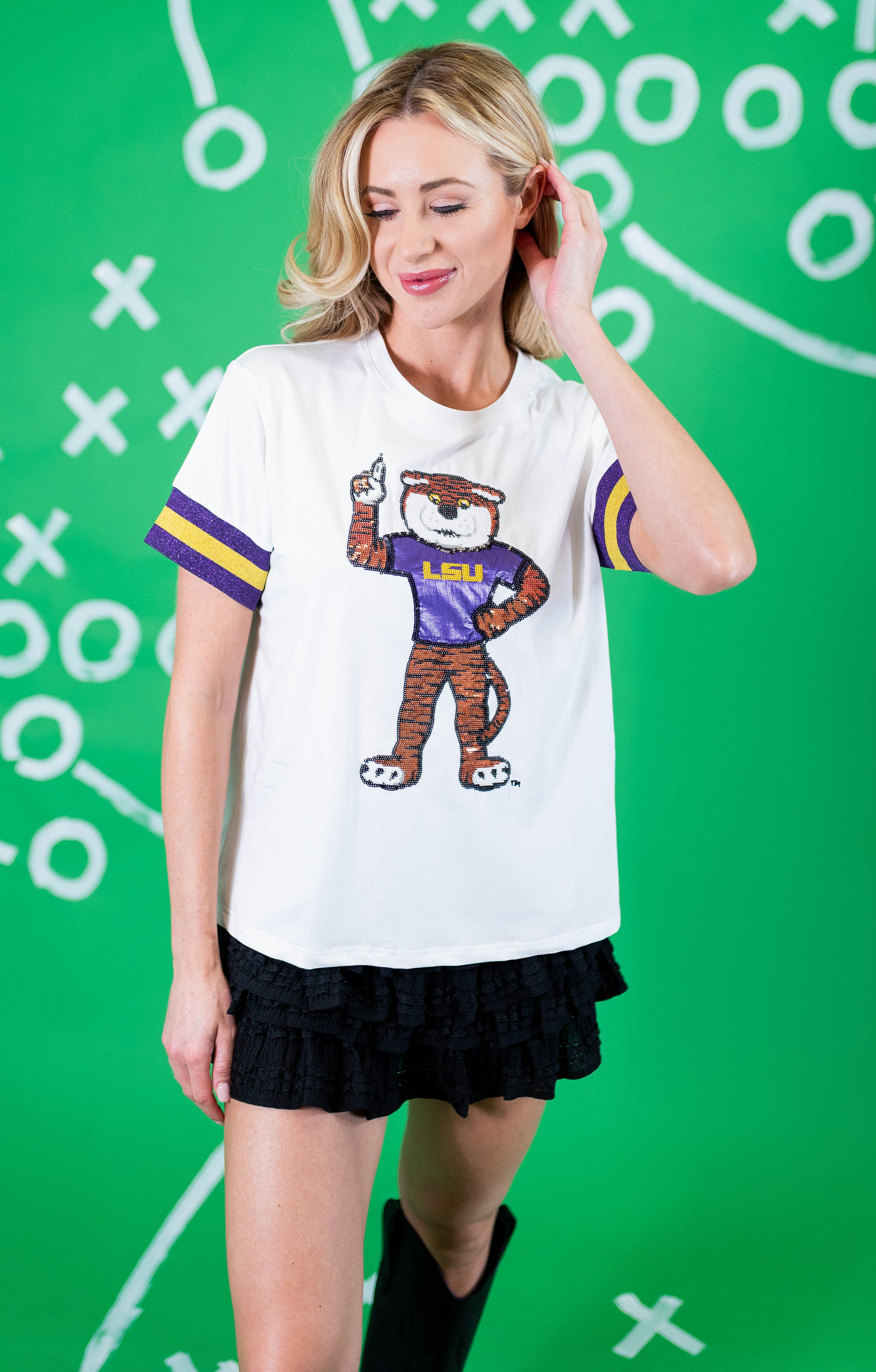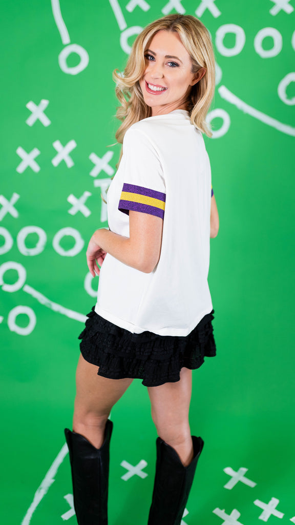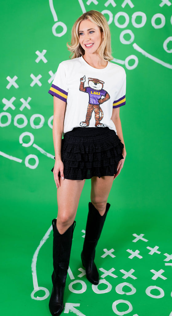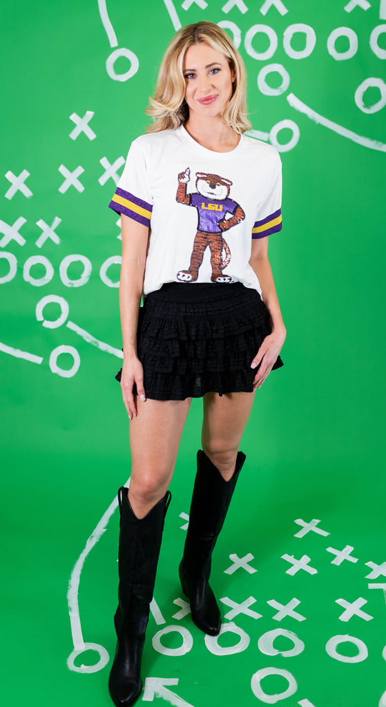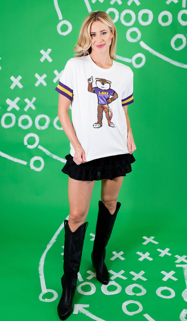 The LSU Sparkle Logo T-Shirt is a soft, cotton tee with a bit of spandex stretch for maximum comfort and wearability. It features sparkly university logo on chest with beautiful embroidered and appliqué details with stripe trim on sleeves in team colors.