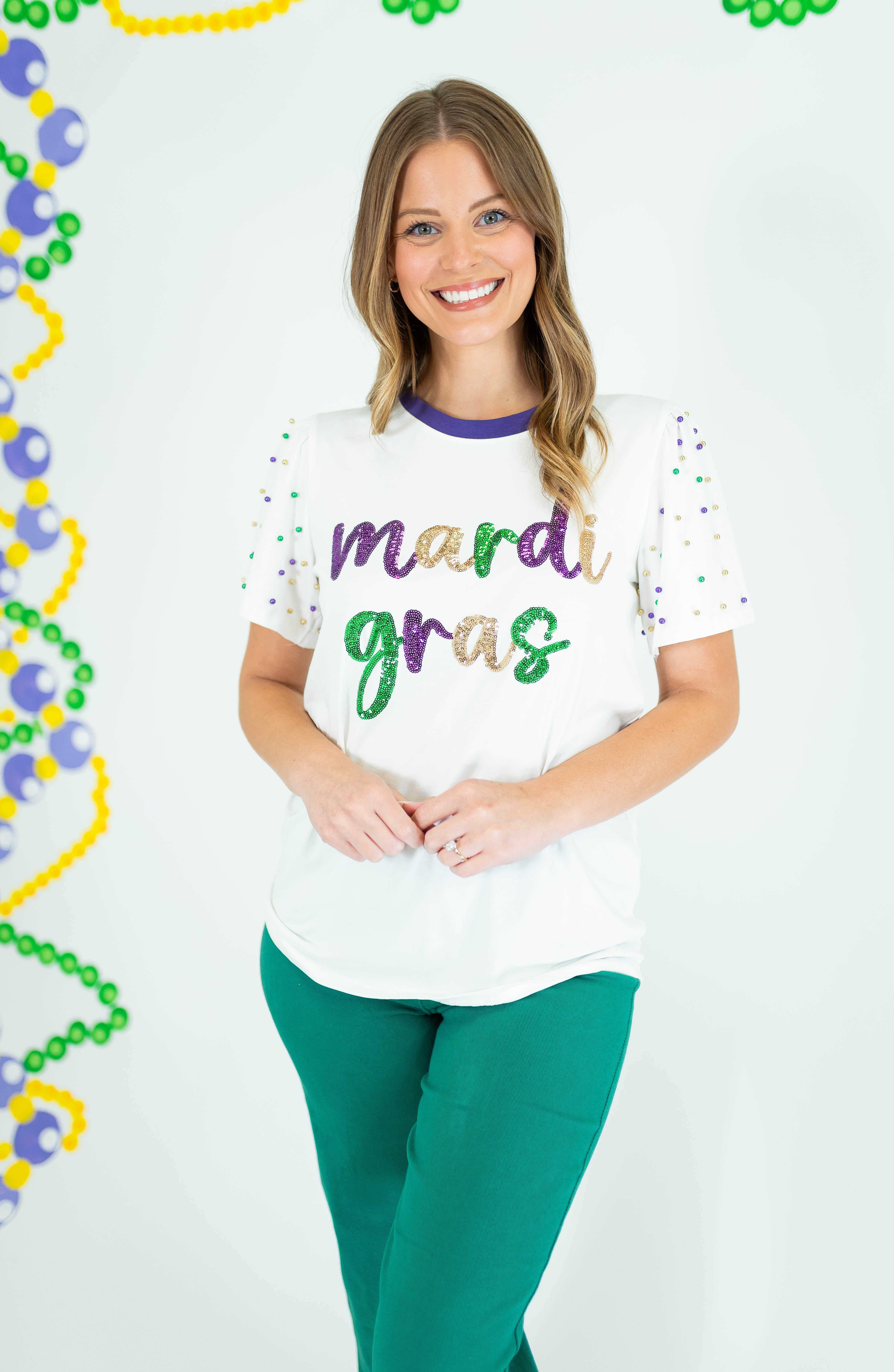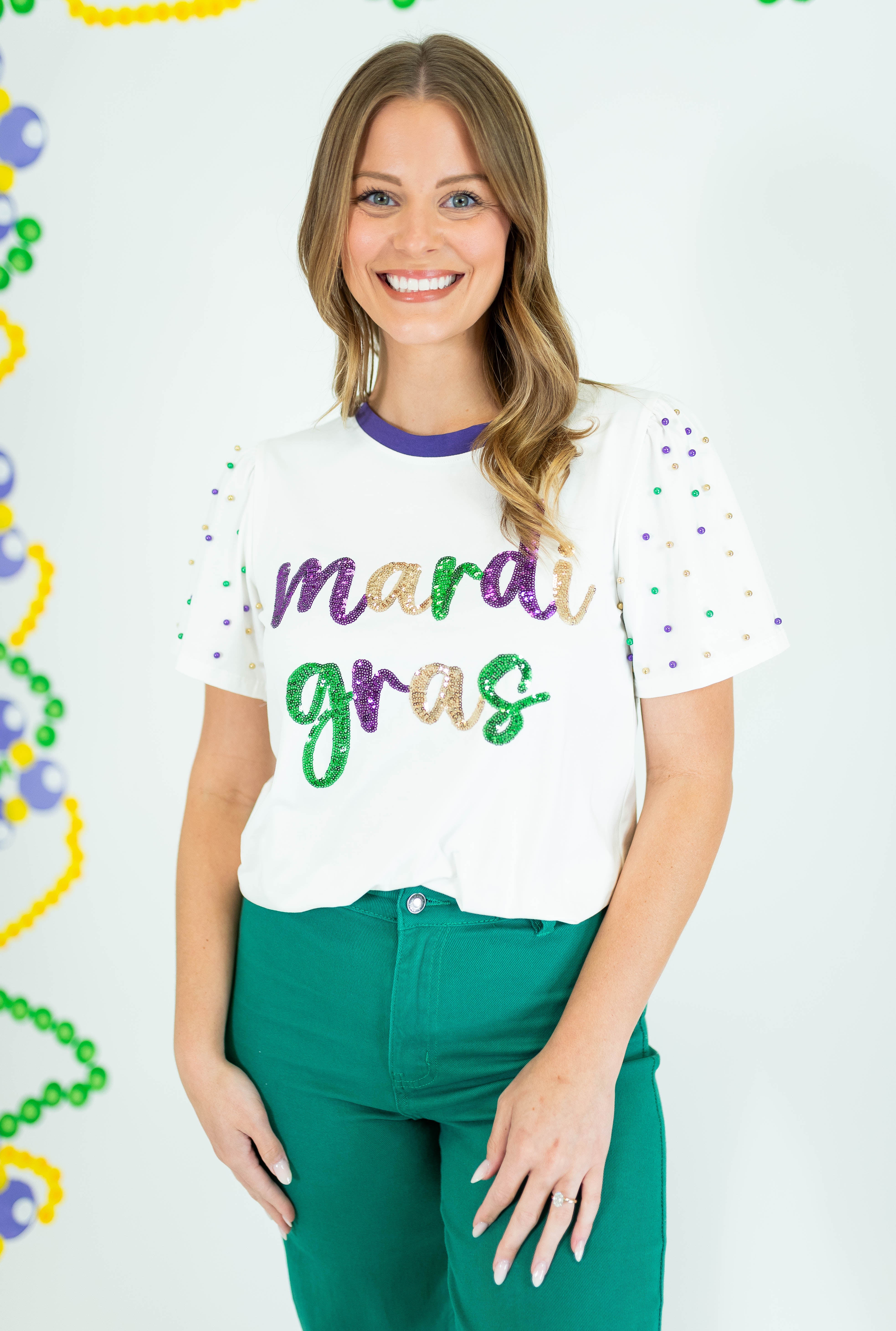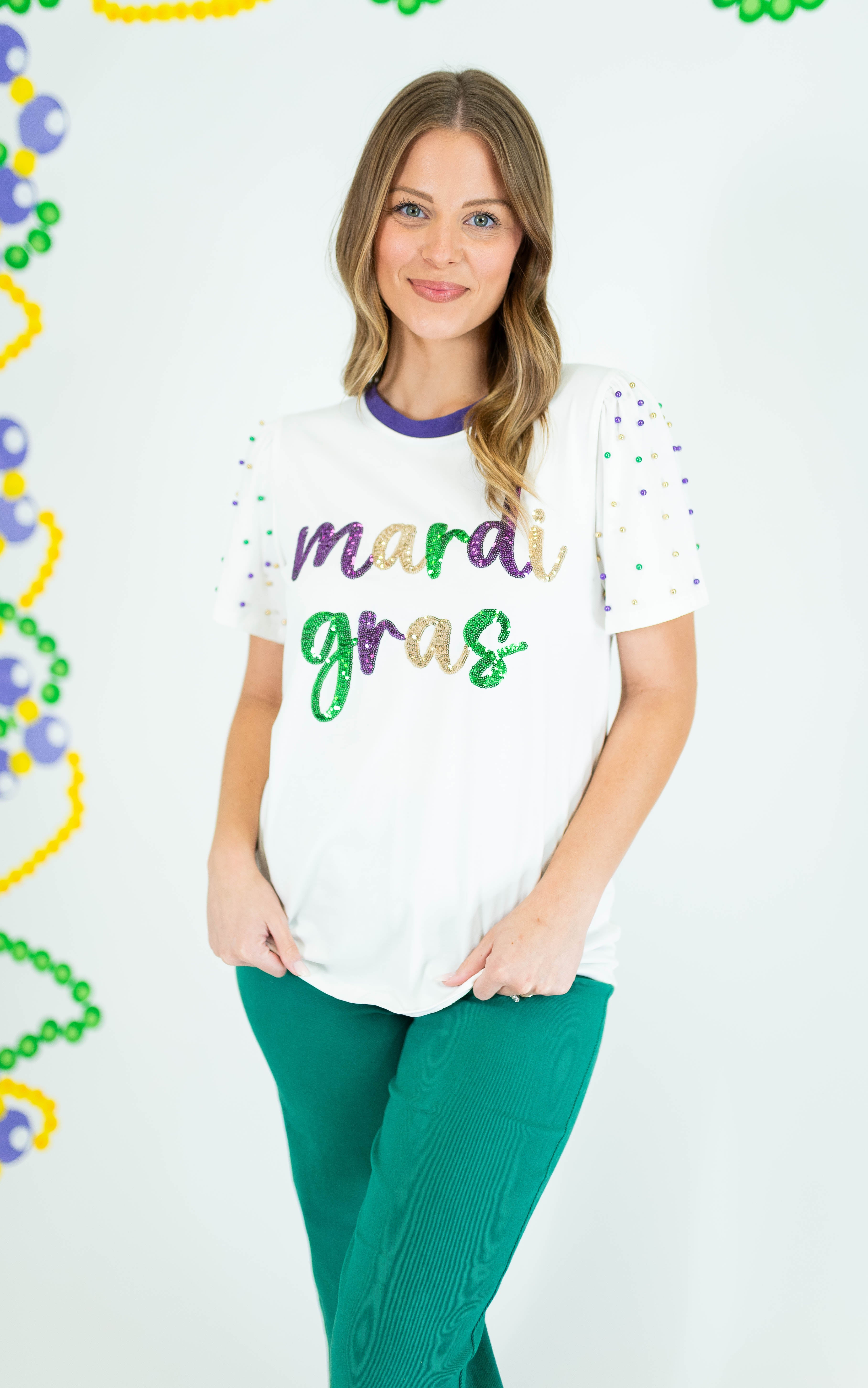 Shine bright at every celebration with this stunning Sequin Mardi Gras Princess Top. Crafted in crisp white with eye-catching pearl detailing adorning the sleeves, this piece delivers instant glamour and festive flair. The luxurious sequin embellishments catch the light beautifully, making you the center of attention whether you're dancing at Mardi Gras or attending an upscale event. Perfect for anyone seeking a show-stopping top that combines elegance with playful sparkle. Elevate your party wardrobe and embrace your inner princess.