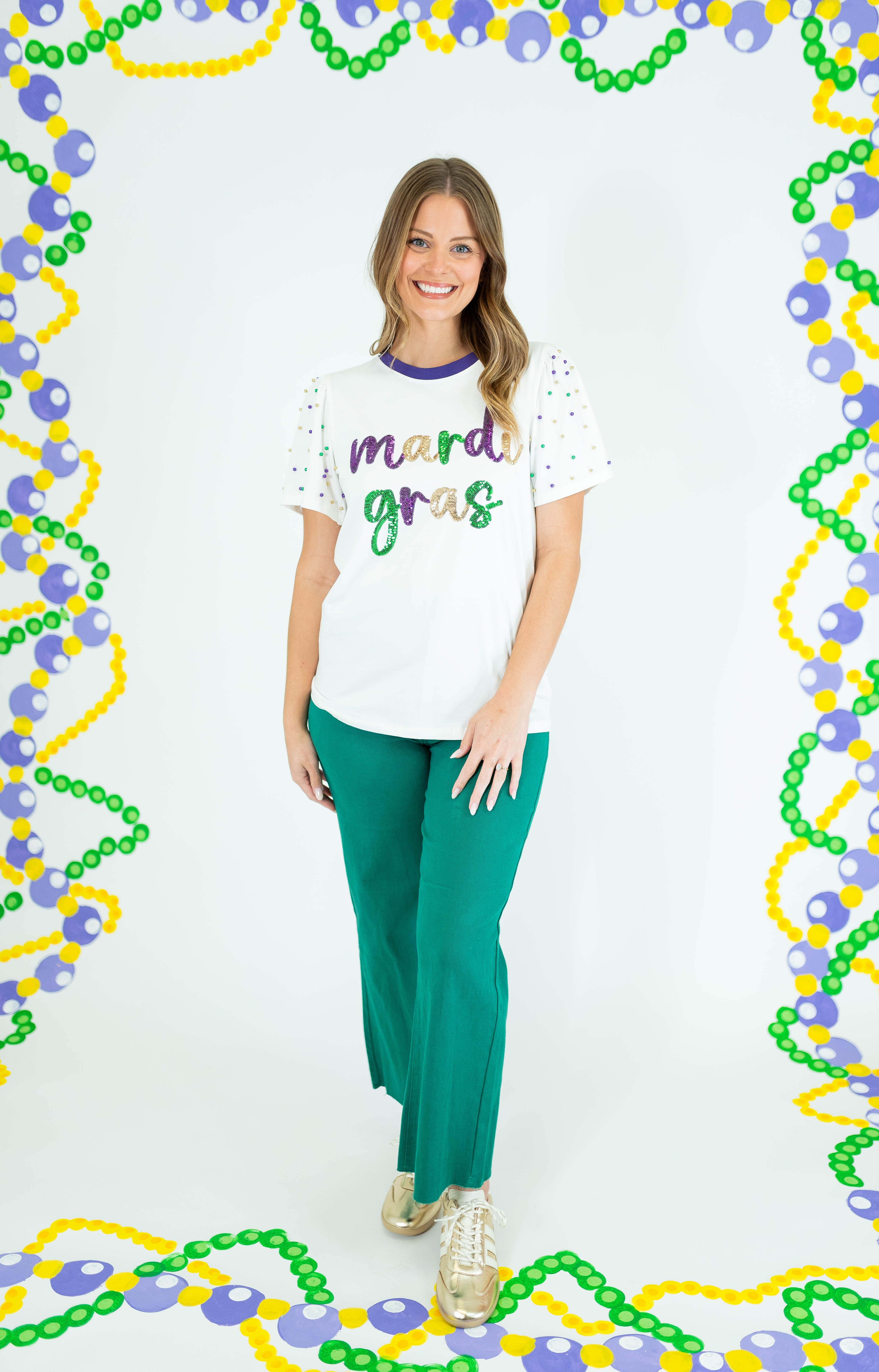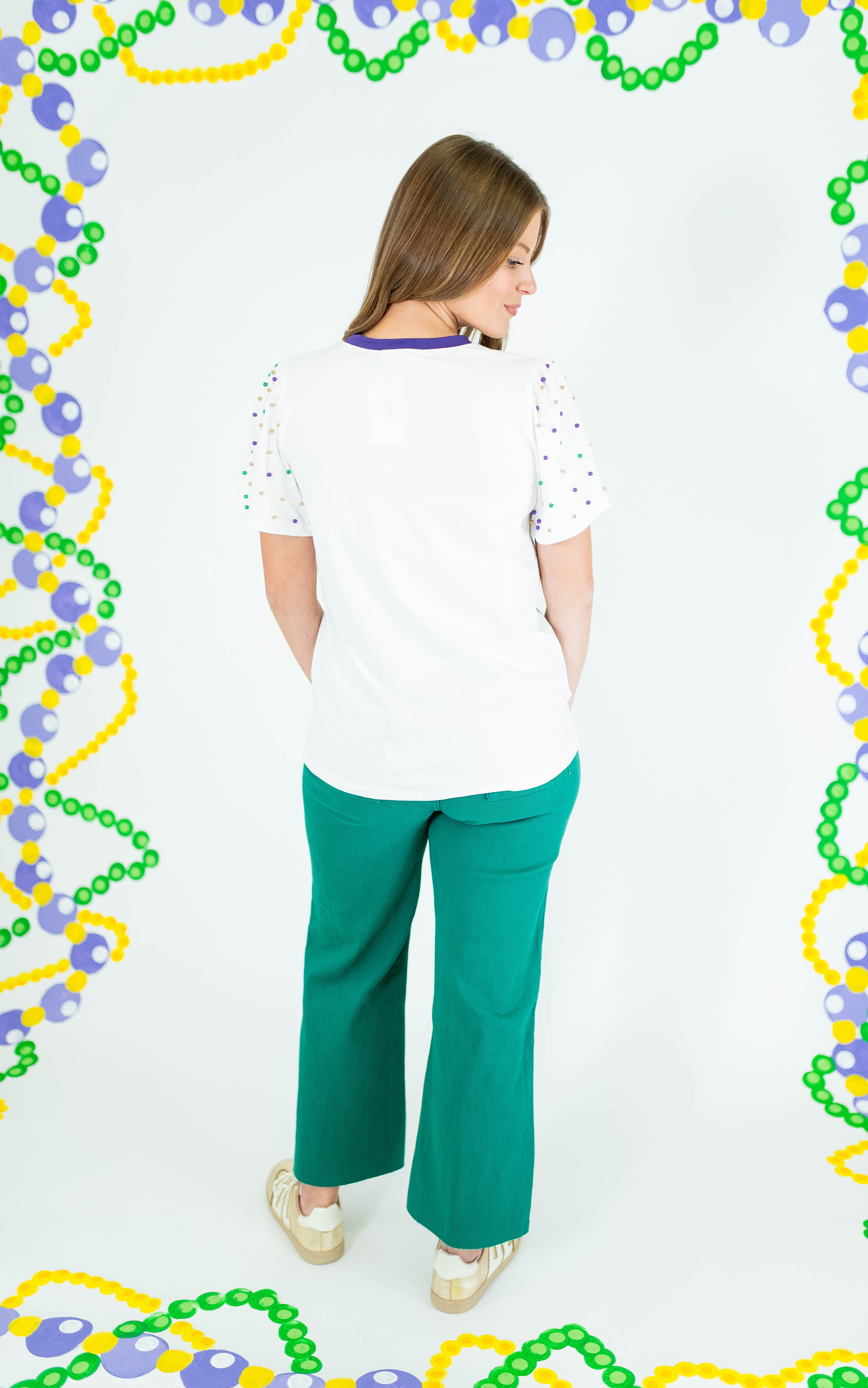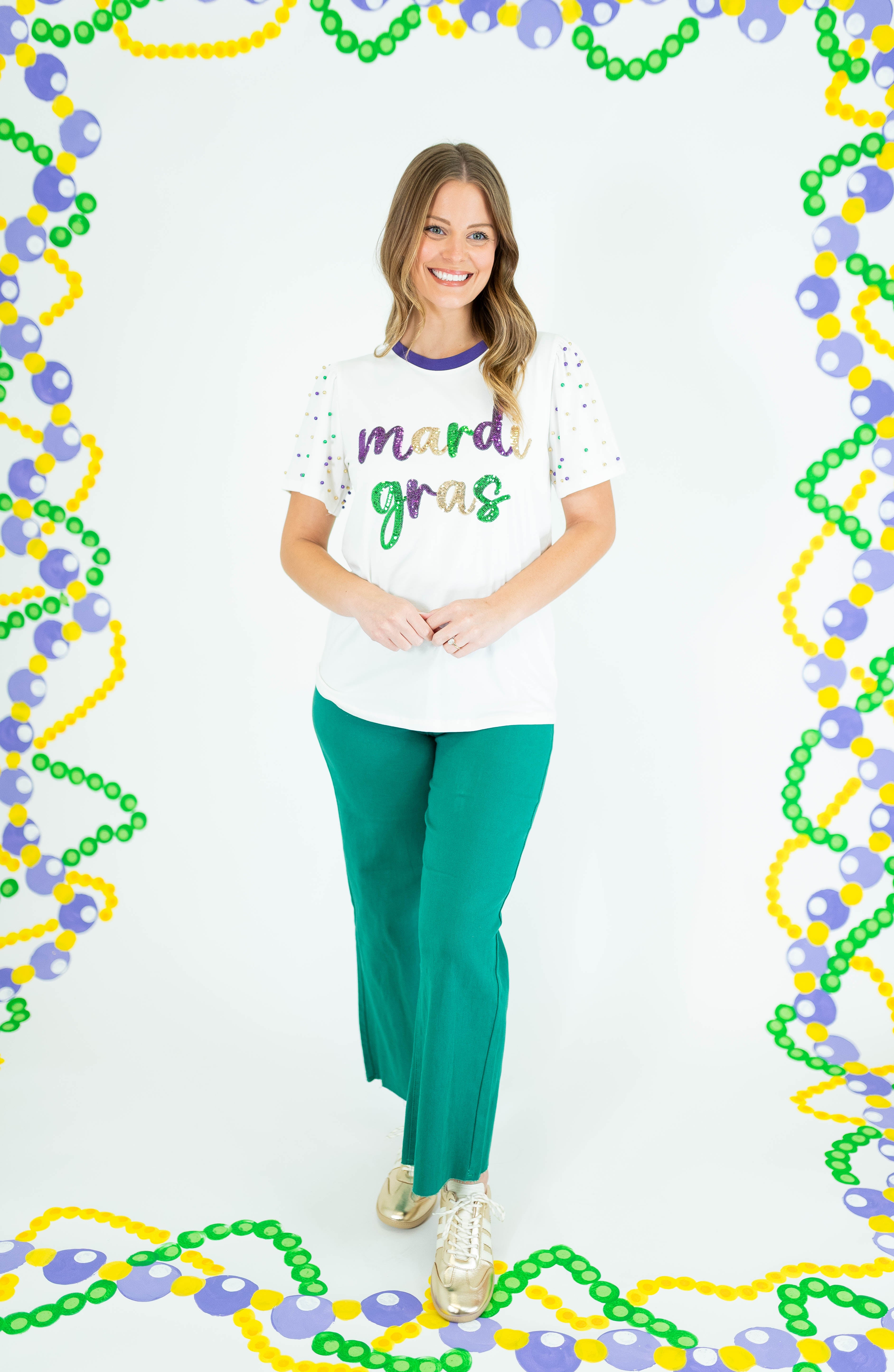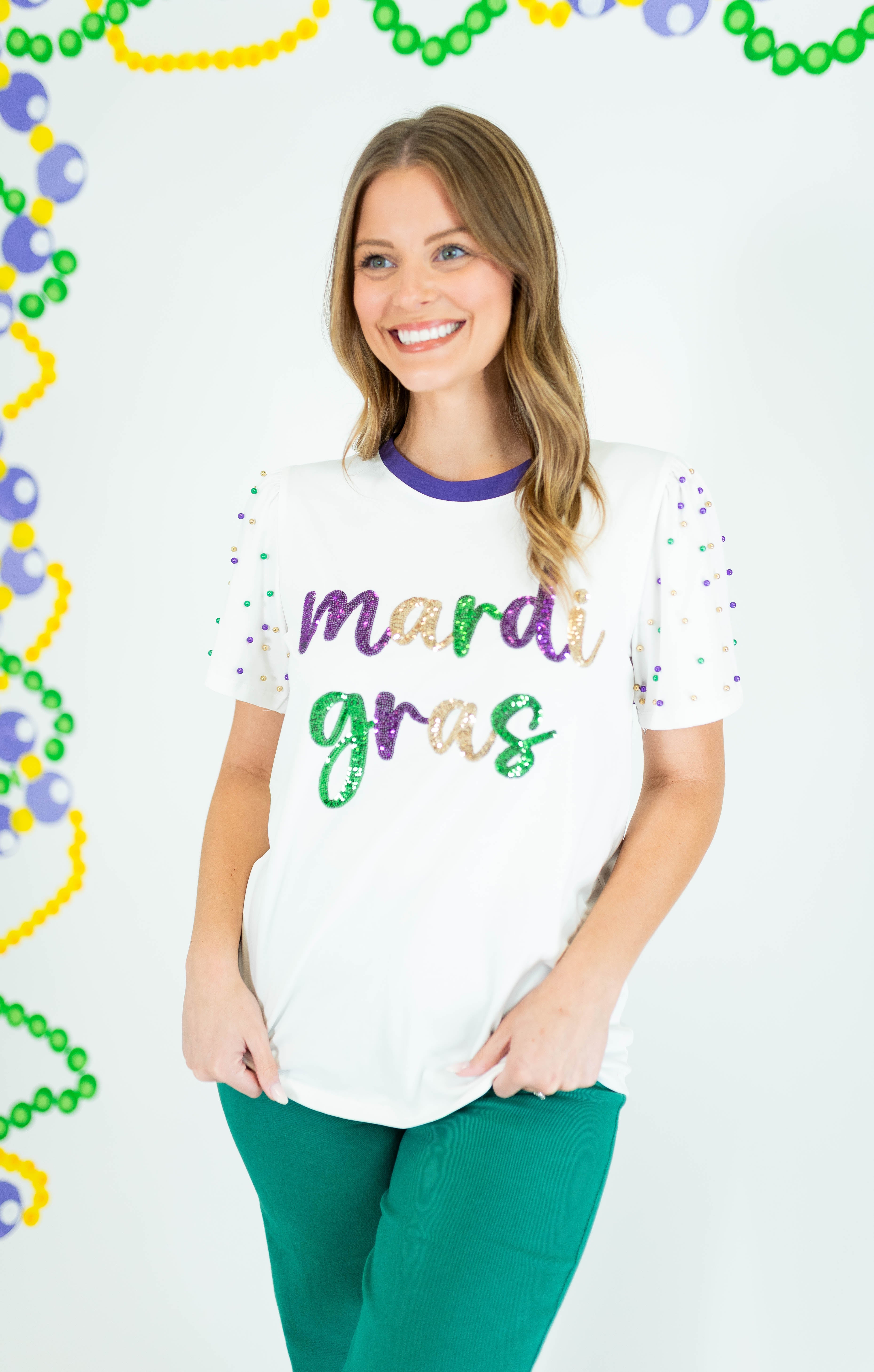 Shine bright at every celebration with this stunning Sequin Mardi Gras Princess Top. Crafted in crisp white with eye-catching pearl detailing adorning the sleeves, this piece delivers instant glamour and festive flair. The luxurious sequin embellishments catch the light beautifully, making you the center of attention whether you're dancing at Mardi Gras or attending an upscale event. Perfect for anyone seeking a show-stopping top that combines elegance with playful sparkle. Elevate your party wardrobe and embrace your inner princess.
