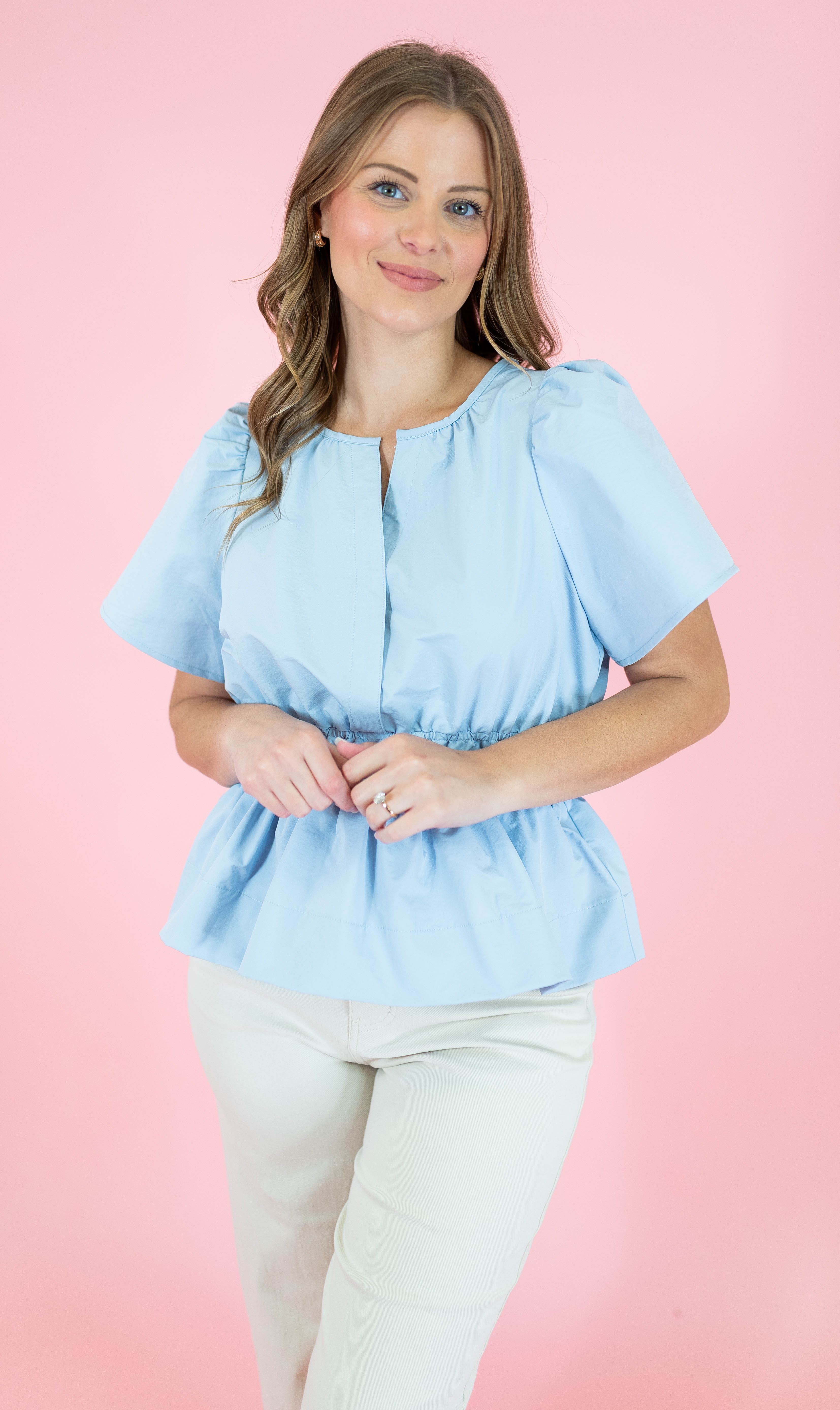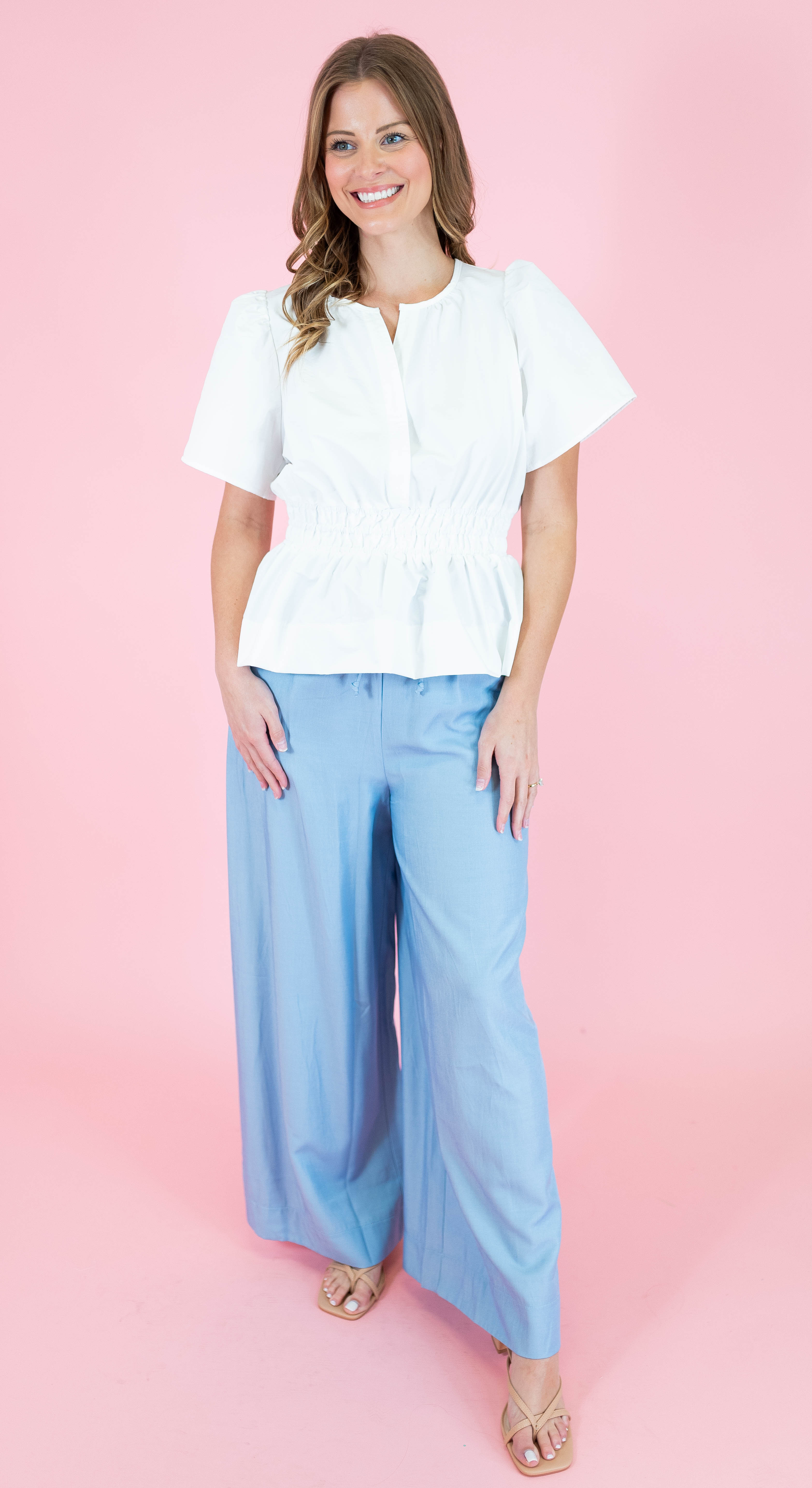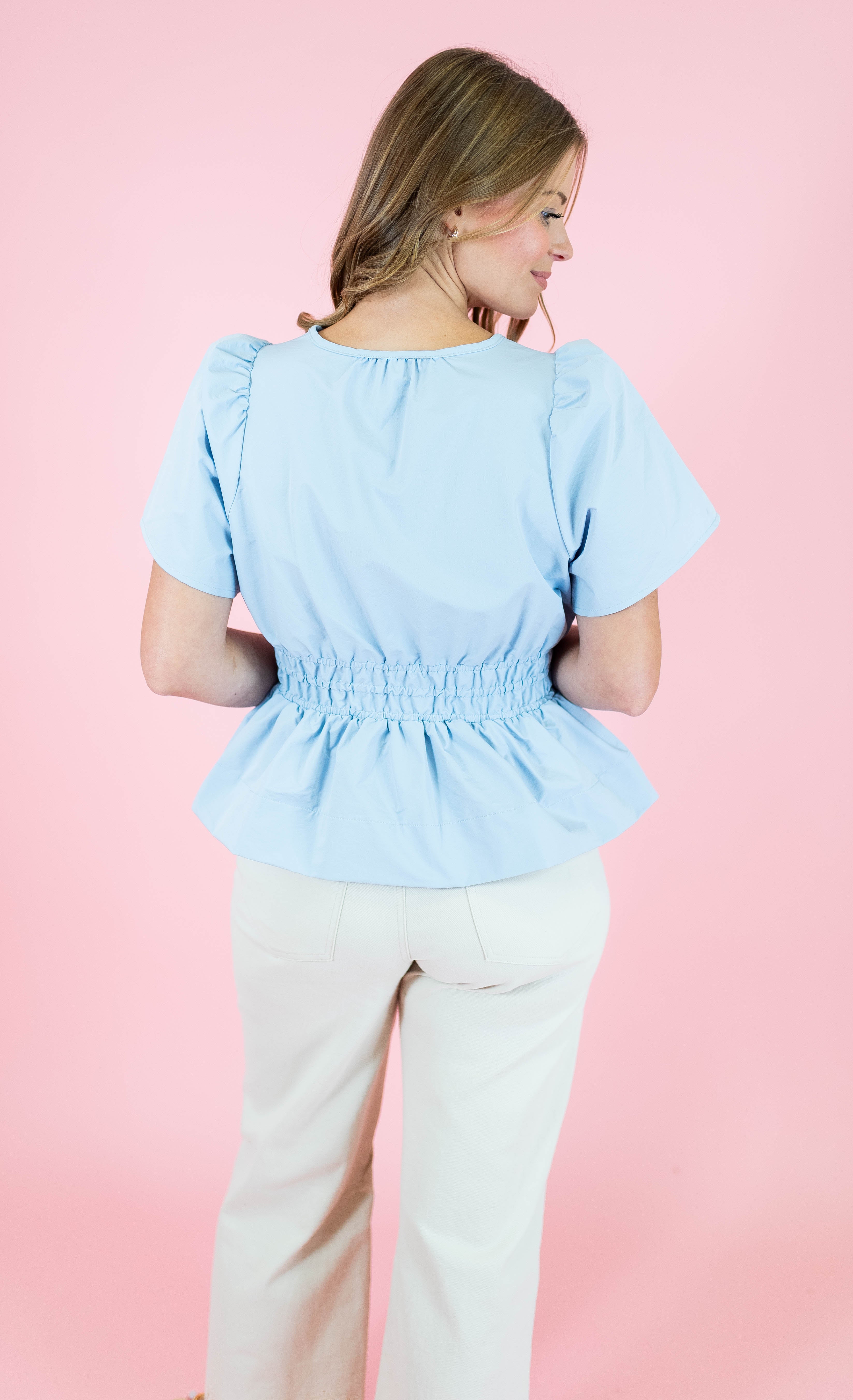 Effortless elegance meets playful style with this short sleeve flare top, featuring delicate waist smocking that creates a flattering silhouette. The structured smocking detail cinches at the waist while the relaxed flare sleeves add movement and charm. Available in three versatile shades—serene blue, soft butter yellow, and classic ivory—this top transitions seamlessly from casual days to weekend outings.