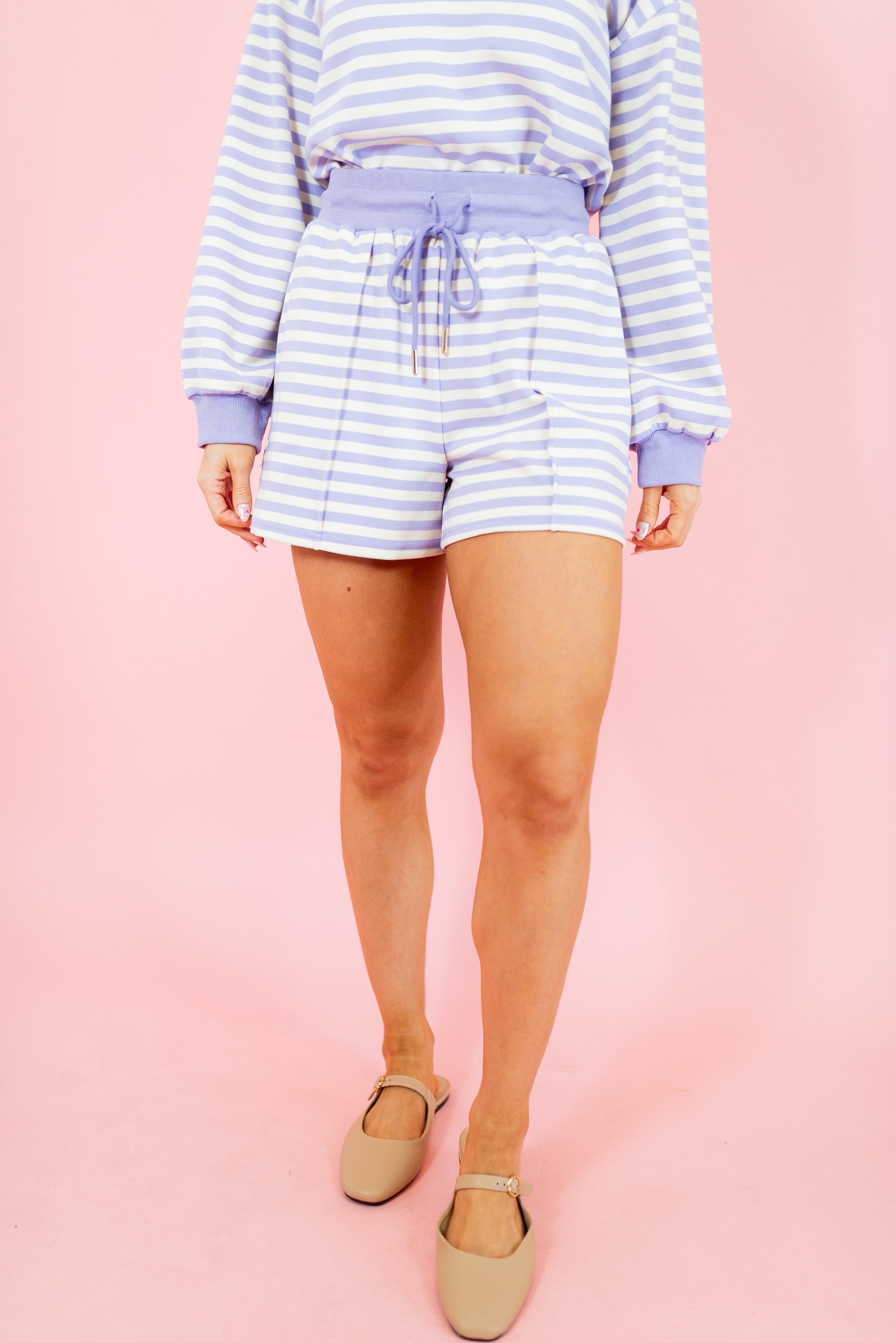 Effortlessly chic striped knit shorts featuring a comfortable drawstring waist. Available in soft lavender, fresh matcha, and blush pink, these versatile shorts pair perfectly with the matching long sleeve top to create an adorable coordinated set. The relaxed fit and breathable knit fabric make them ideal for casual days or cozy lounging.