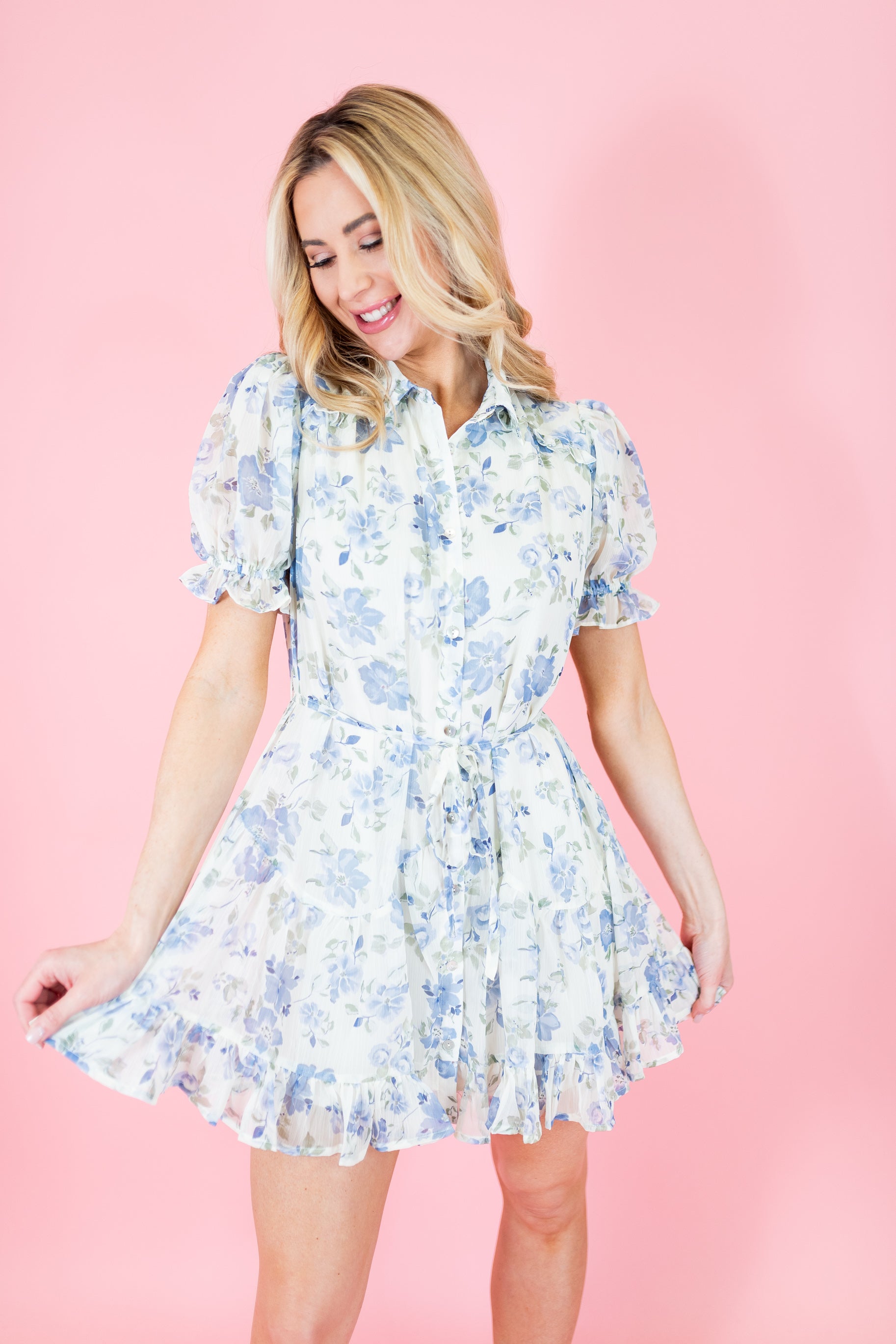 Where romance meets sunshine. This dreamy mini dress captures that soft, feminine glow perfect for spring through summer. Crafted in delicate yoryu chiffon with a dainty floral print, its button-down front and collared neckline add a touch of preppy charm. Gentle puff sleeves and a ruffled yoke bring a hint of nostalgia, while the self-tie waist cinches beautifully for a flattering fit. Fully lined for comfort, it’s the kind of dress you’ll reach for again and again. From Sunday brunches to garden weddings and romantic dates. Pair it with heeled sandals or ballet flats for an effortlessly graceful look that blooms with every step.