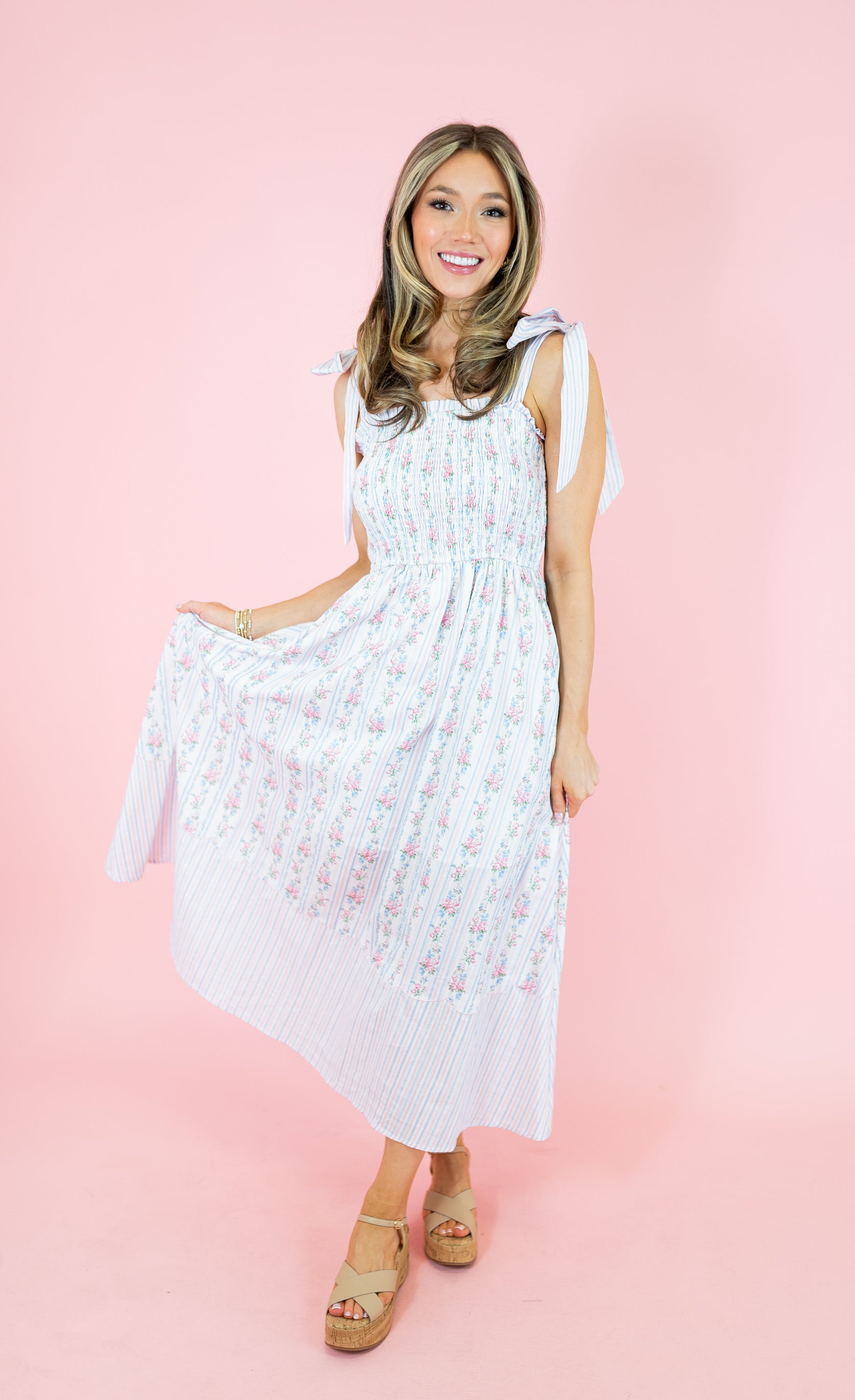 Elevate your wardrobe with this charming midi dress featuring a delicate mix of floral and stripe patterns. The smocked top provides a flattering, comfortable fit while the distinctive bow tie straps add a playful touch of sophistication. Rendered in soft light pink tones, this versatile piece transitions seamlessly from casual daytime wear to evening occasions. Perfect for spring gatherings, garden parties, or whenever you want to make a graceful impression.