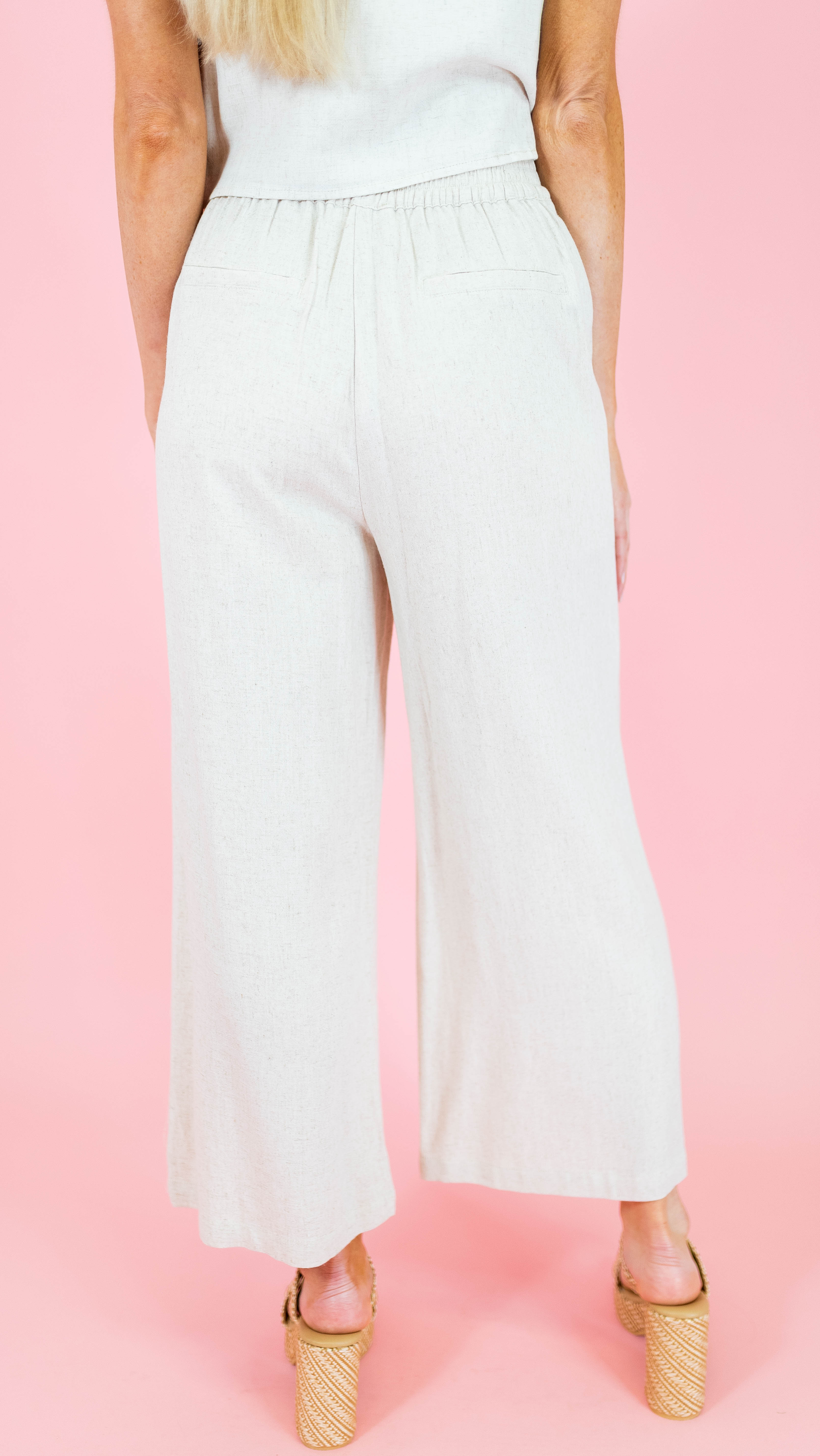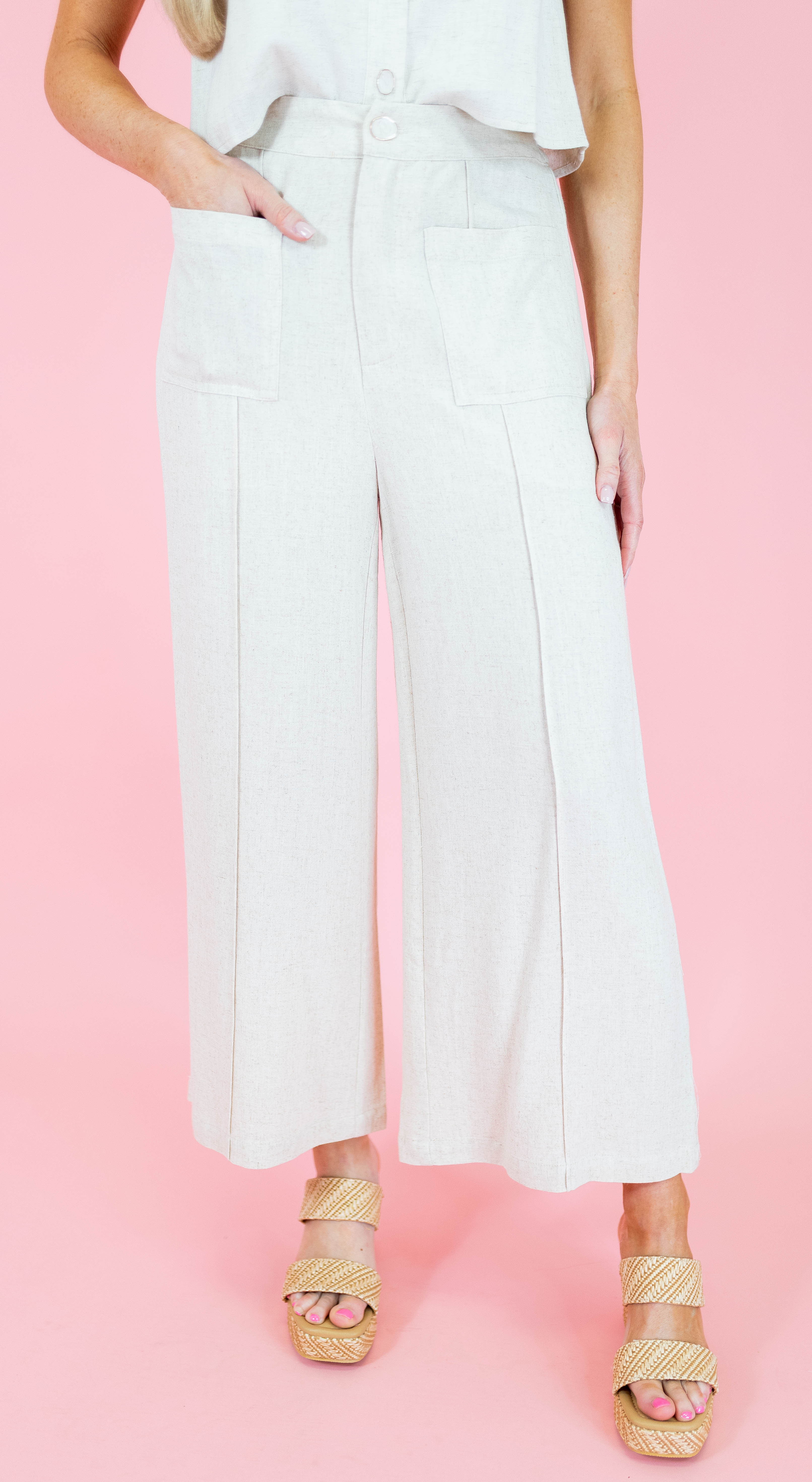 Elevate your warm-weather wardrobe with these breezy oatmeal linen pants, featuring charming patch pockets perfect for stashing your essentials. The relaxed fit and natural fabric keep you cool and comfortable all day long. Style them with the matching tank top for an effortlessly coordinated look that's equal parts chic and laid-back. Whether you're heading to brunch or a casual getaway, this duo delivers understated elegance with a touch of fun.