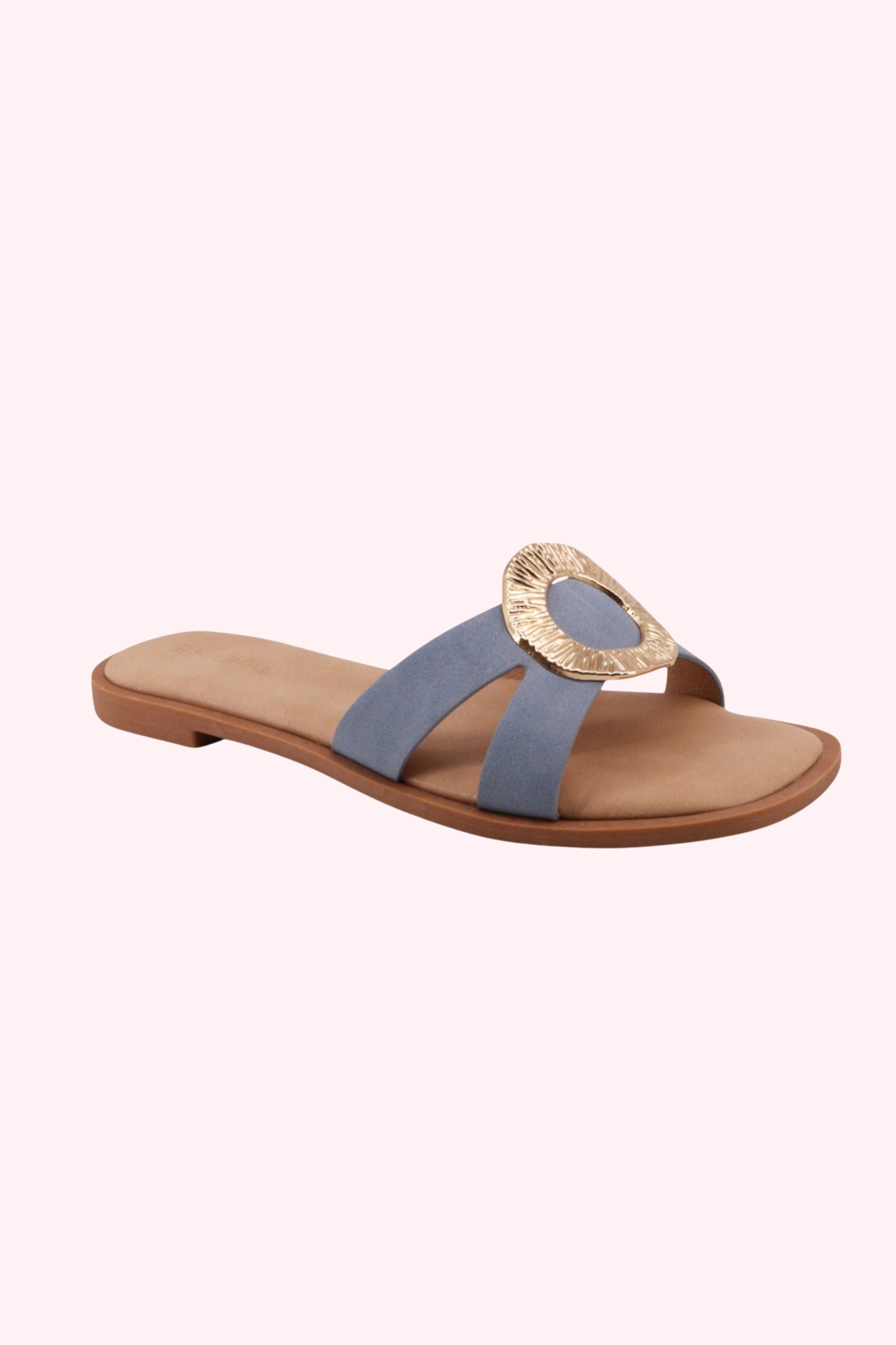 Step into effortless style with these square toe round buckle sandals in a versatile blue shade. Featuring a distinctive round buckle accent and modern square toe design, these sandals offer a contemporary twist on a classic silhouette. The gold buckle closure ensures a customized fit, while the comfortable construction makes them perfect for casual outings, weekend adventures, or everyday wear. Pair them with your favorite summer dresses, shorts, or casual pants for a polished, put-together look.