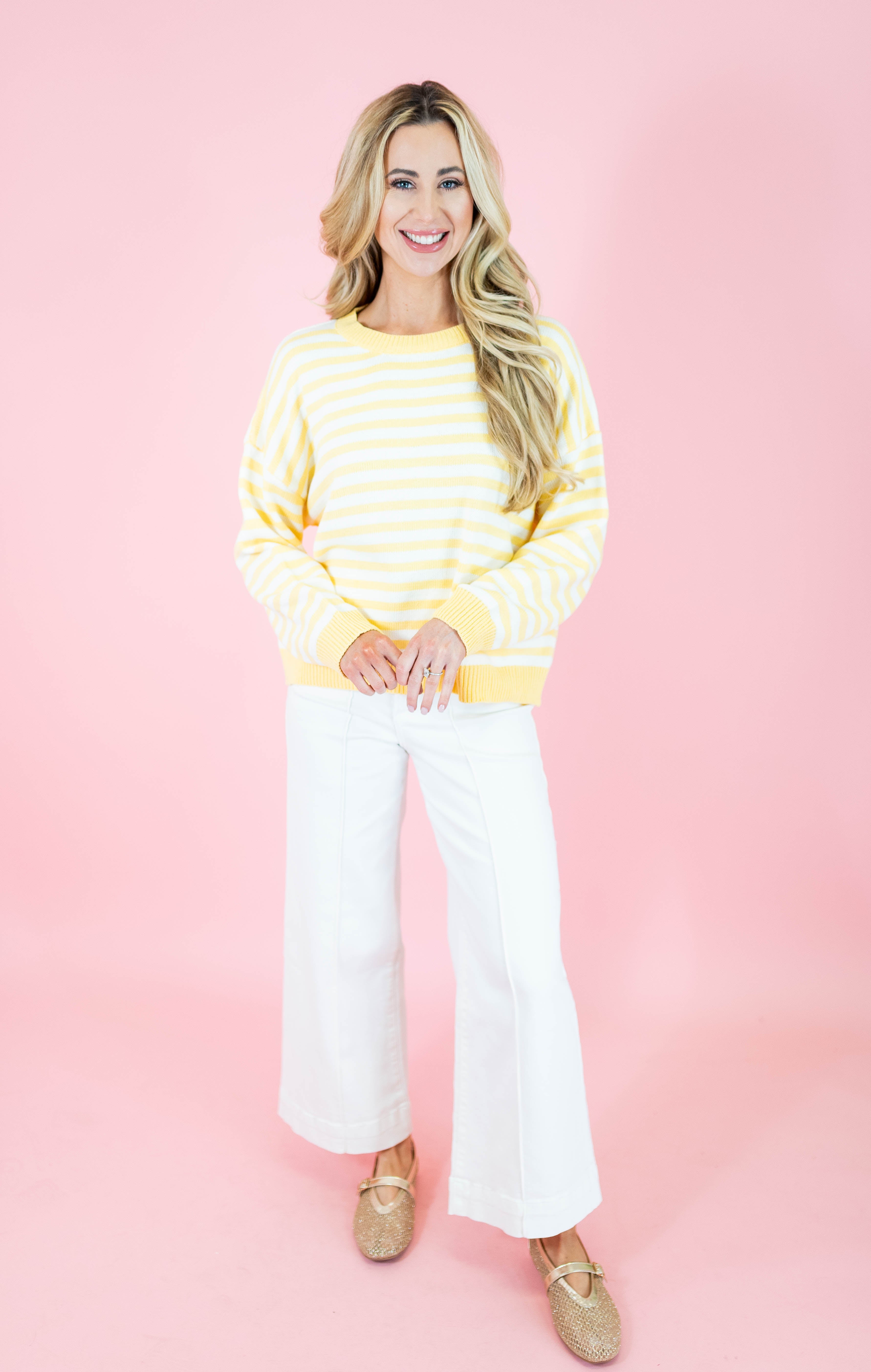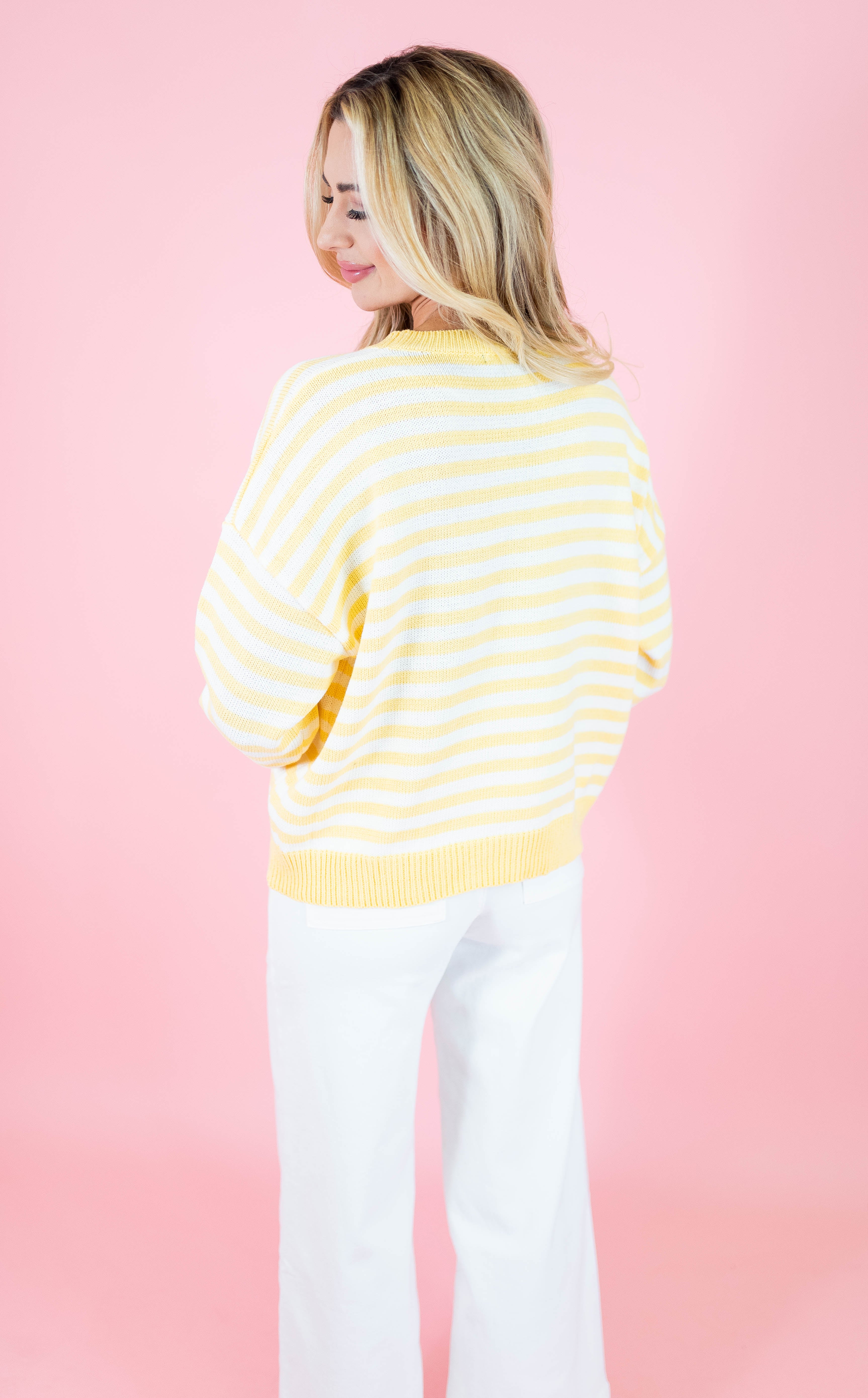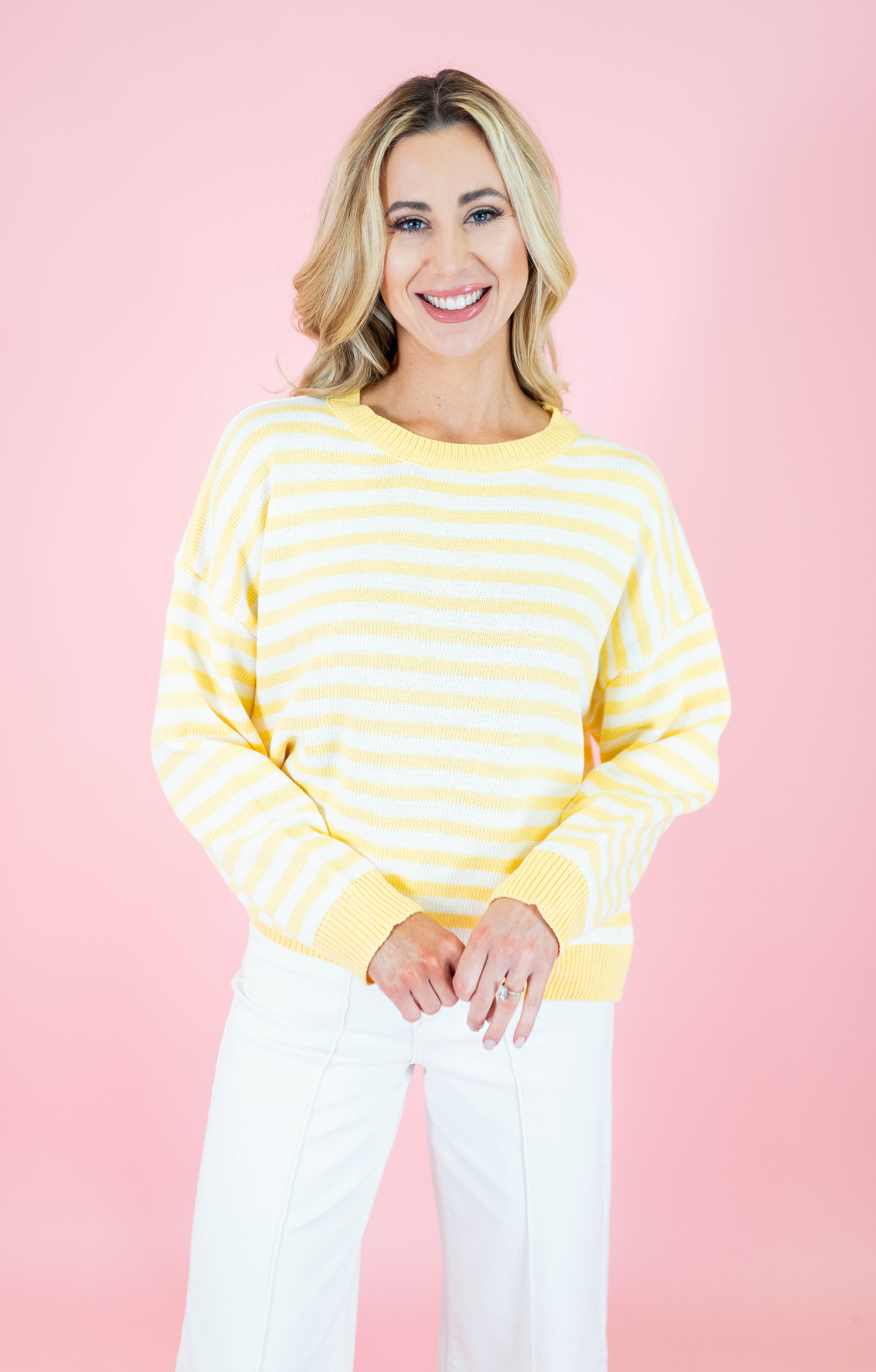 Effortless style meets comfort in this striped crewneck sweater. Featuring a relaxed fit with drop shoulders and ribbed detailing, it's designed for everyday wear. The lightweight knit blend of 60% cotton and 40% acrylic keeps you cozy without the bulk. Long sleeves and a classic crew neckline complete the look. Available in soft pink and cheerful yellow stripes.