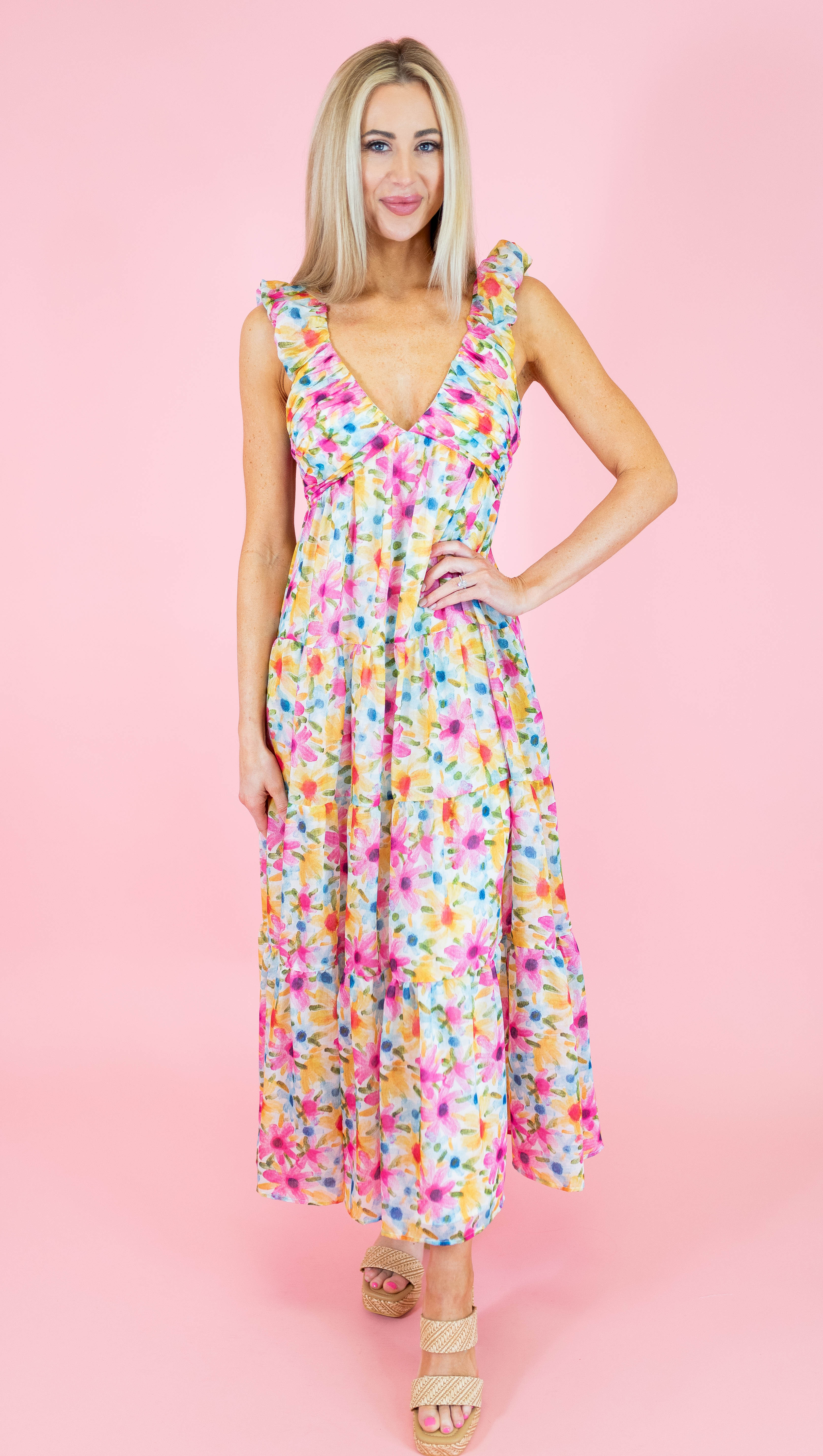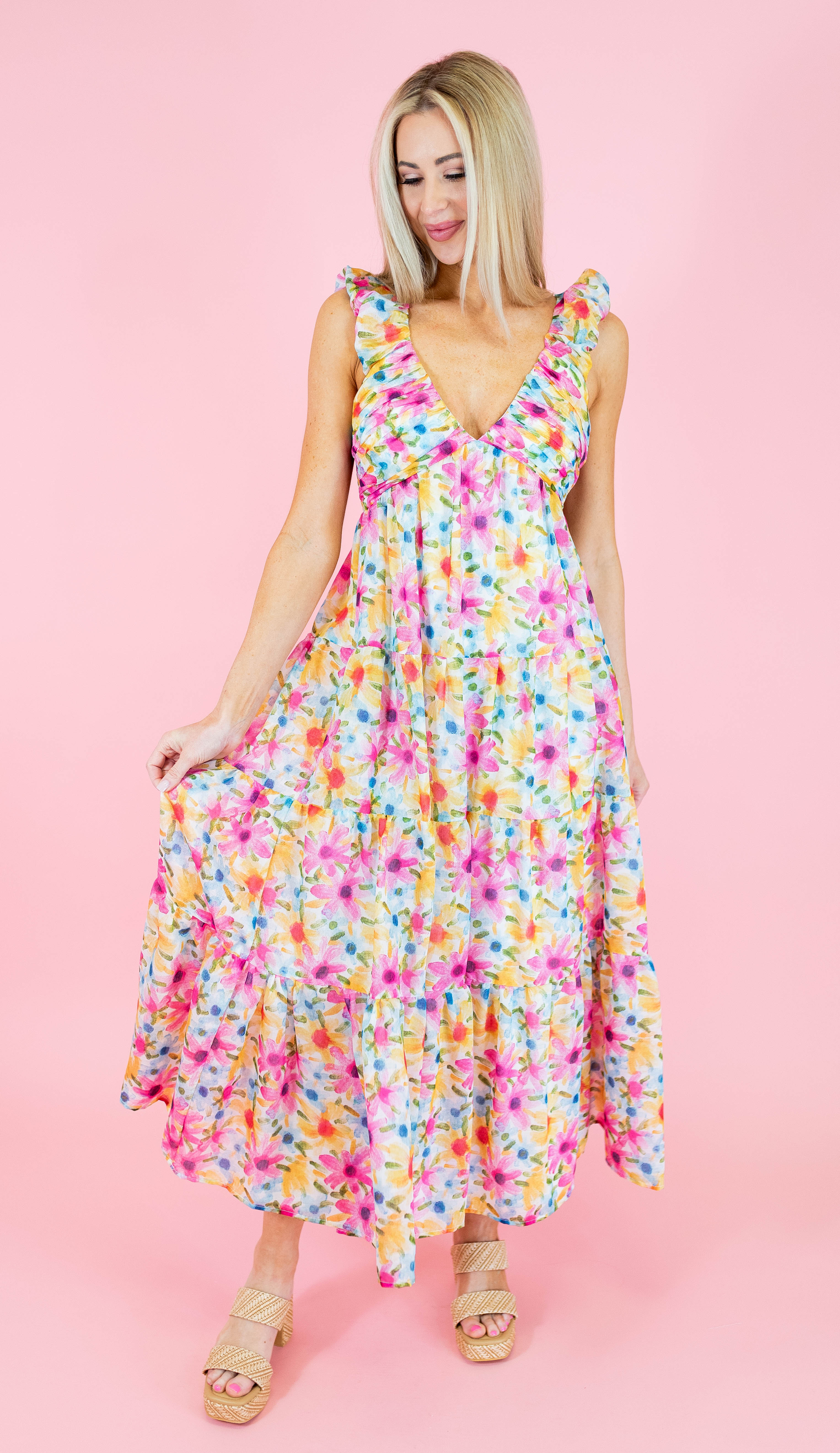 Embrace an ethereal, romantic aesthetic in this stunning tiered floral maxi dress. The painterly botanical print, featuring a symphony of rose pink, sunshine yellow, and cornflower blue blooms, captures the wild beauty of a Grecian hillside in flower. Crafted with a flattering deep V-neckline and feminine ruffled shoulders, the tiered skirt cascades gracefully, creating beautiful movement as you walk. With its comfortable smocked back for a bespoke fit, this dress is the ultimate choice for a garden wedding, a special bachelorette celebration, or a dream-filled golden hour stroll.