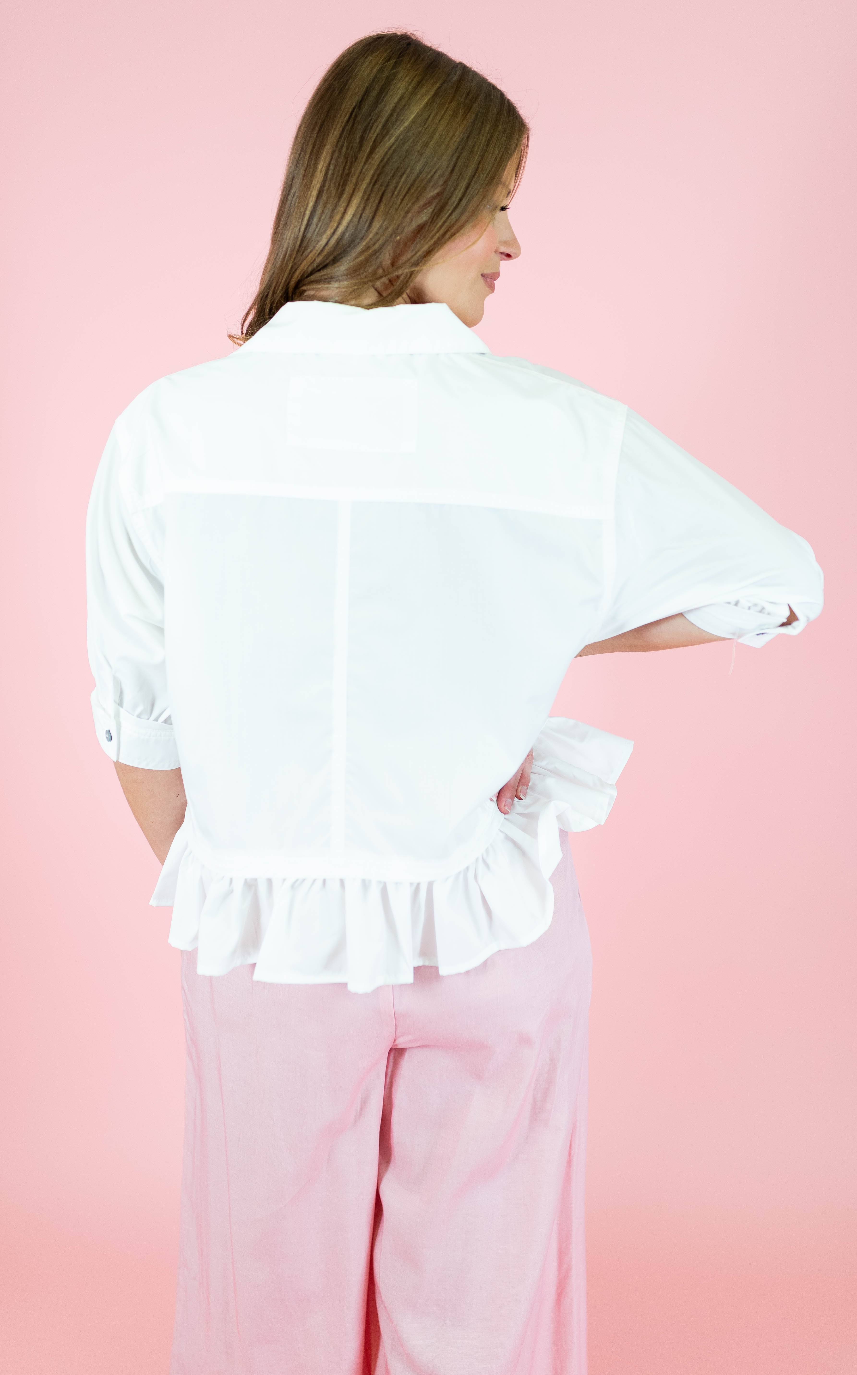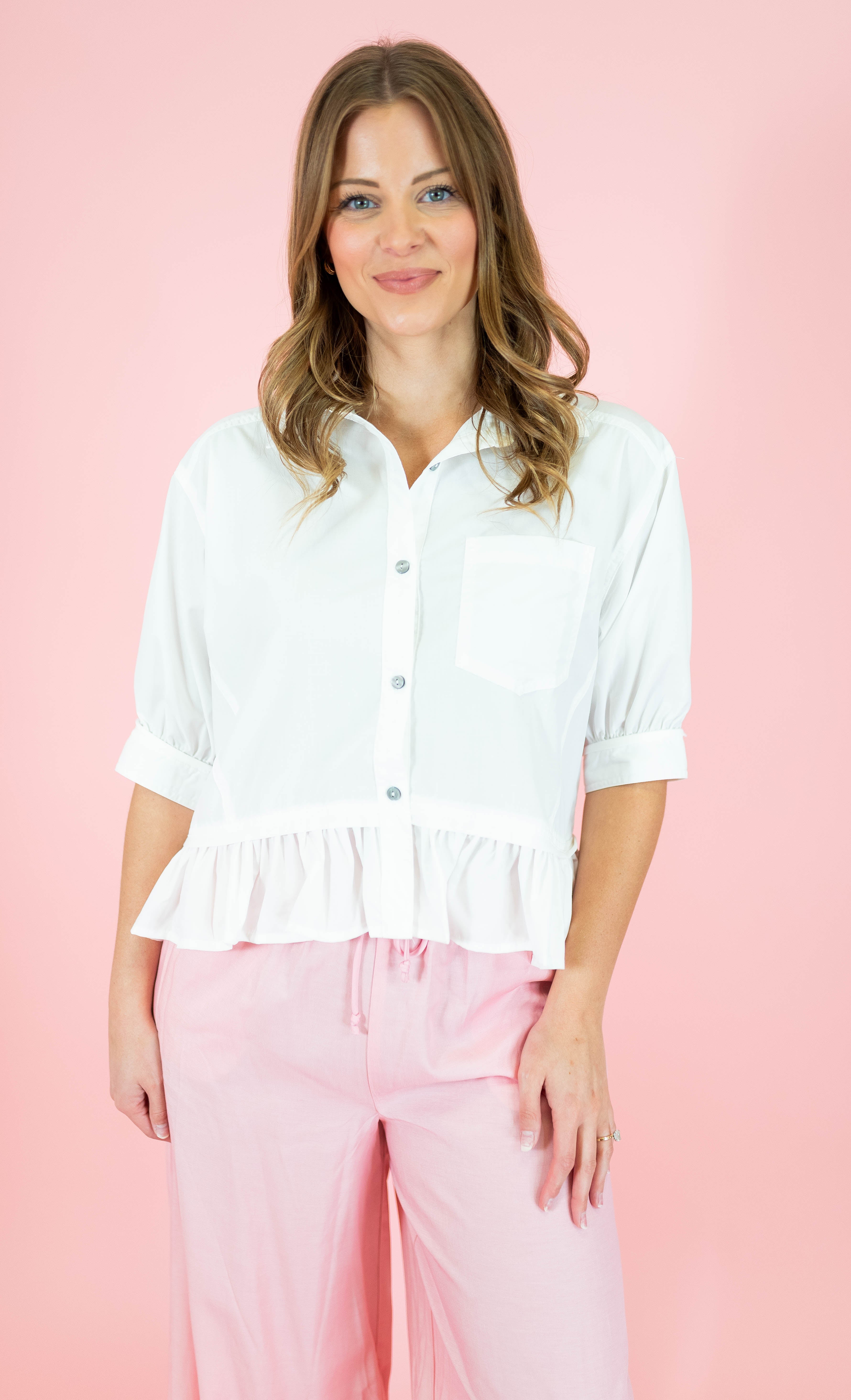 Elevate your everyday wardrobe with The Simply Sweet Ruffle Blouse, a charming button-down featuring a delicate ruffle hem that adds feminine flair to any outfit. Available in four versatile colors—chambray, off-white, pink, and yellow—this blouse transitions seamlessly from casual weekends to polished workdays. The classic silhouette and thoughtful ruffle detail make it a go-to piece for layering or wearing solo. Perfect for creating effortless, put-together looks with minimal effort.