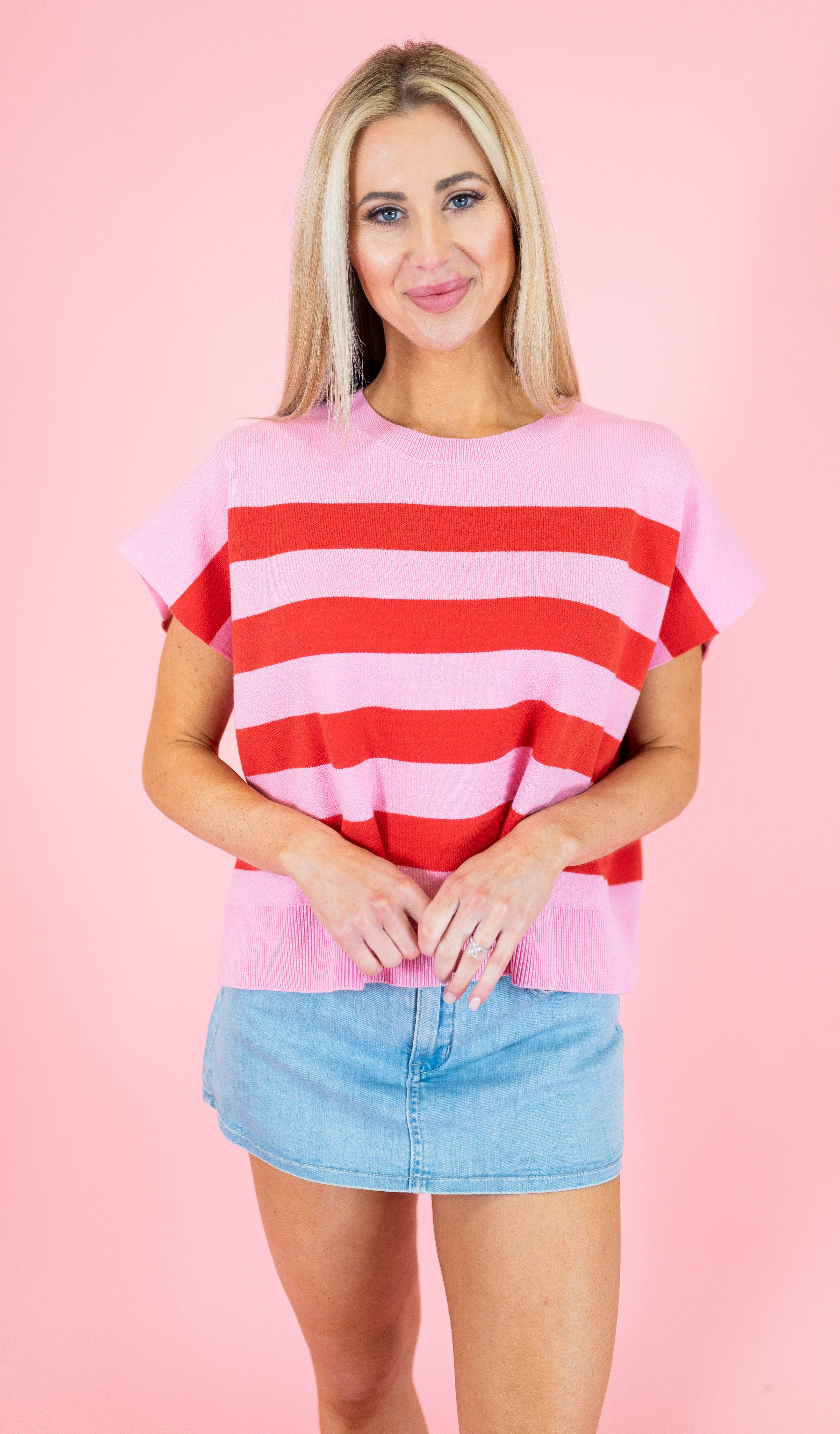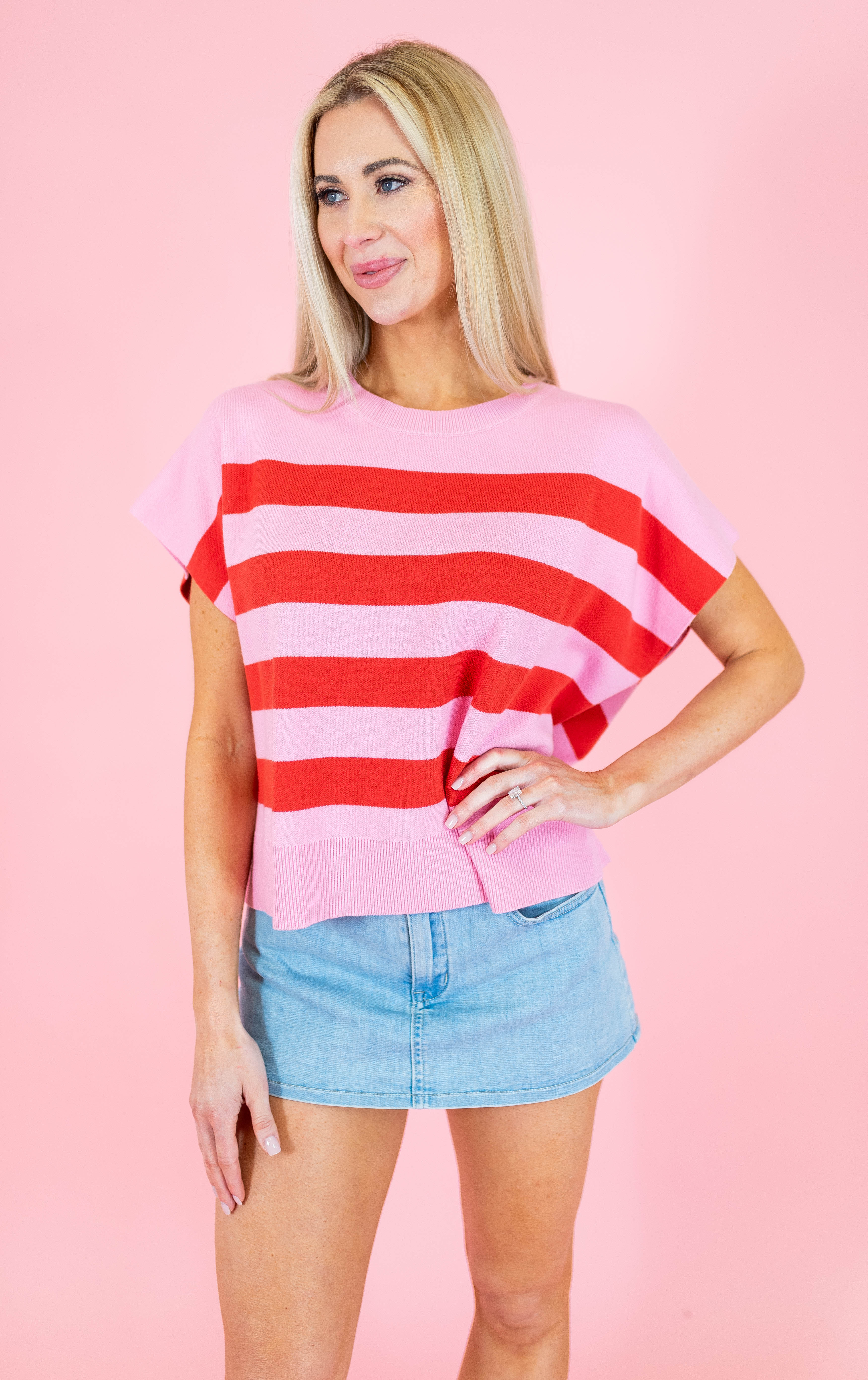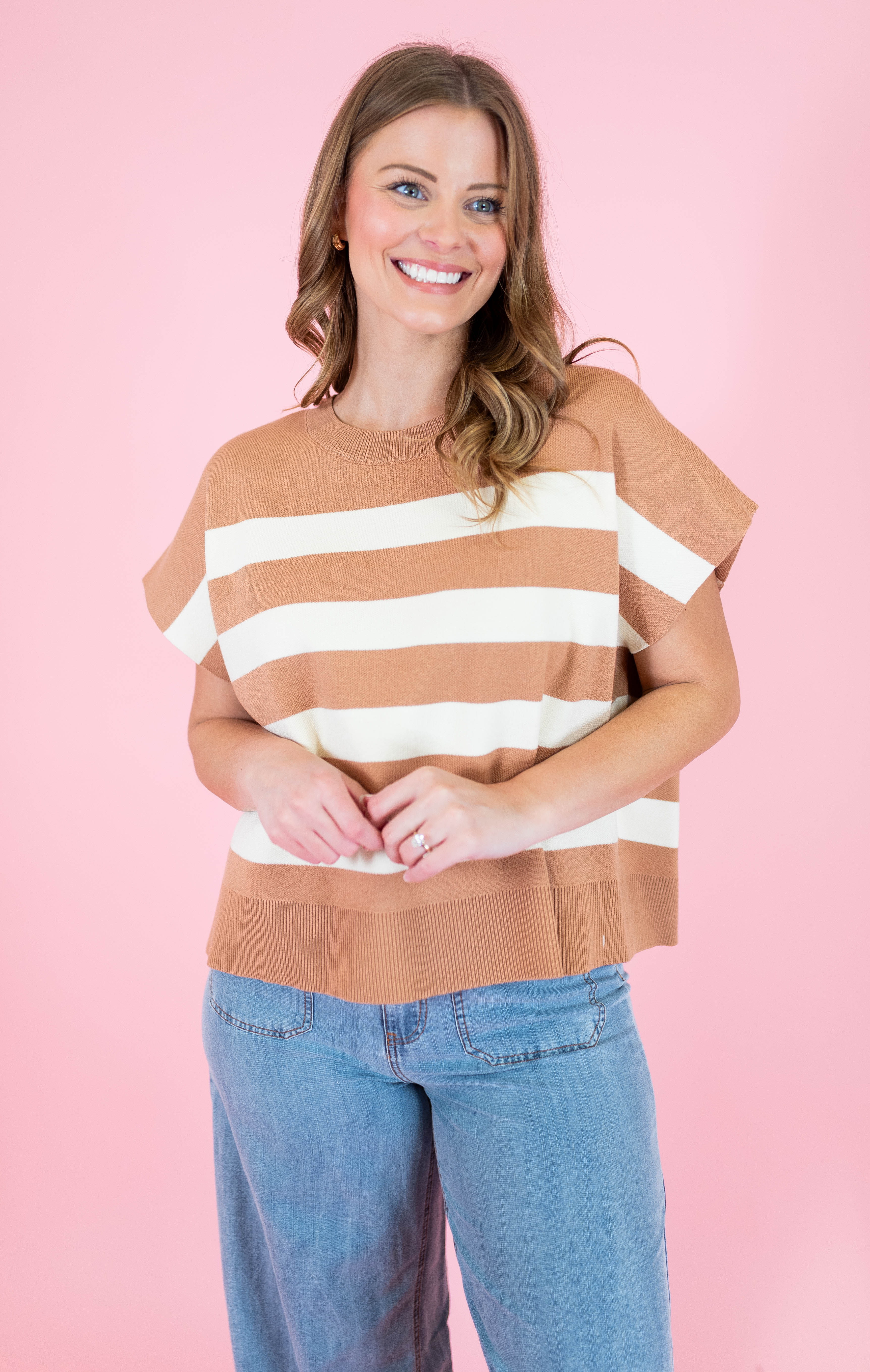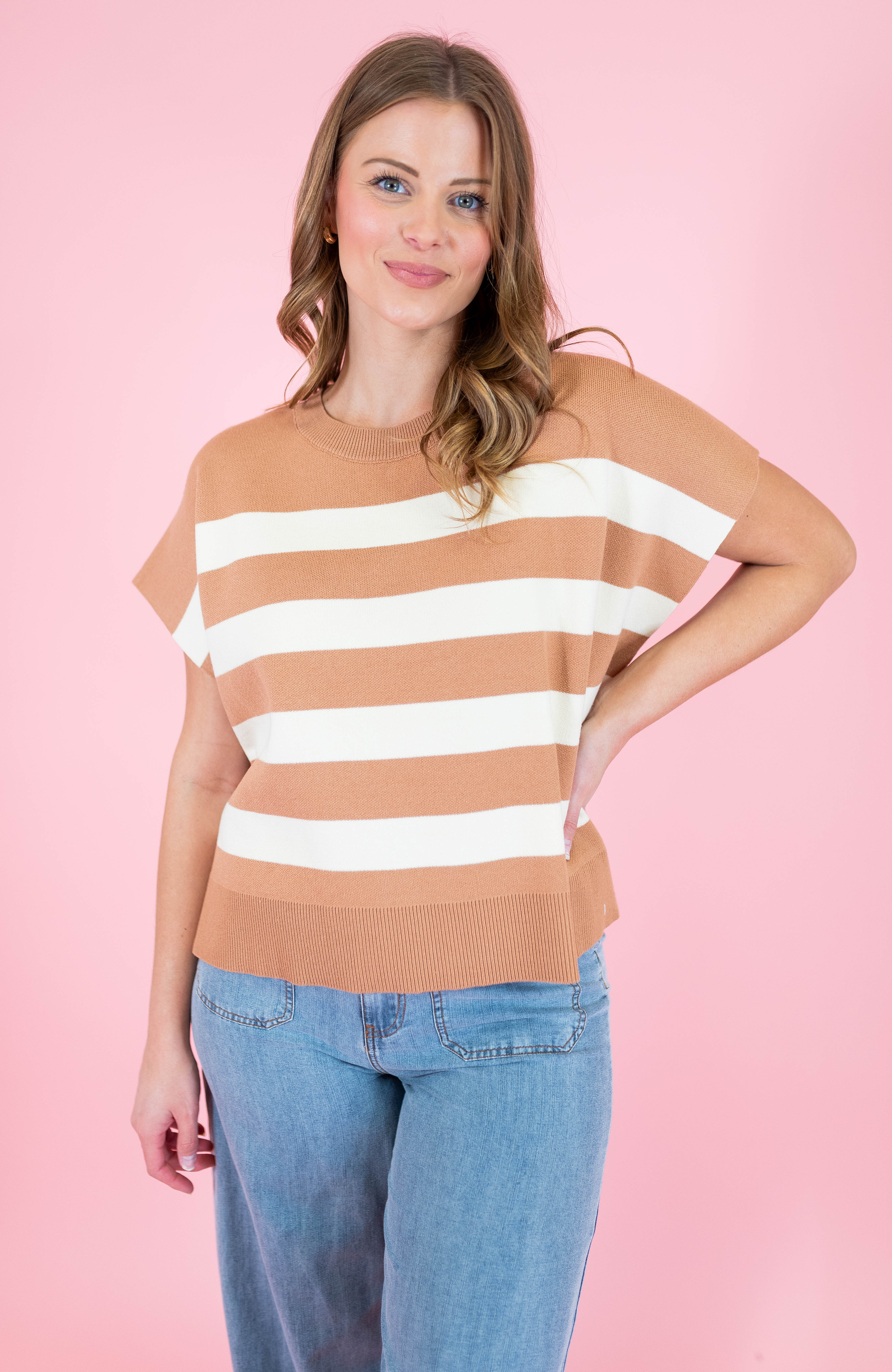 Elevate your casual wardrobe with The Uptown Stripe Sweater Top, a versatile essential featuring classic striped detailing. This medium-weight knit offers a comfortable oversized fit with short sleeves and a round neckline, accented by ribbed trim for added texture. Crafted from a breathable blend of viscose, polyester, and nylon, it delivers both style and durability. Available in sophisticated pink and tan colorways, this non-sheer top transitions seamlessly from day to night. Perfect for layering or wearing solo, it's a timeless piece that works with everything in your closet.