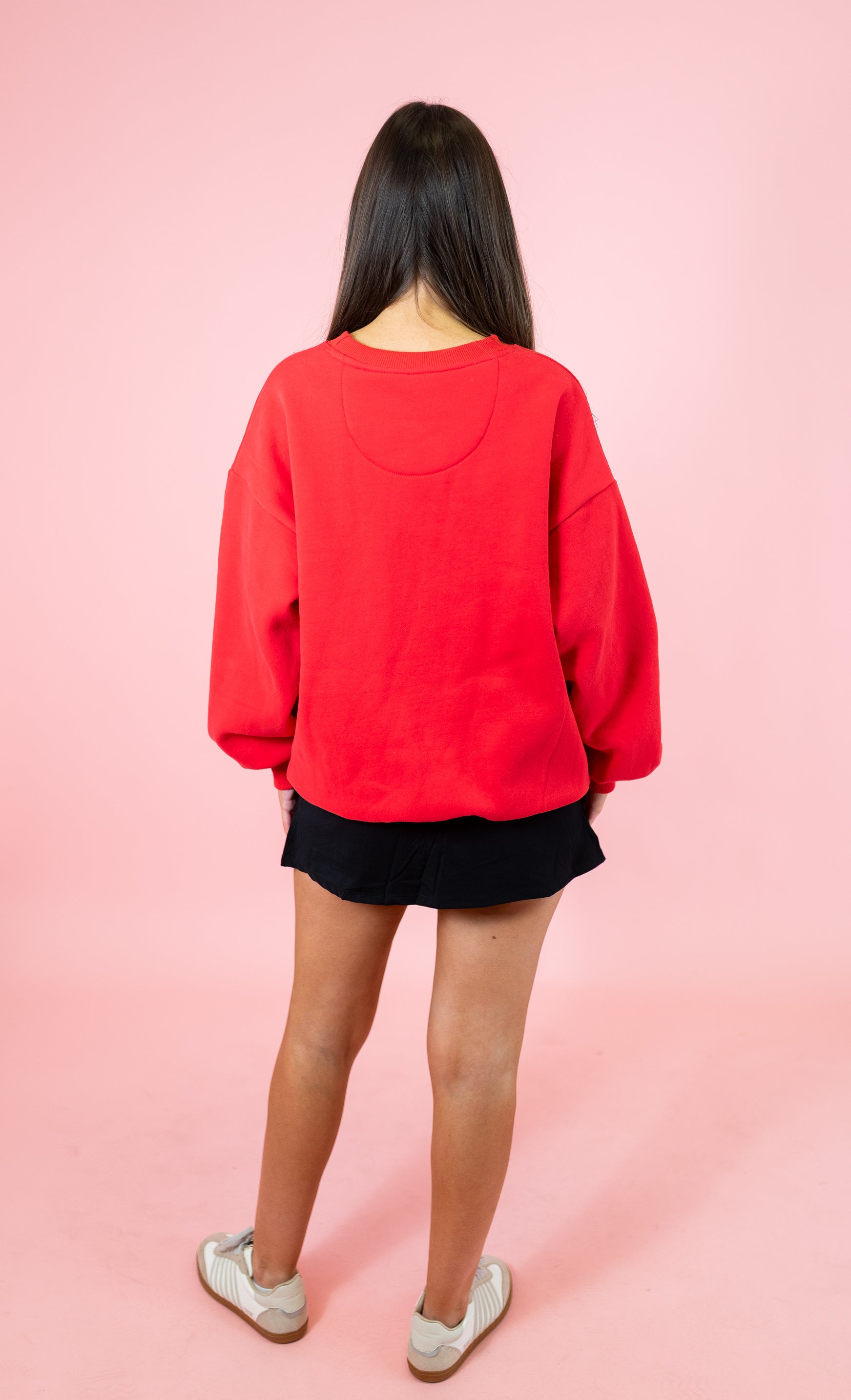 Add a fun twist to your cozy wardrobe with this Red/Black embroidered sweatshirt! Made from a comfy 50/50 cotton-poly blend, it keeps you warm while the playful embroidery and bold colors make every outfit stand out.