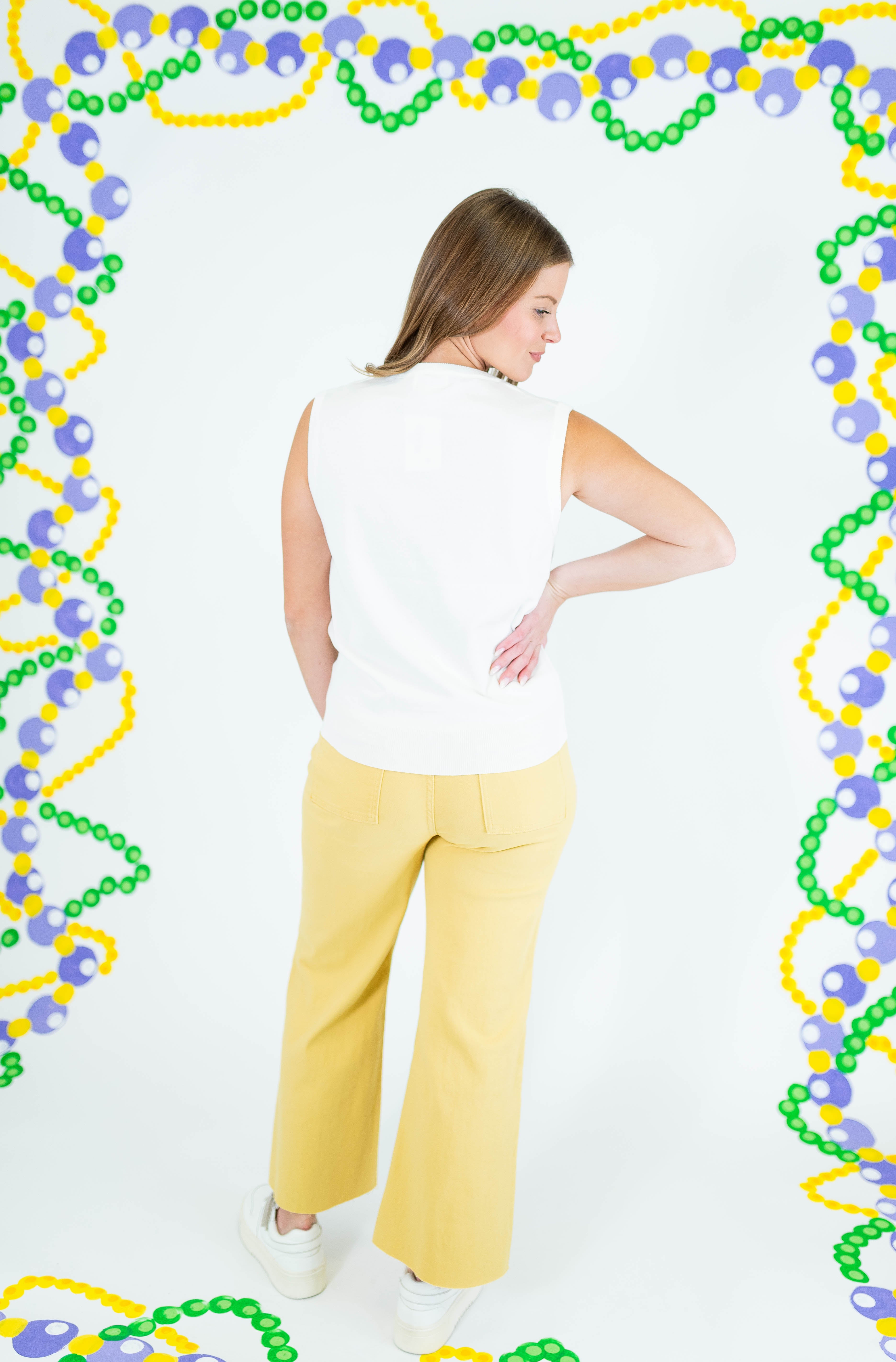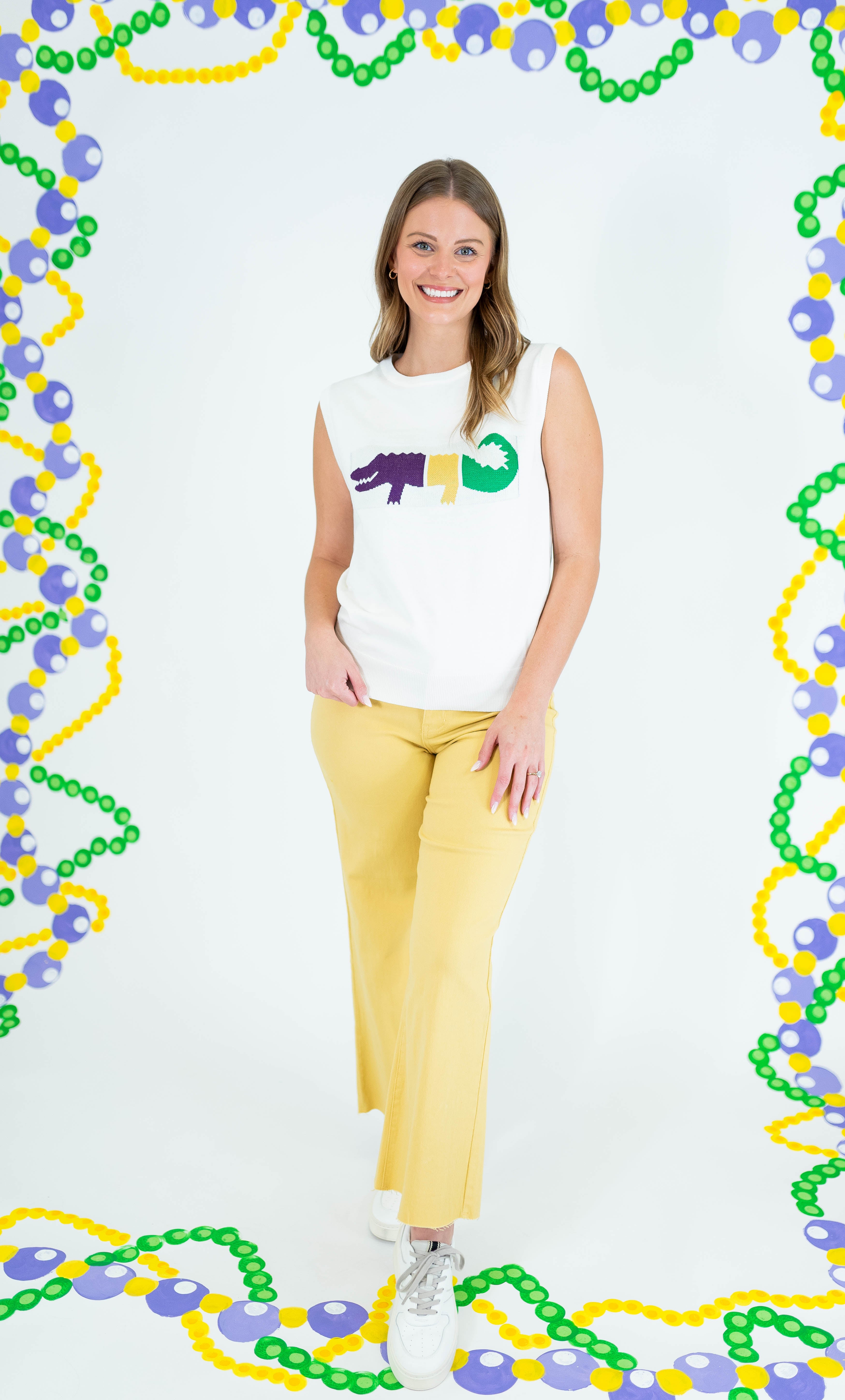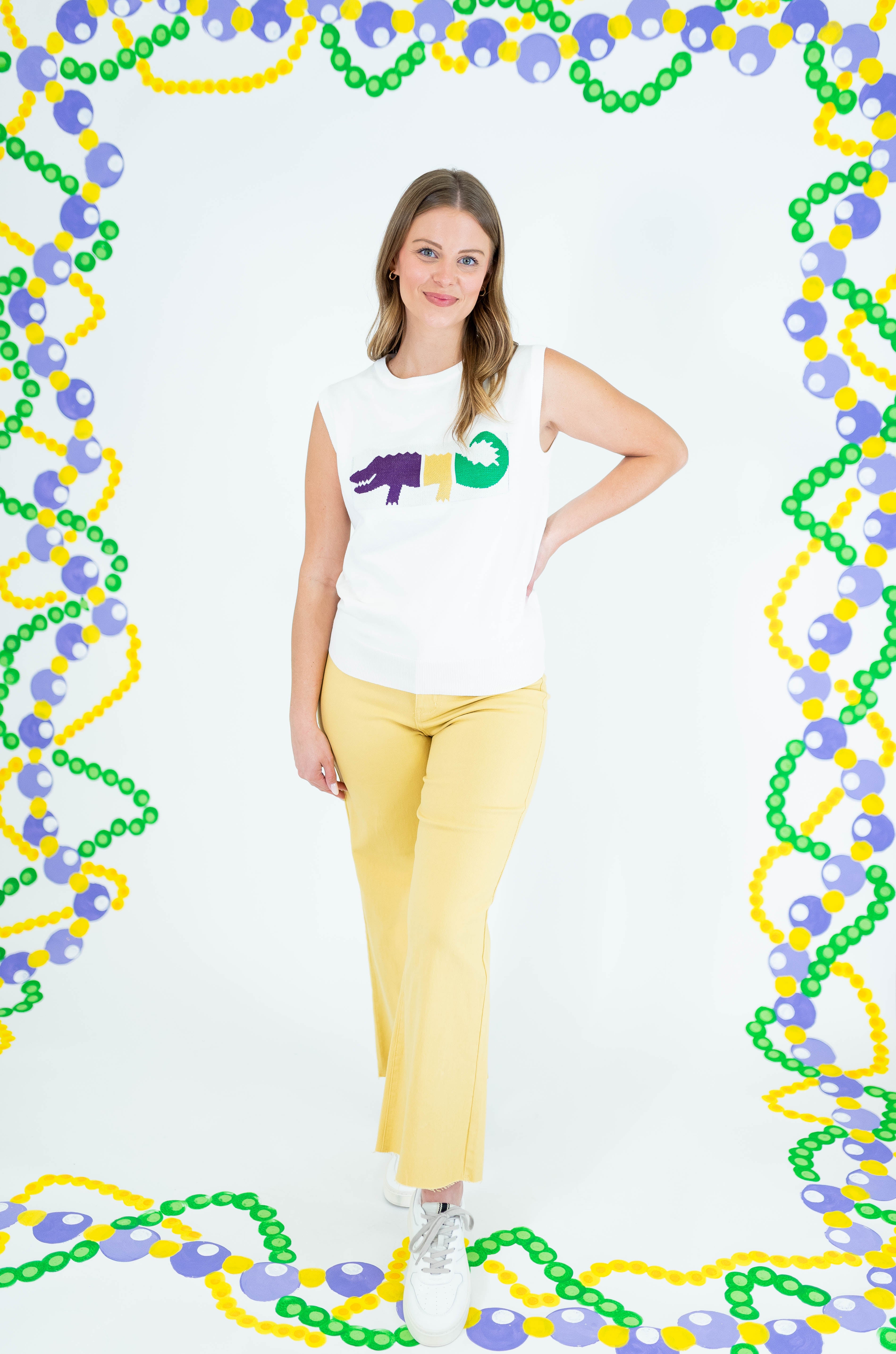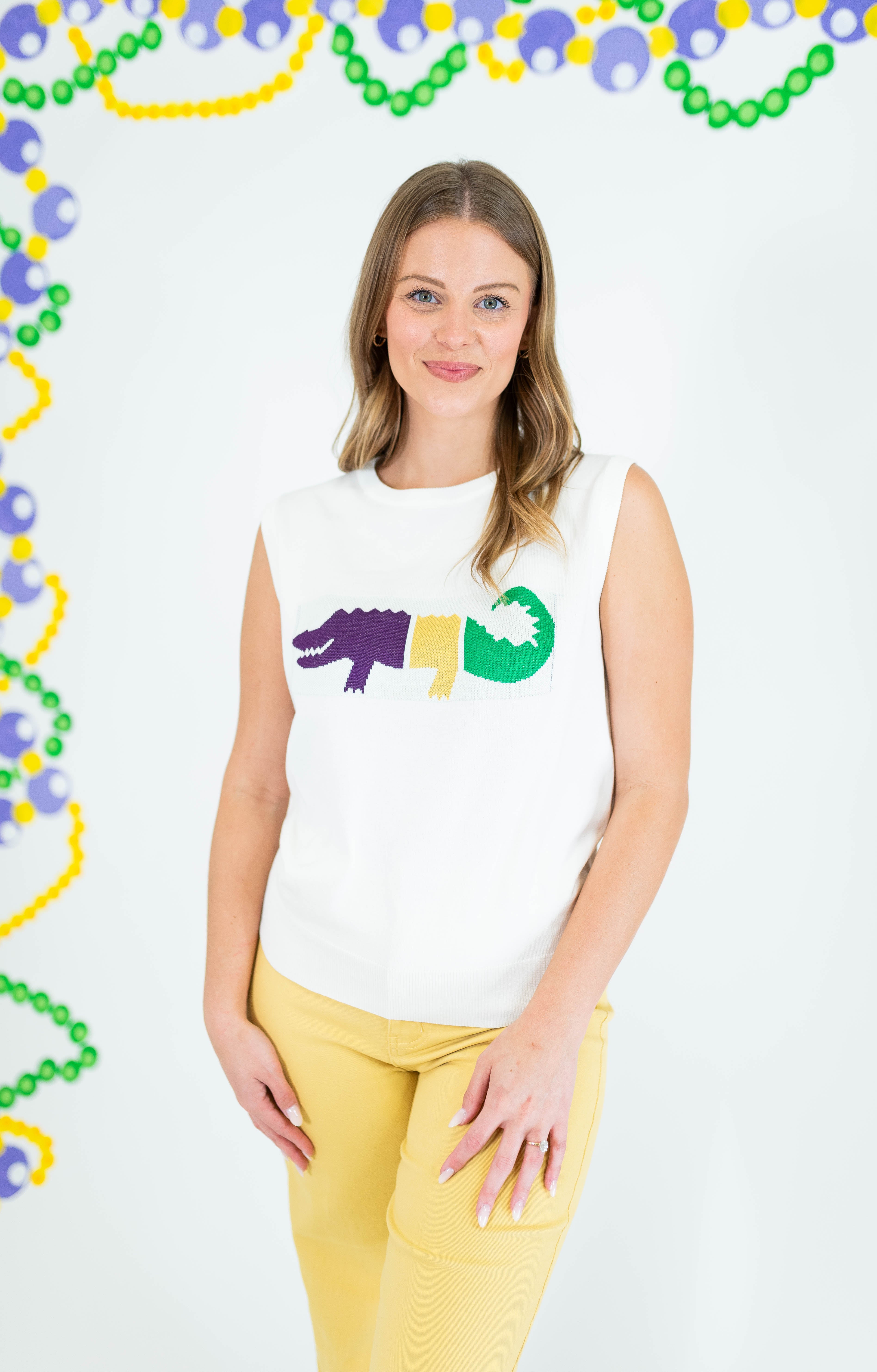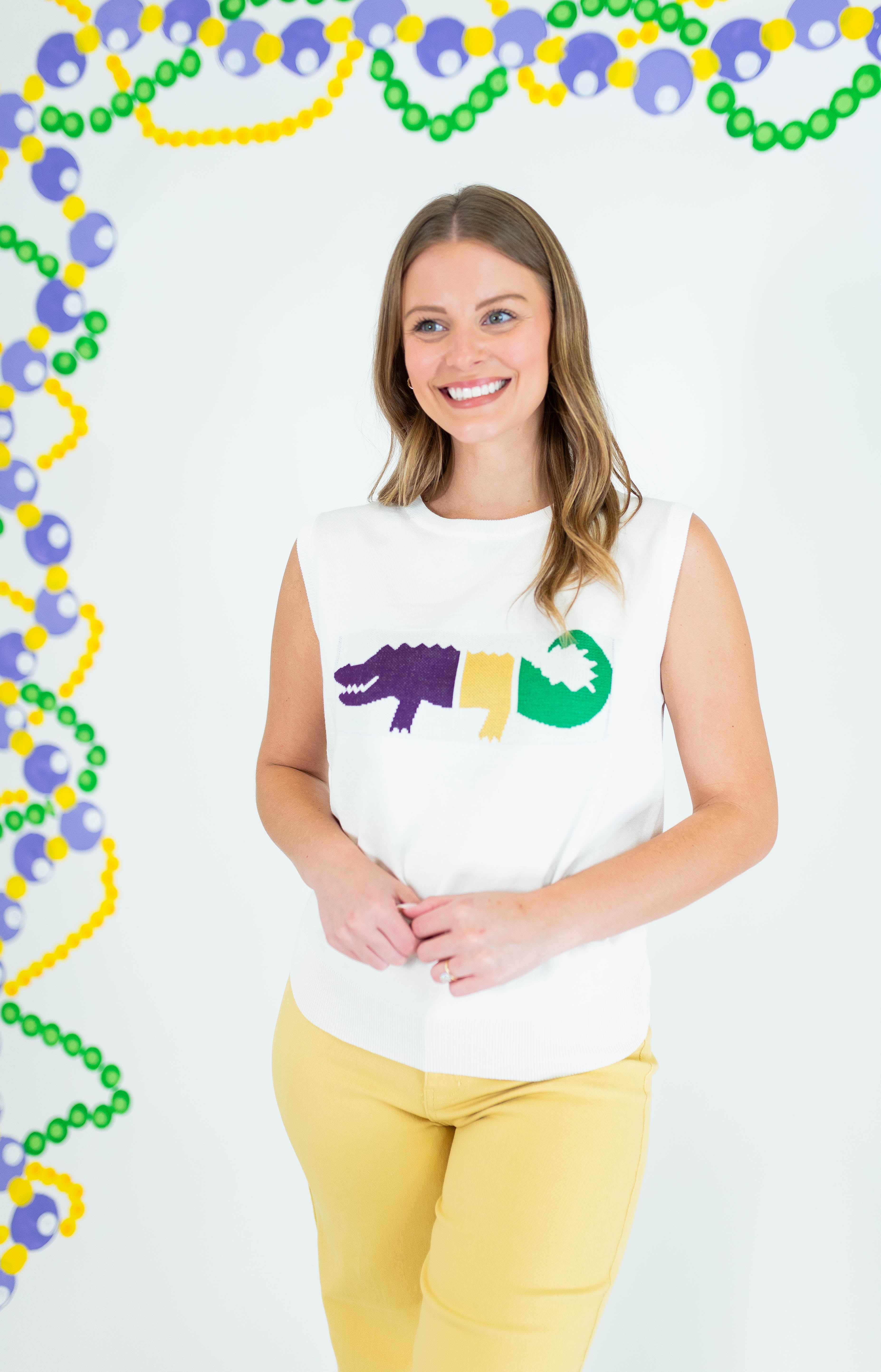 Celebrate bold style with this eye-catching Mardi Gras Color Block Alligator Sweater Tank in ivory. Featuring vibrant color blocking and a playful alligator design, this piece brings festive flair to your wardrobe. The lightweight sweater tank construction offers comfortable layering for any season, while the unique graphic makes it a standout conversation starter. Perfect for adding personality to casual outfits or making a statement at themed events. Elevate your everyday look with this fun, fashion-forward essential.