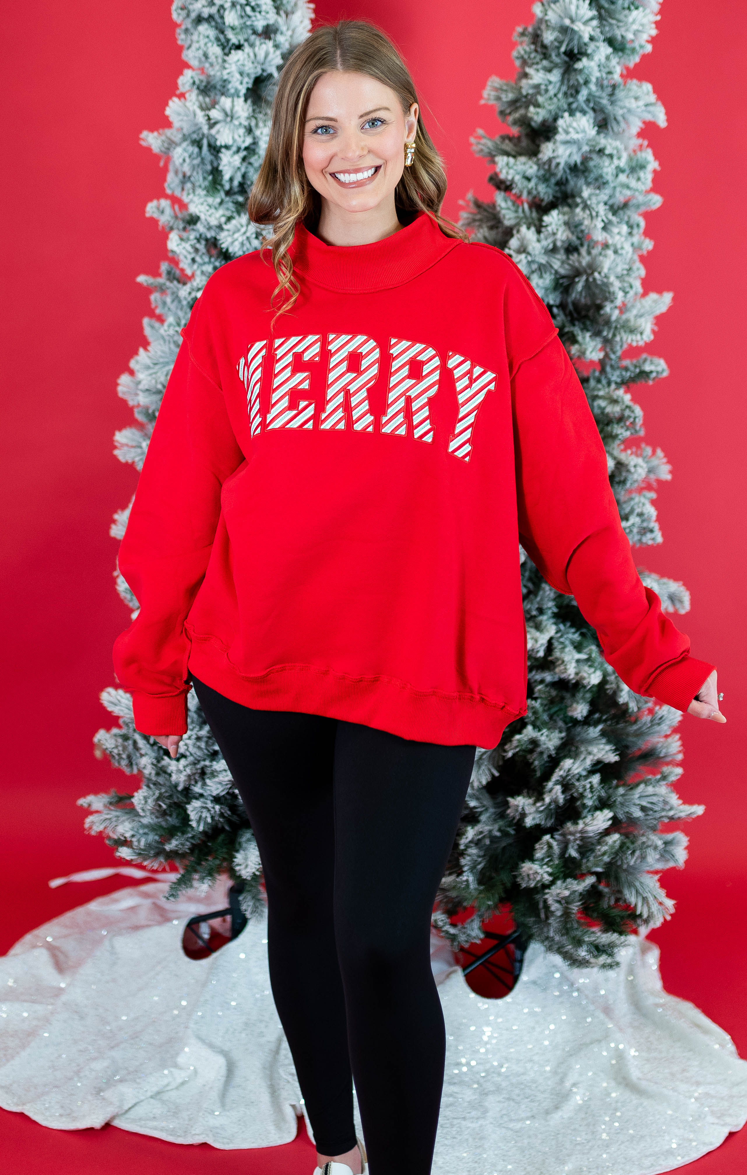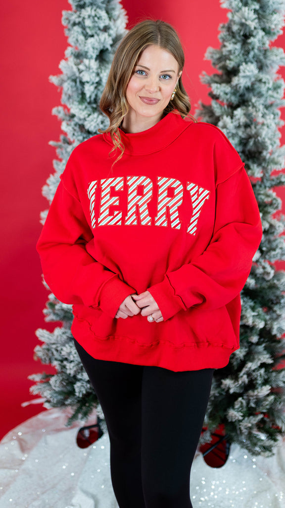 Celebrate the season in style with this vibrant red mock neck sweatshirt, featuring delicate embroidered "Merry" lettering across the chest. The cozy mock neck design offers warmth and a polished silhouette, while the soft fabric provides all-day comfort. Perfect for holiday gatherings, casual outings, or festive lounging, this versatile piece pairs effortlessly with jeans, leggings, or skirts. Make a cheerful statement this year with a sweatshirt that combines comfort, charm, and seasonal spirit in one irresistible package.