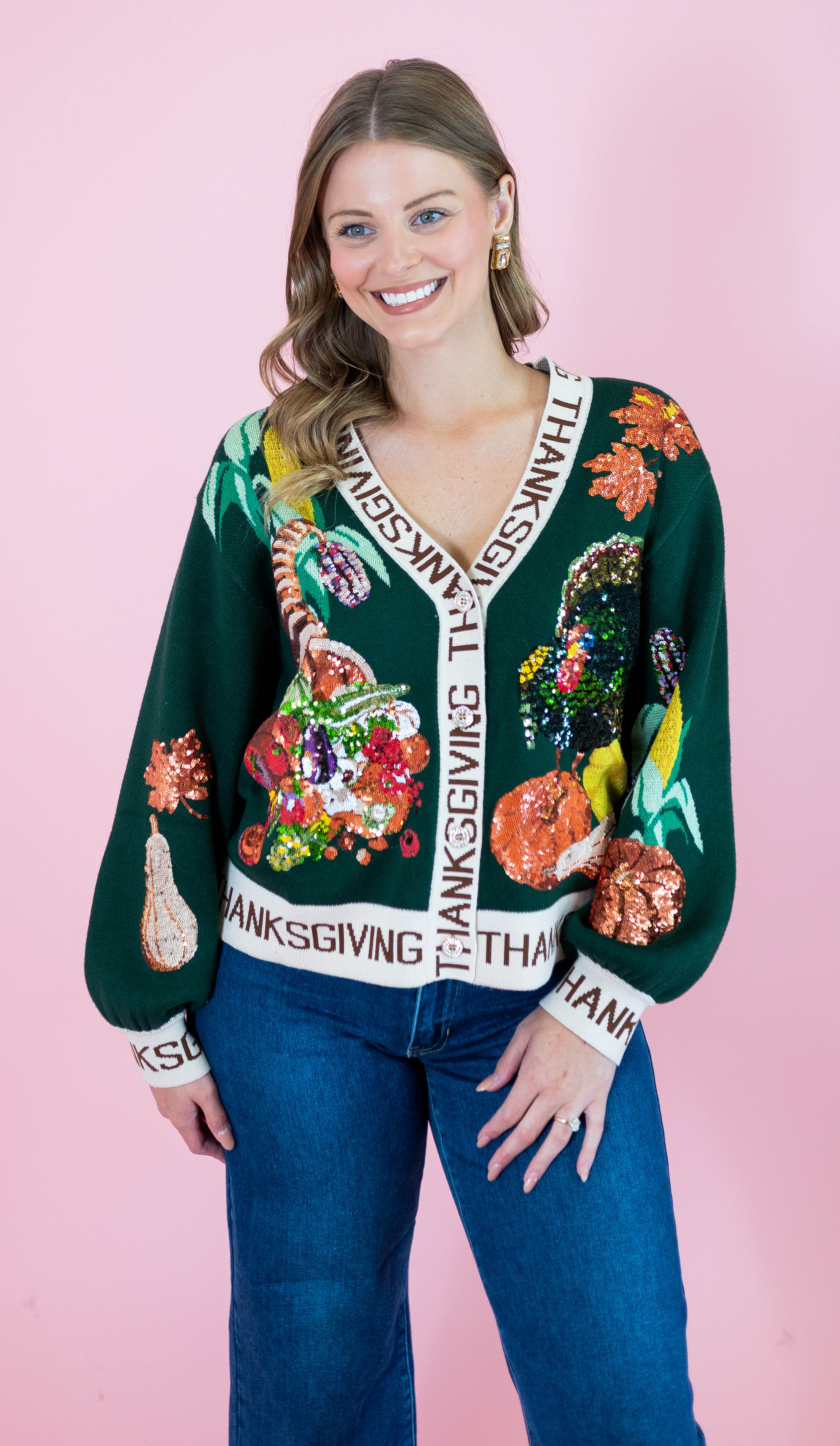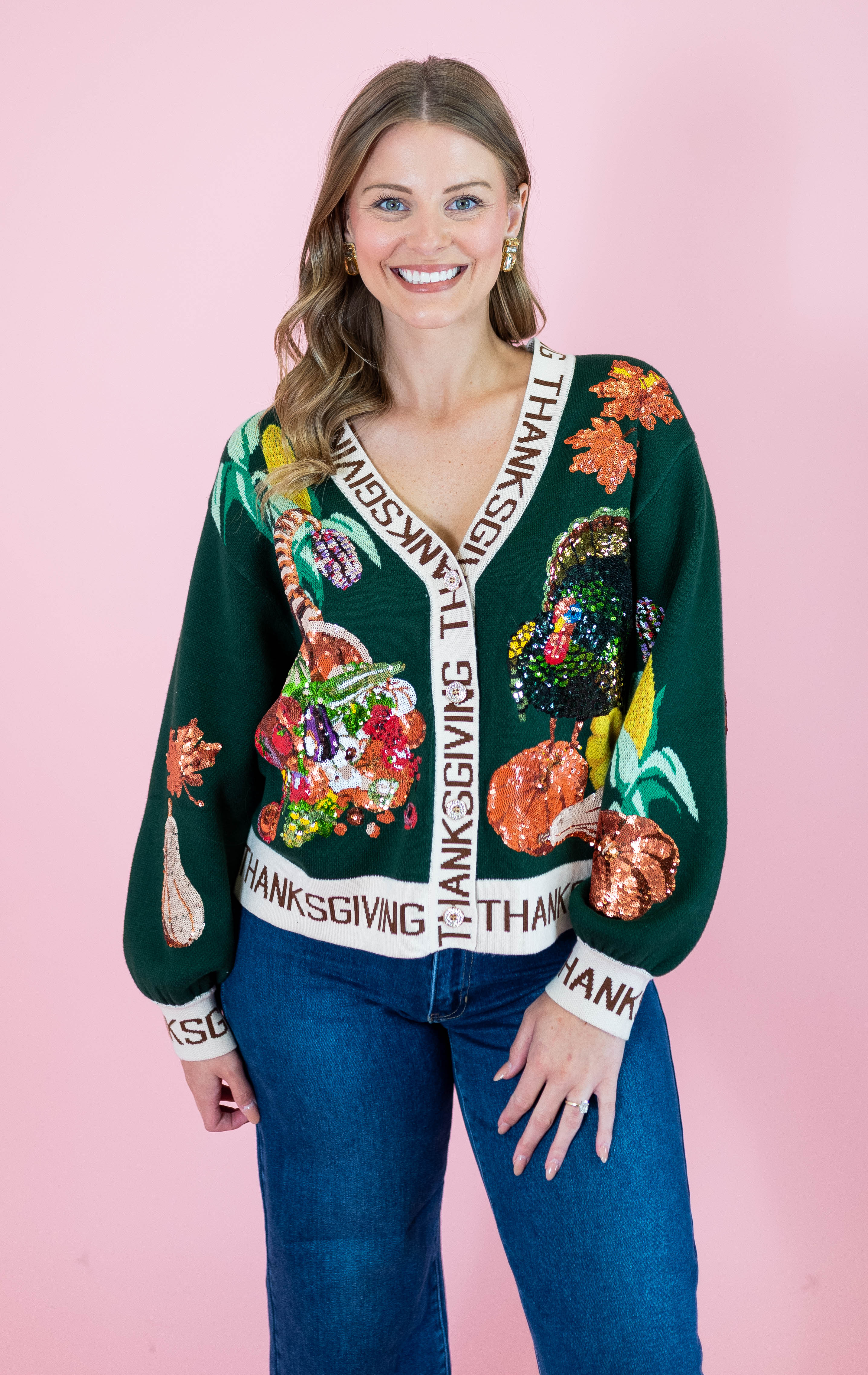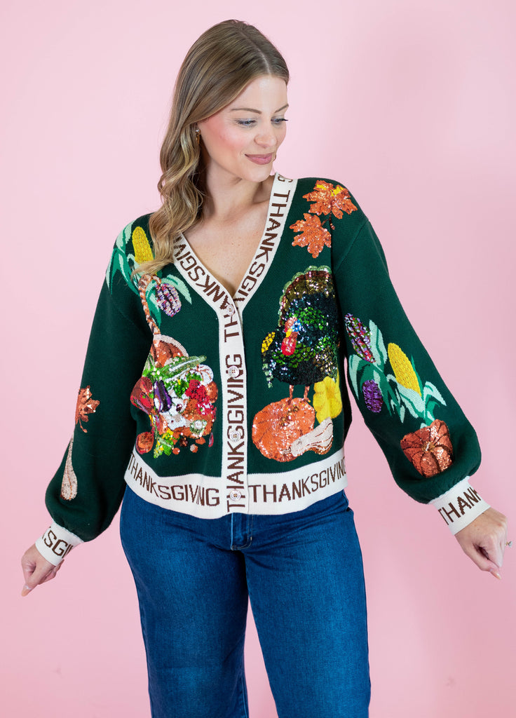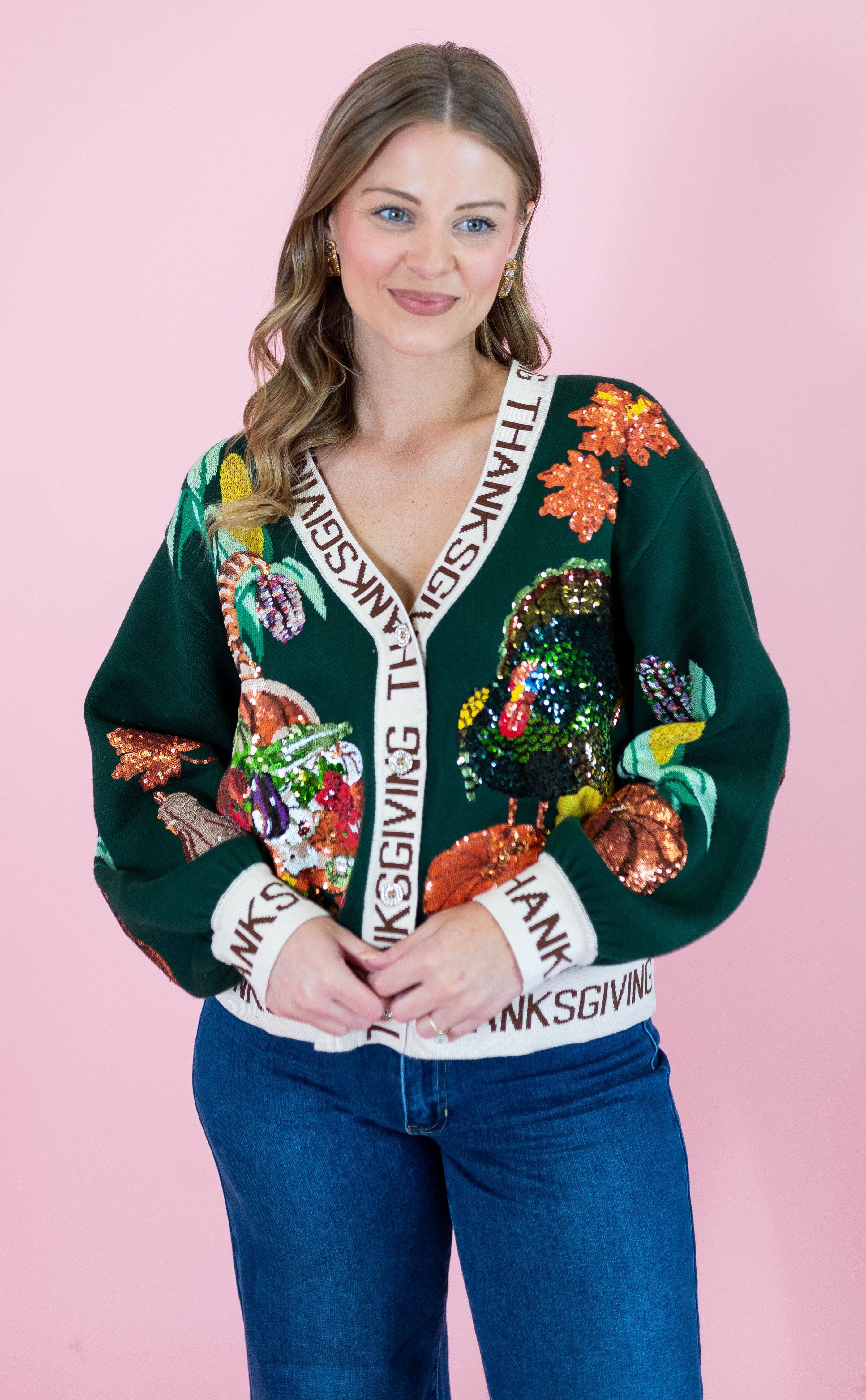 Queen Of Sparkles: Dark Green Thanksgiving Button Cardigan
