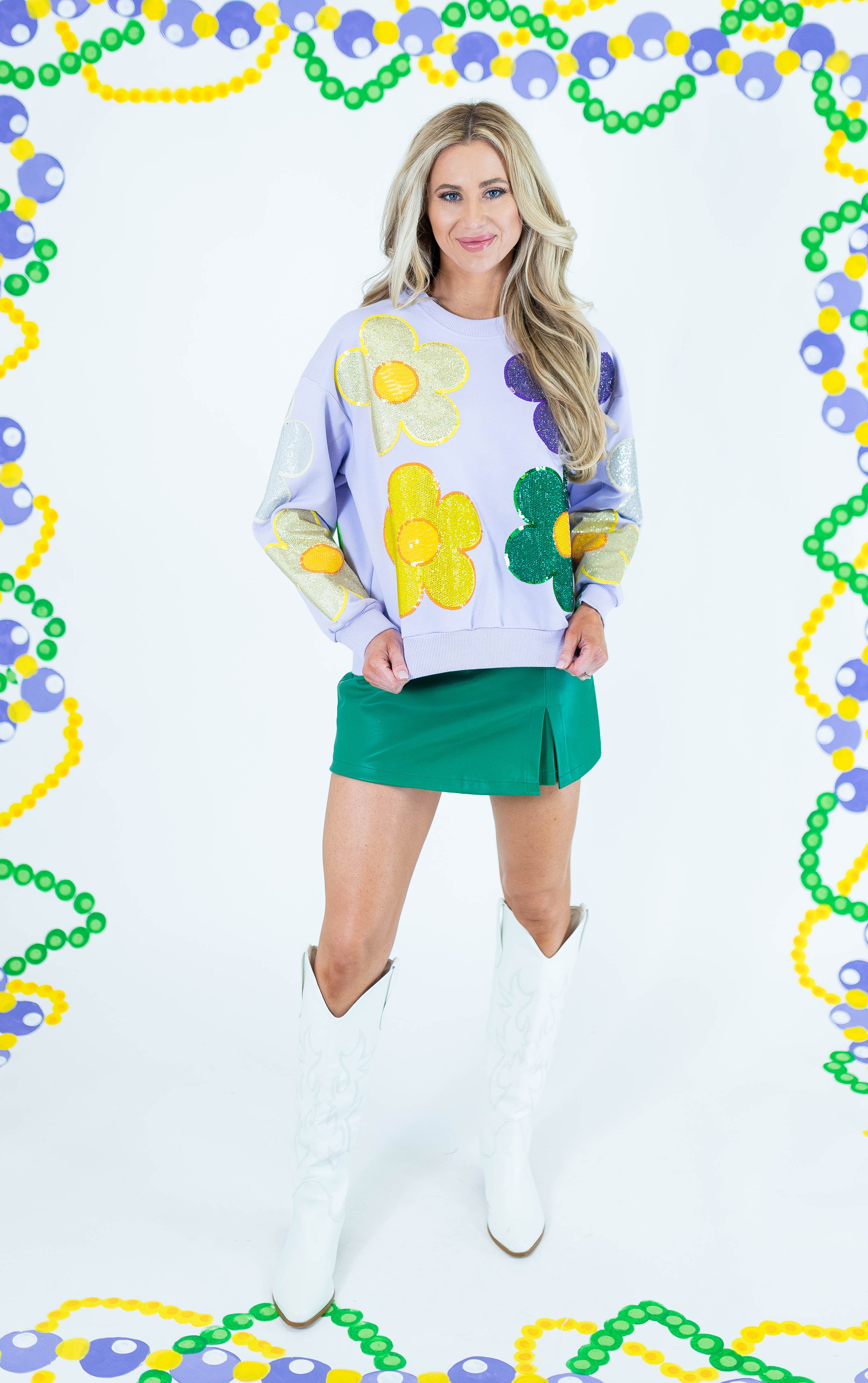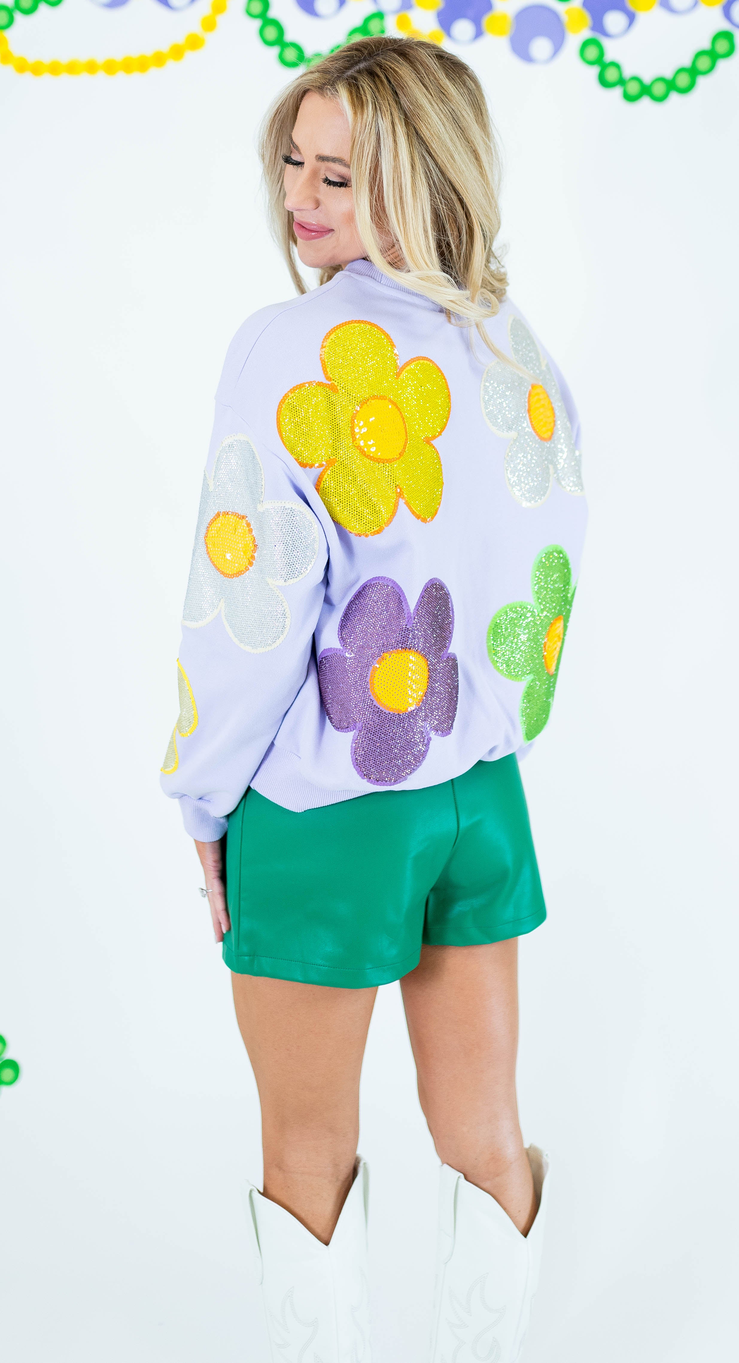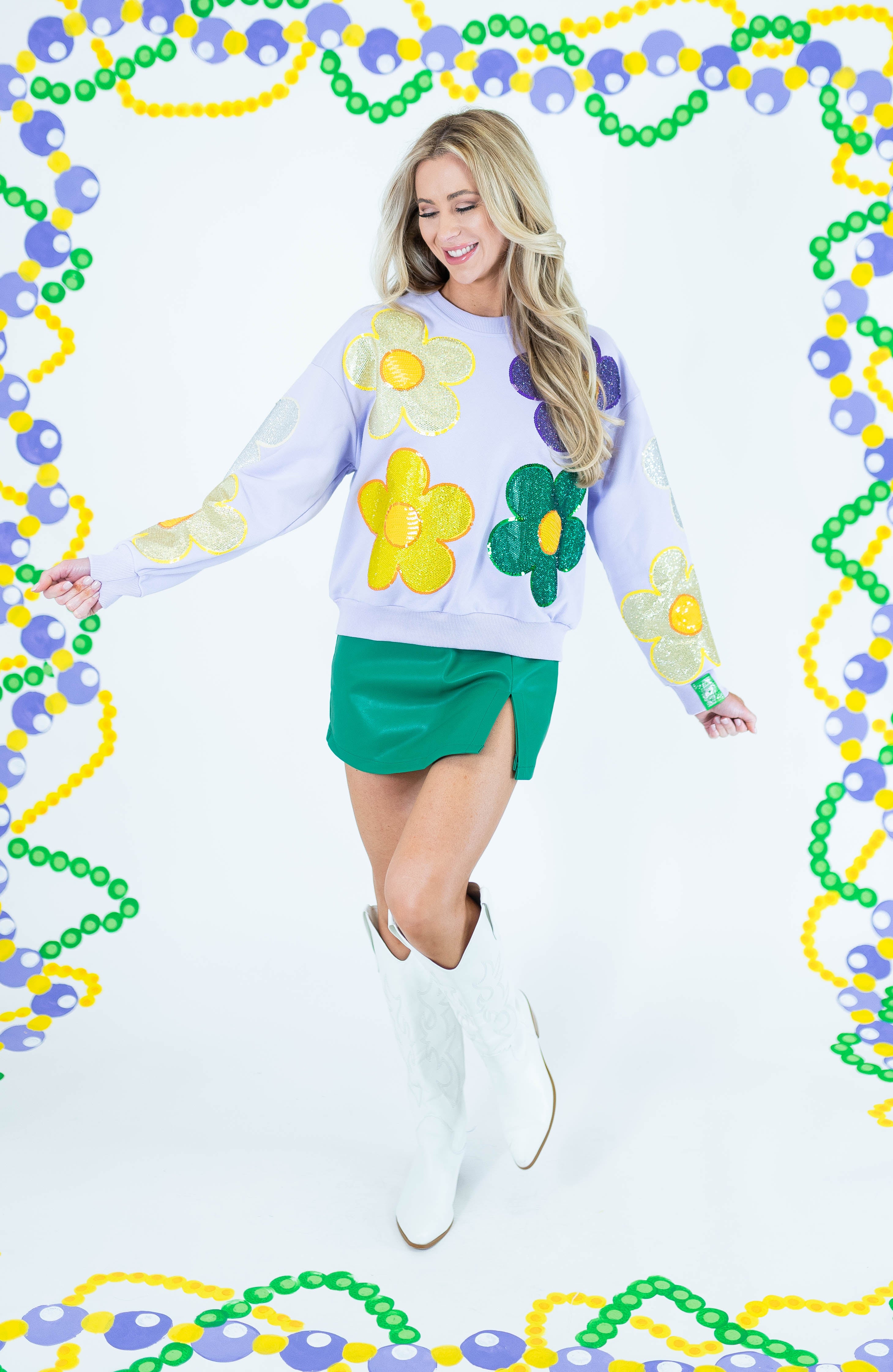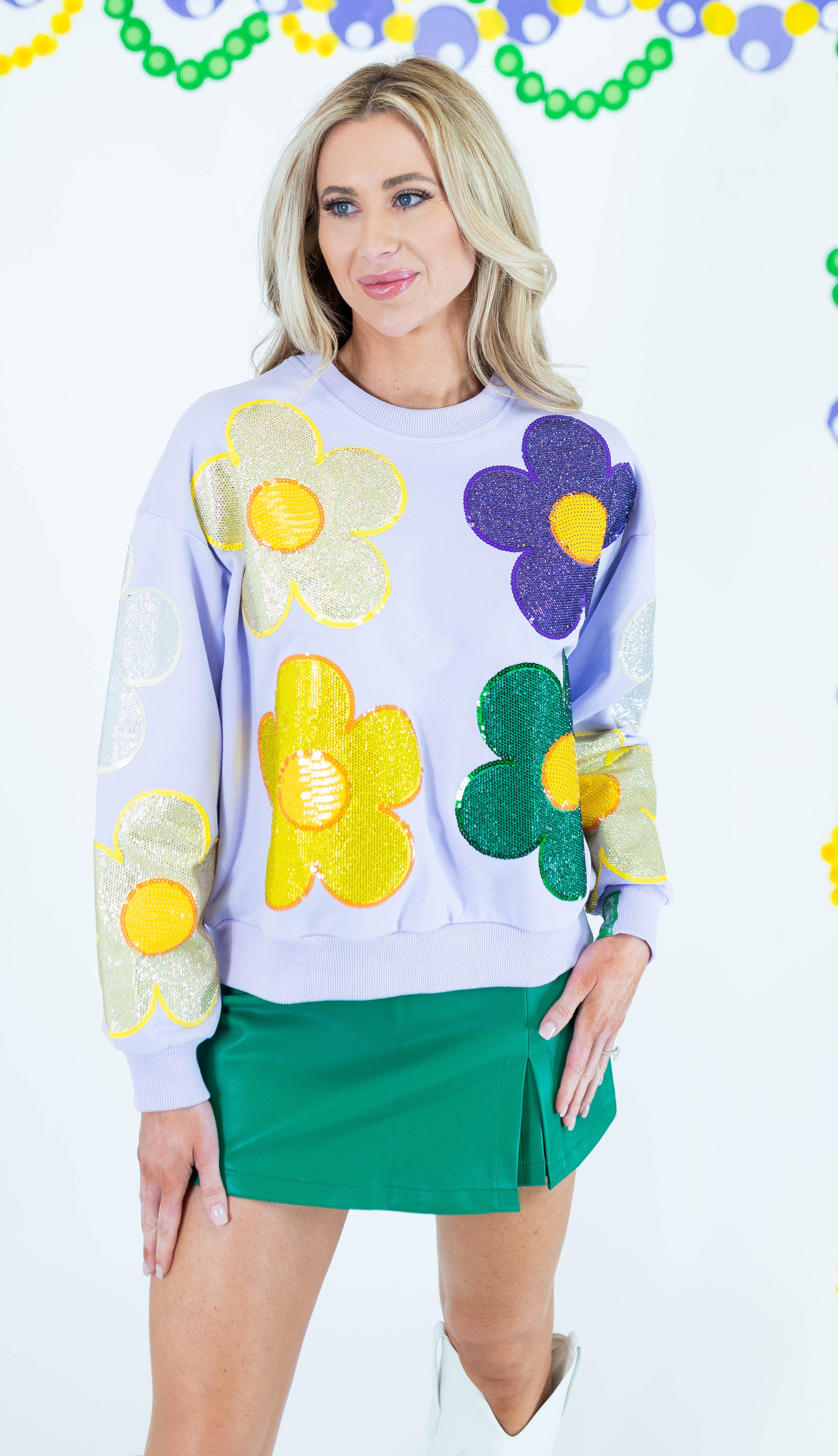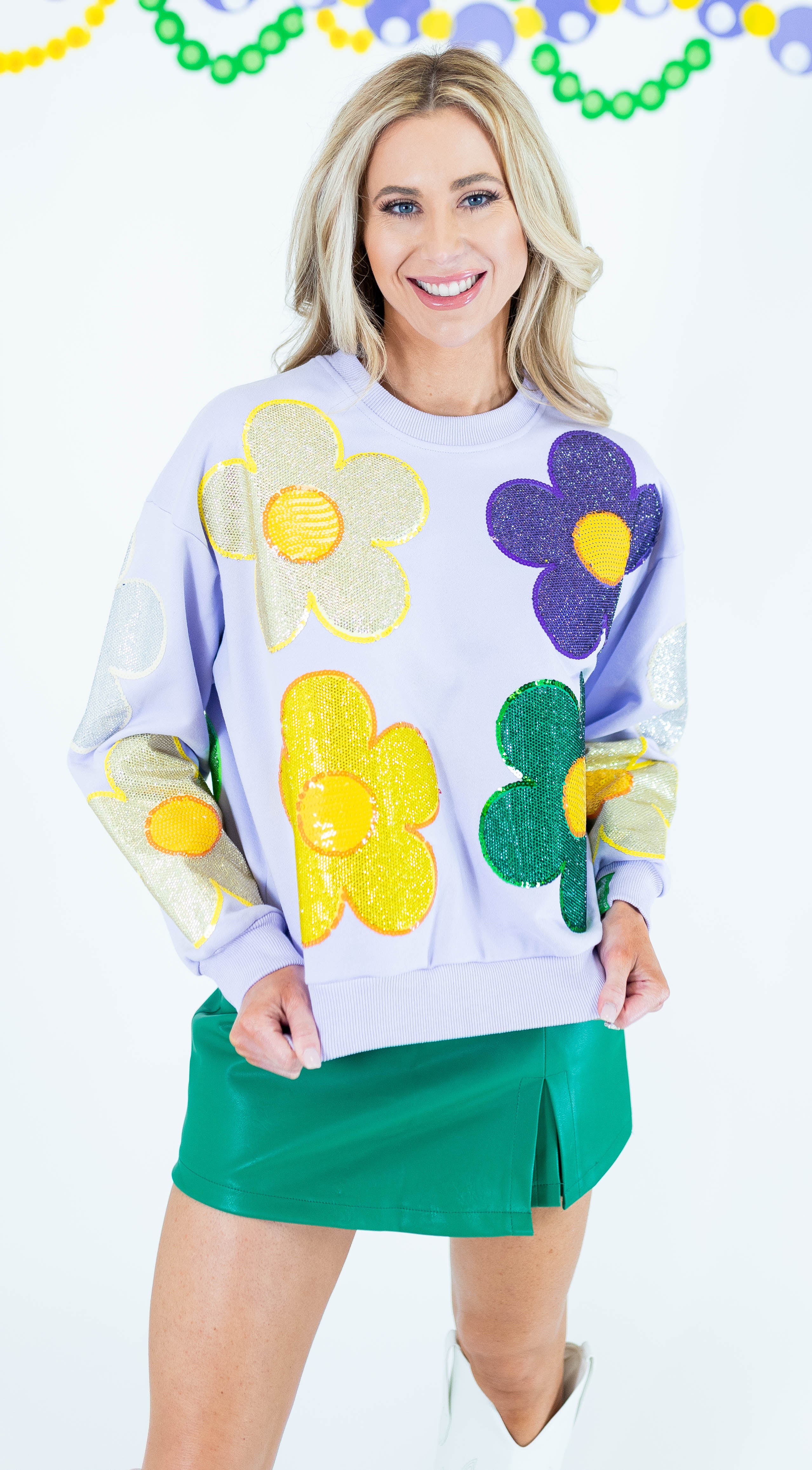 Make a statement with this Queen Of Sparkles oversized sweatshirt, featuring eye-catching rhinestone flowers in vibrant Mardi Gras hues accented with lavender. The generous fit and sparkling embellishments create an effortlessly bold look perfect for standing out at festivals, parties, or casual outings. Crafted for comfort and style, this piece transforms an everyday sweatshirt into a conversation-starting wardrobe essential that celebrates your love of glamour and self-expression.