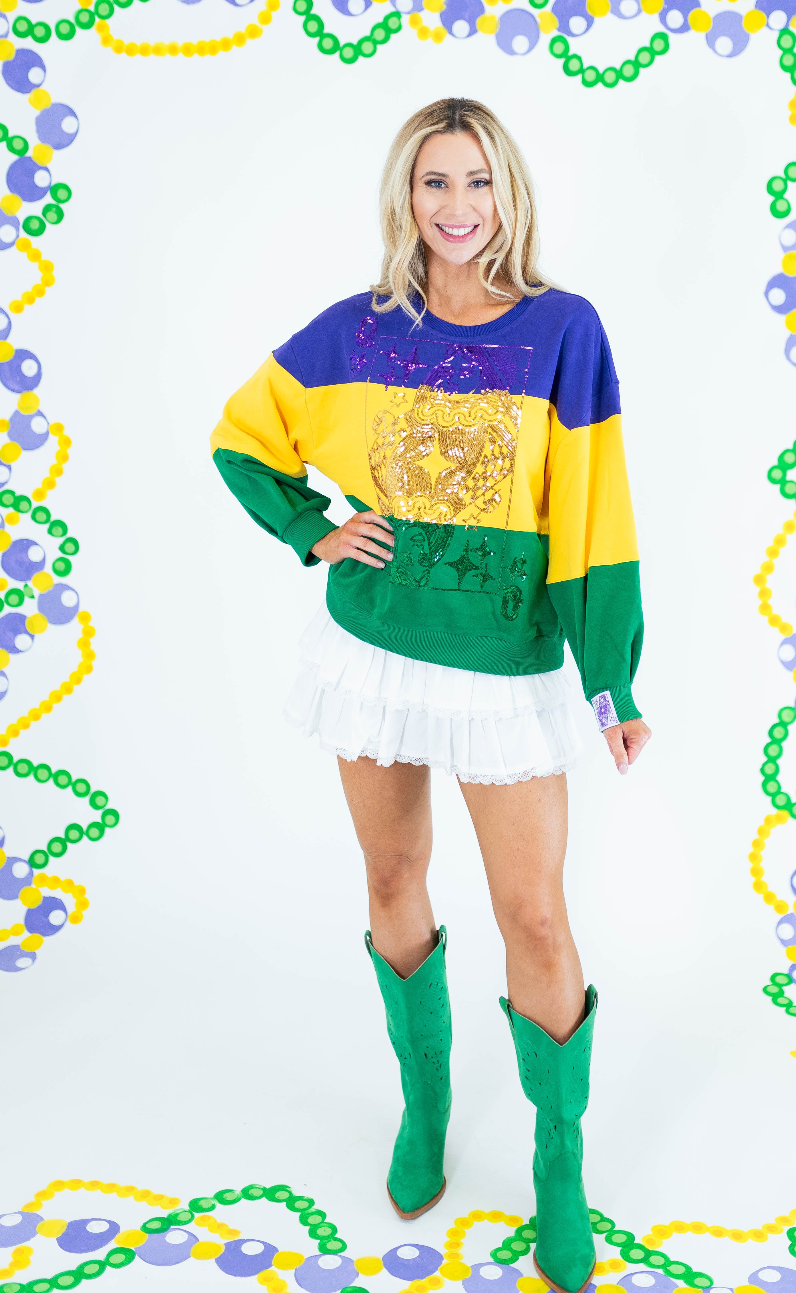 Elevate your Mardi Gras celebration with this striking Queen Of Sparkles sweatshirt, featuring bold striped detailing and a regal queen card motif. Crafted for comfort without compromising style, this piece seamlessly transitions from festive gatherings to everyday wear. The sophisticated design captures the essence of New Orleans glamour while maintaining a wearable elegance. Perfect for those who appreciate statement pieces that blend playful spirit with refined aesthetics.